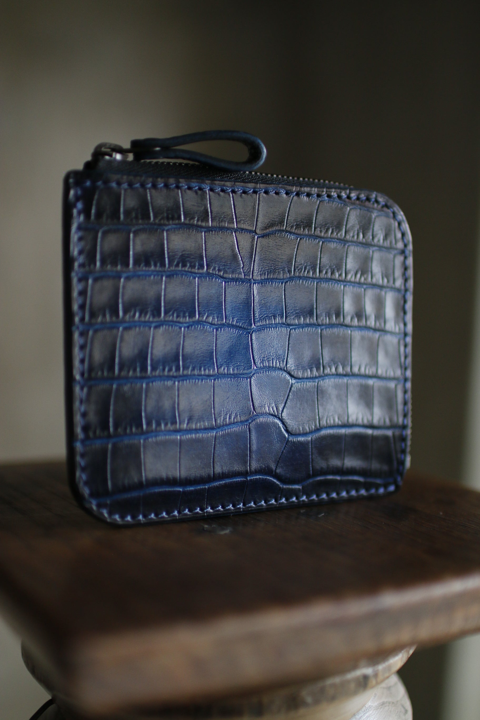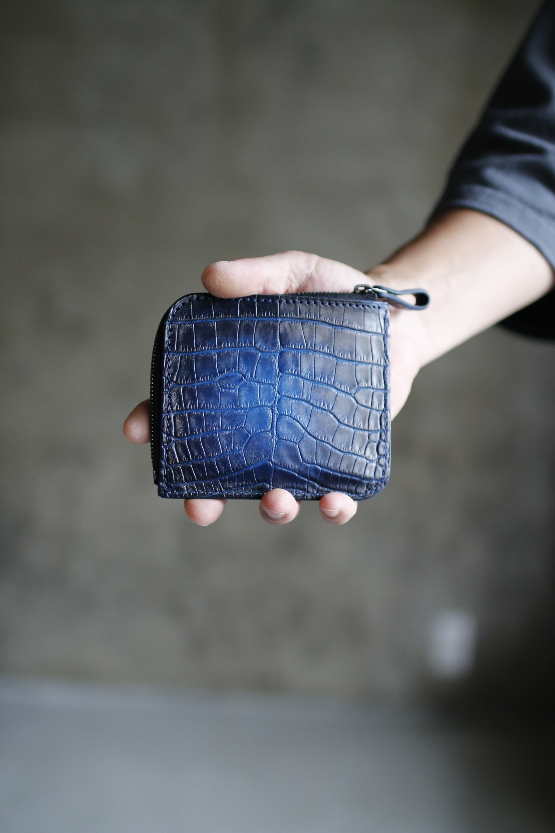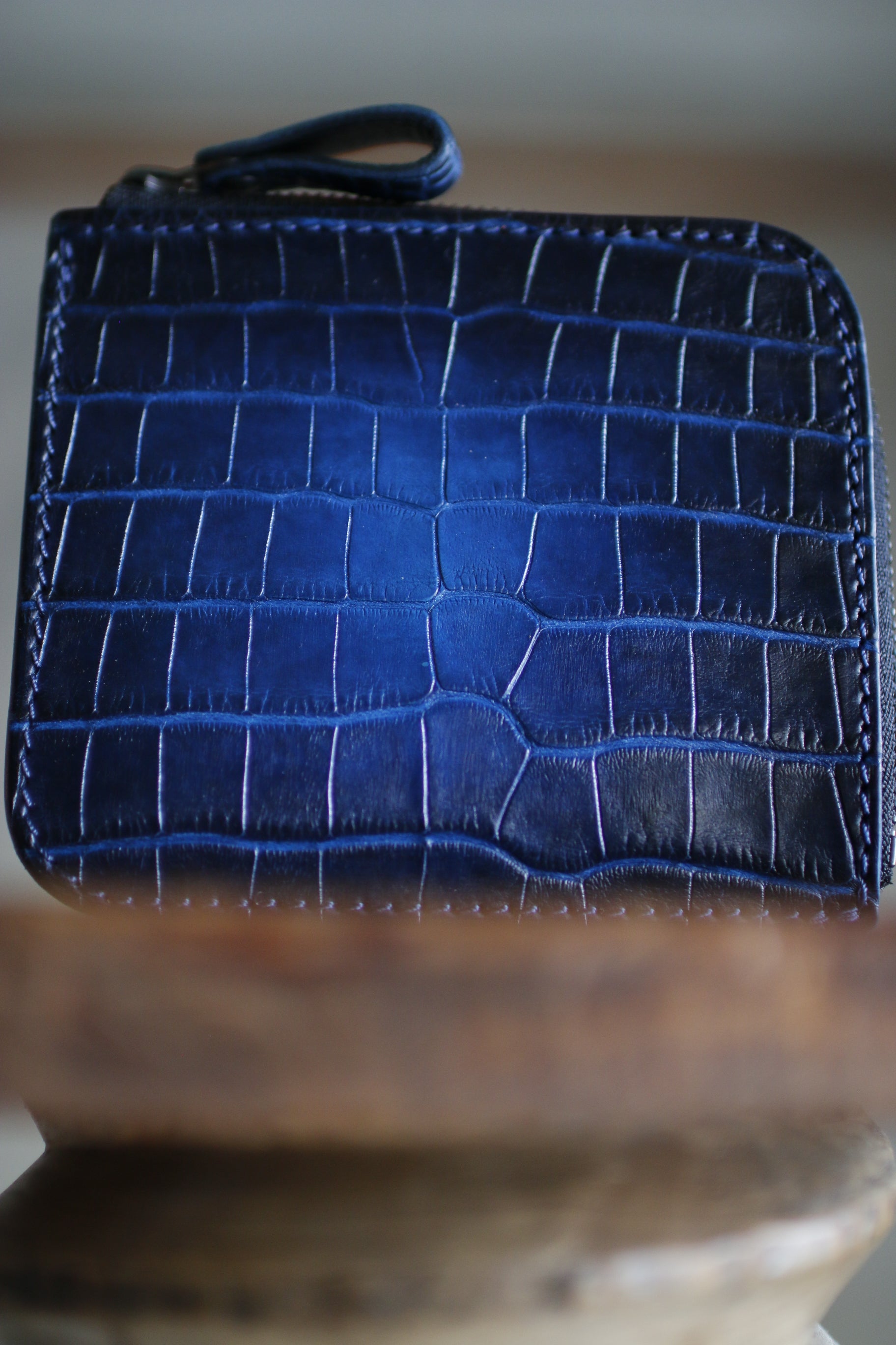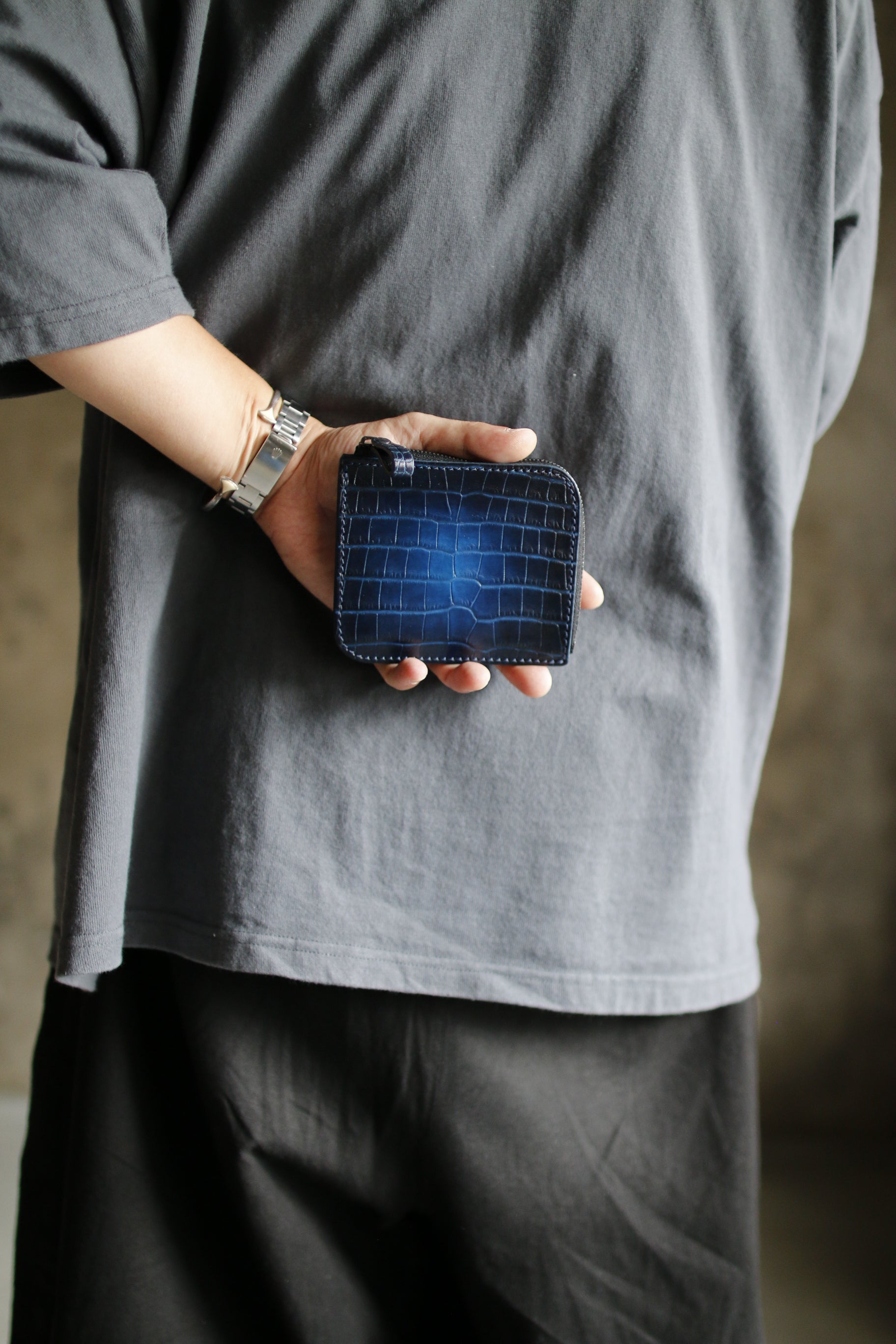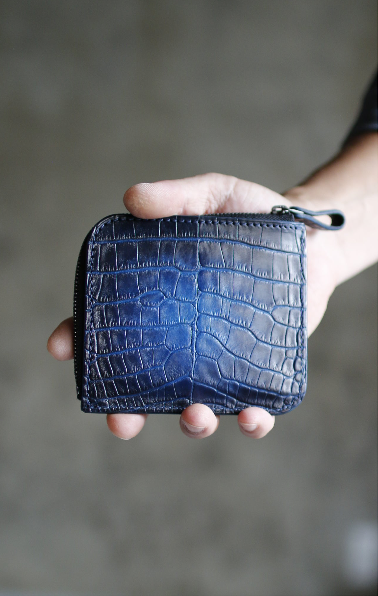 アリゲーターレザーをハンドダイネイビーブルーで仕上げたL字型コンパクト財布。