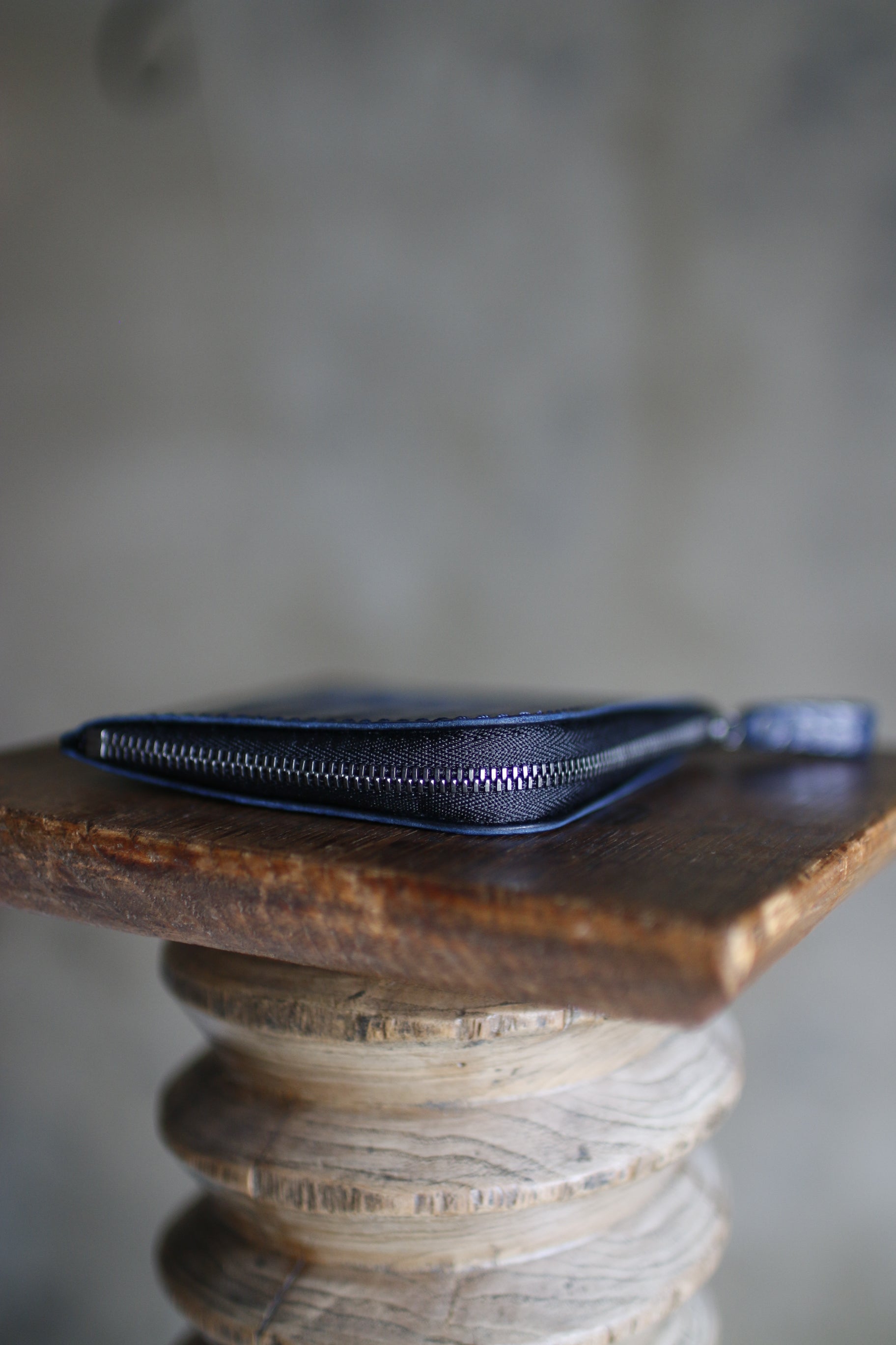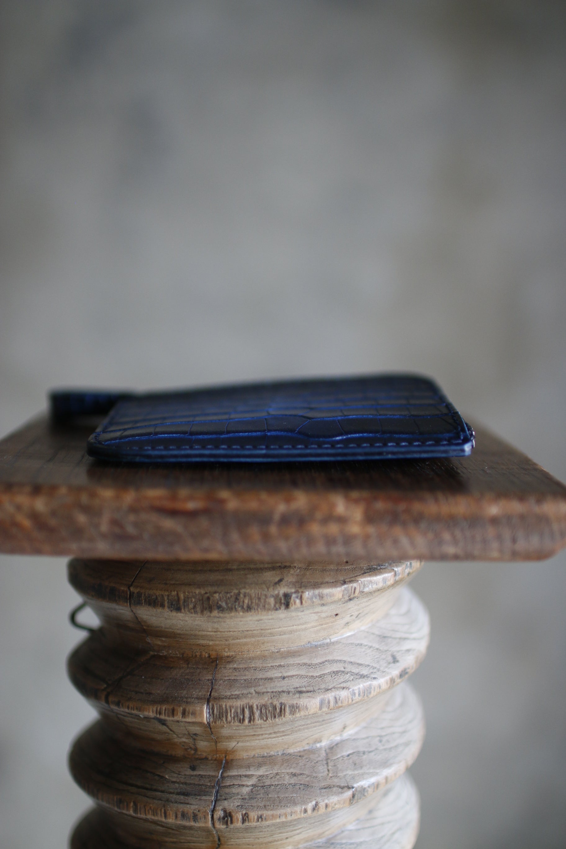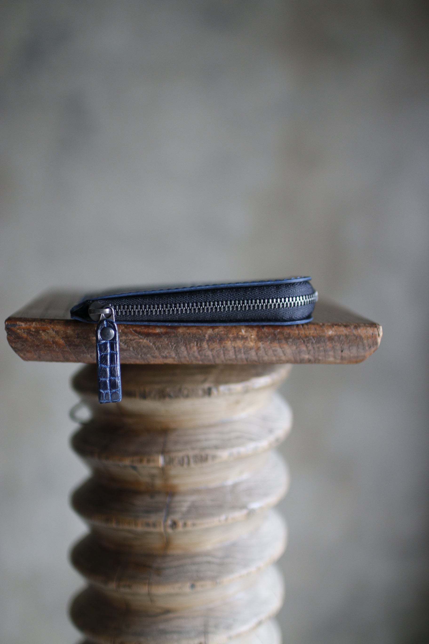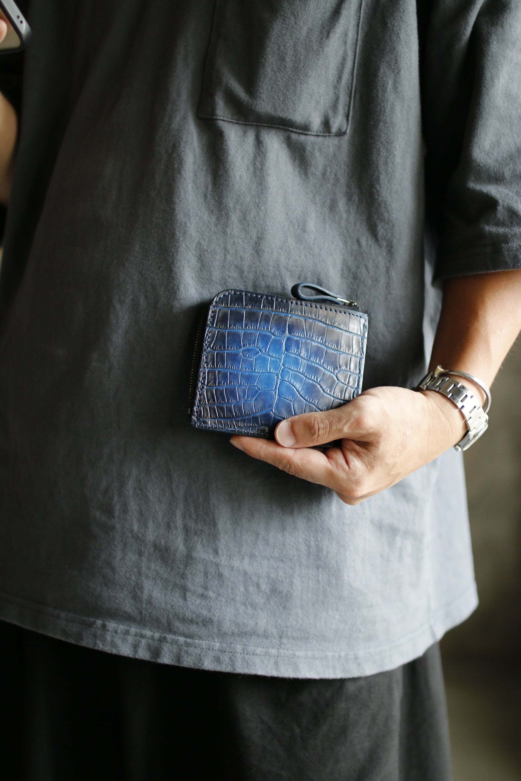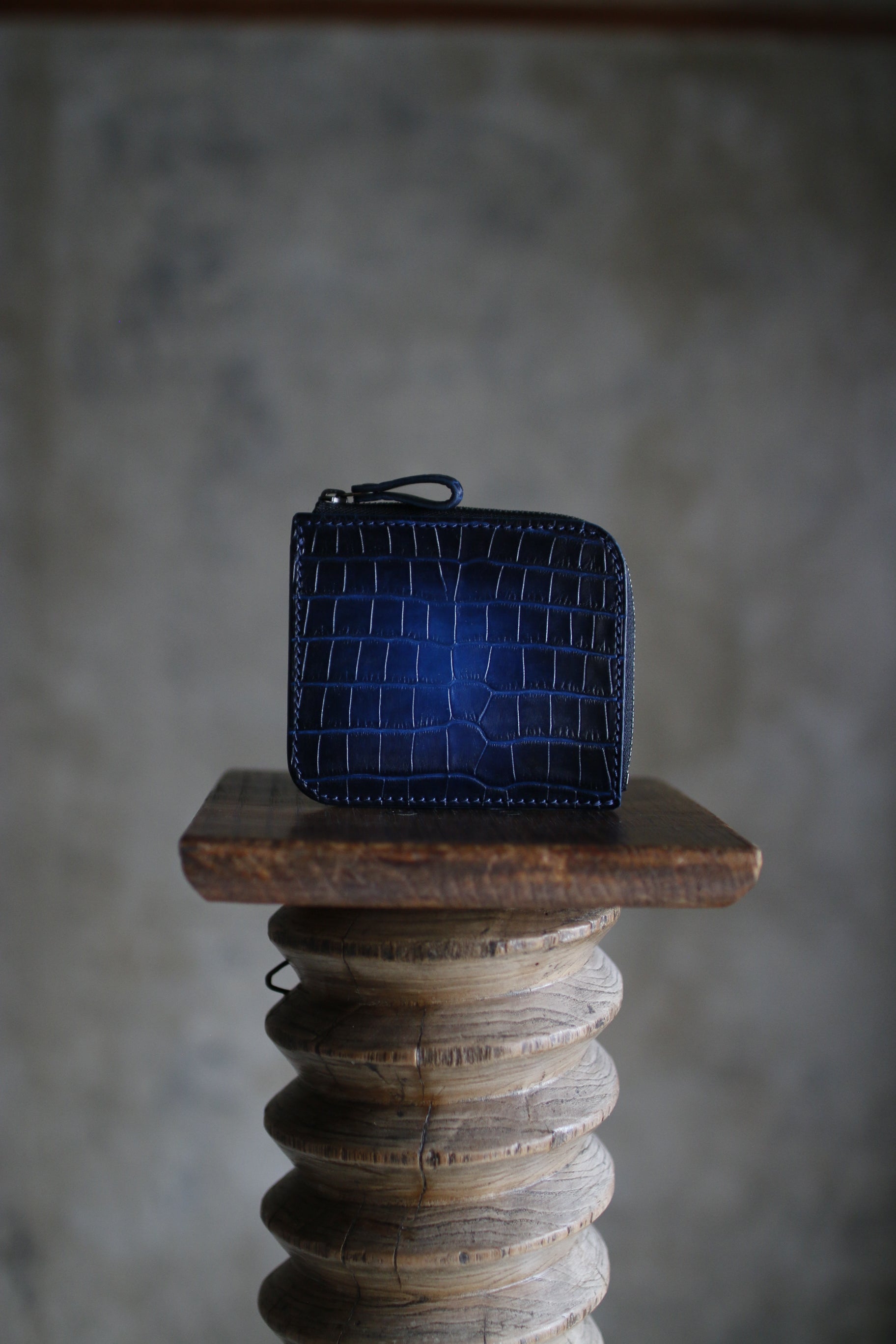 アリゲーターレザーをハンドダイネイビーブルーで仕上げたL字型コンパクト財布。