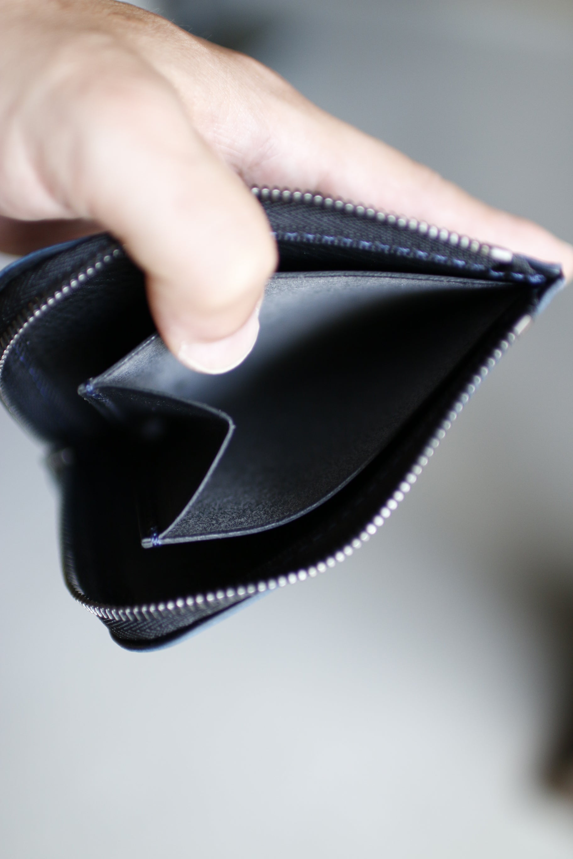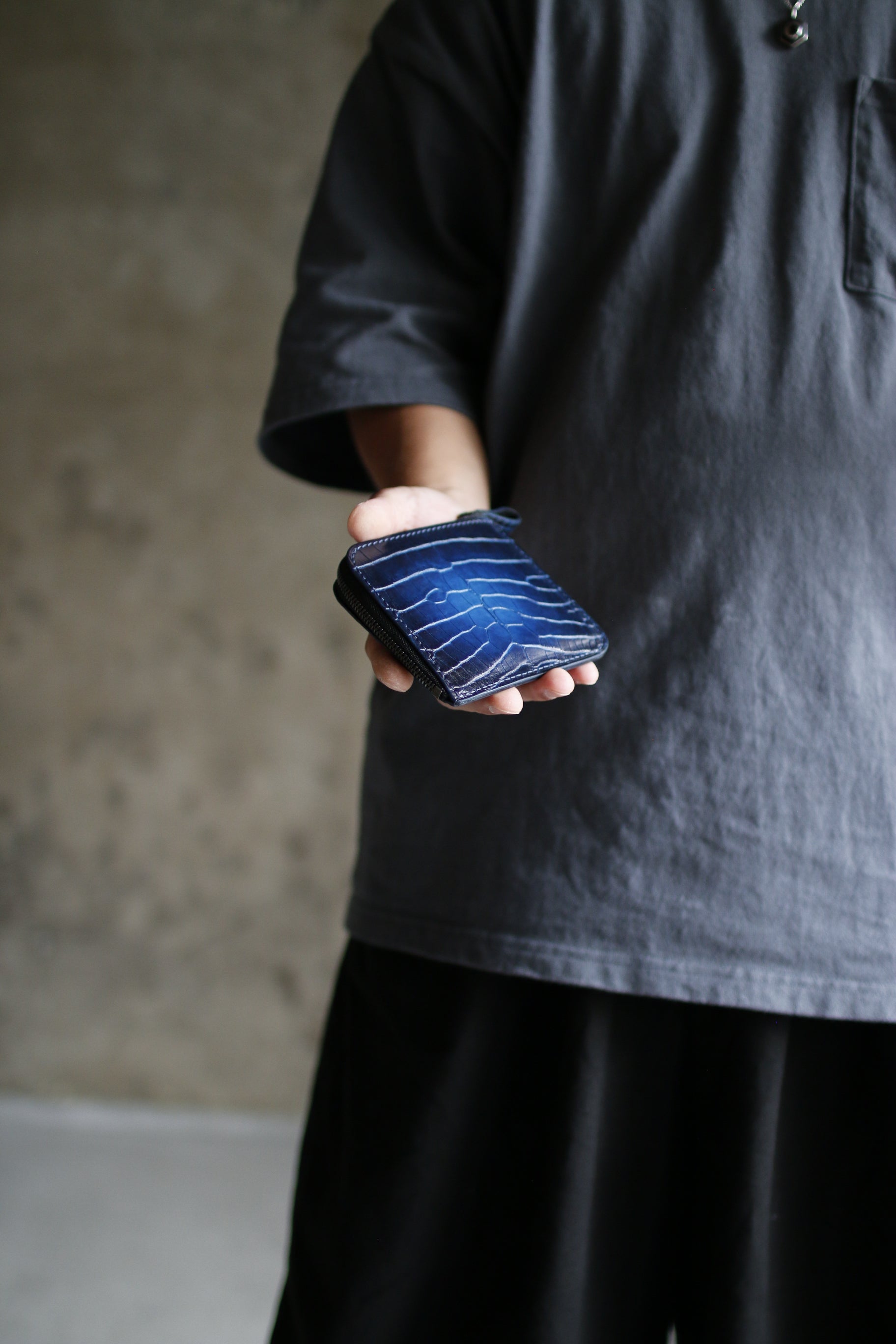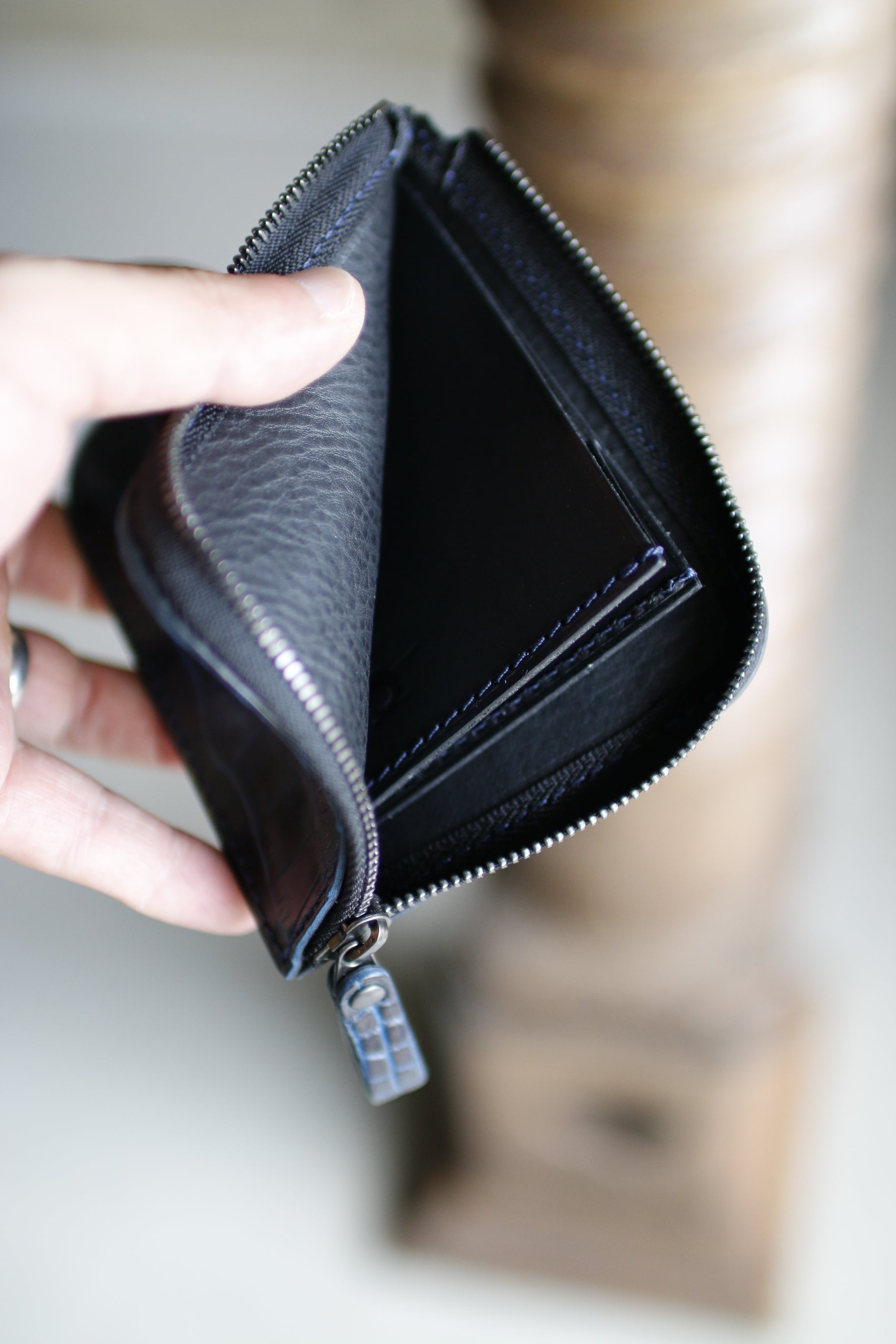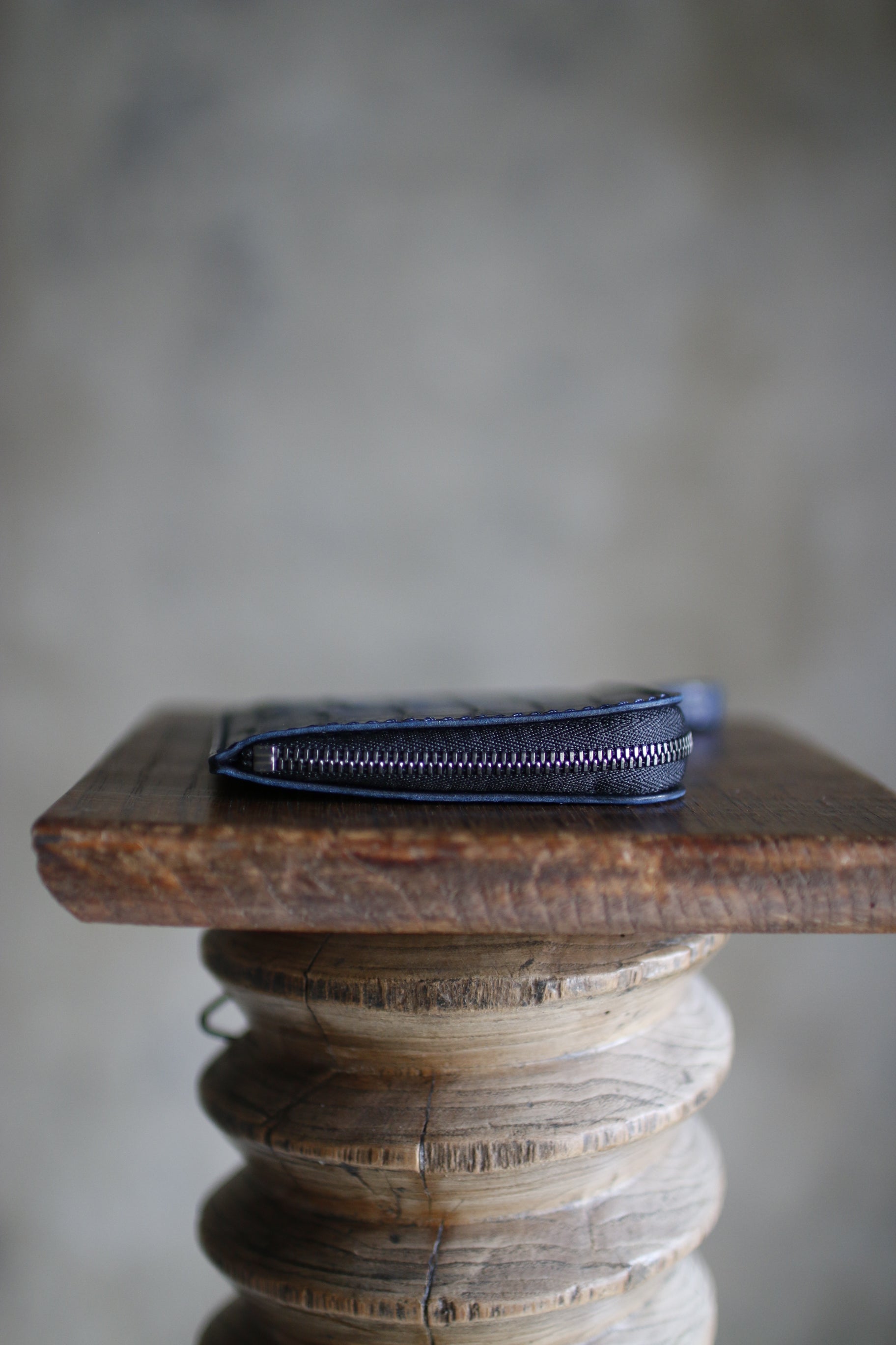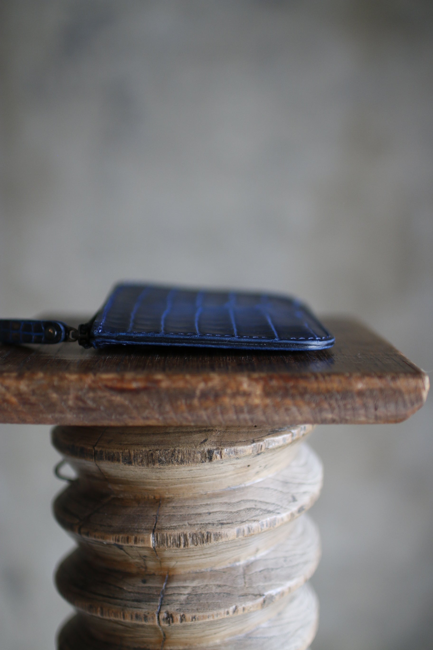 アリゲーターレザーをハンドダイネイビーブルーで仕上げたL字型コンパクト財布。