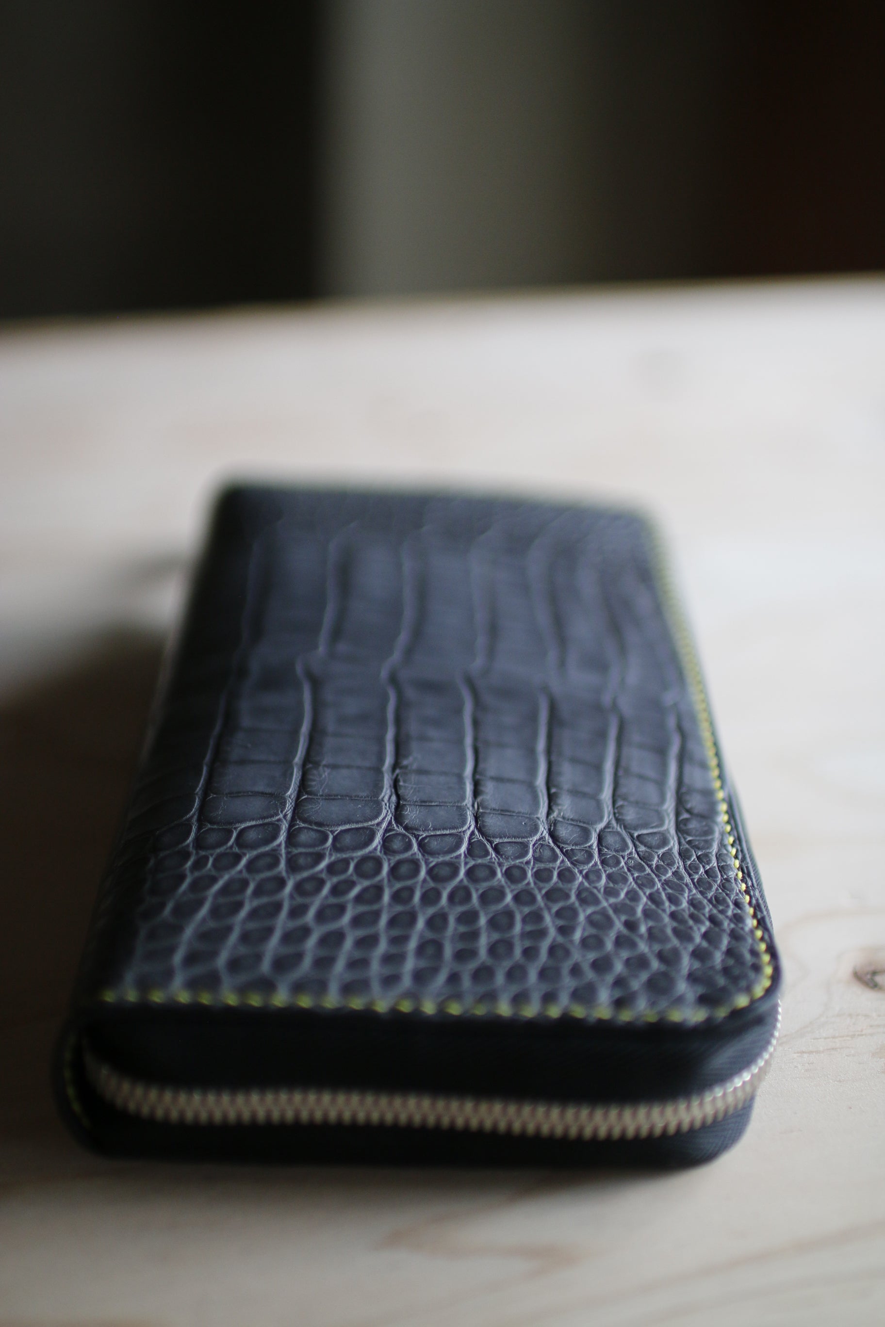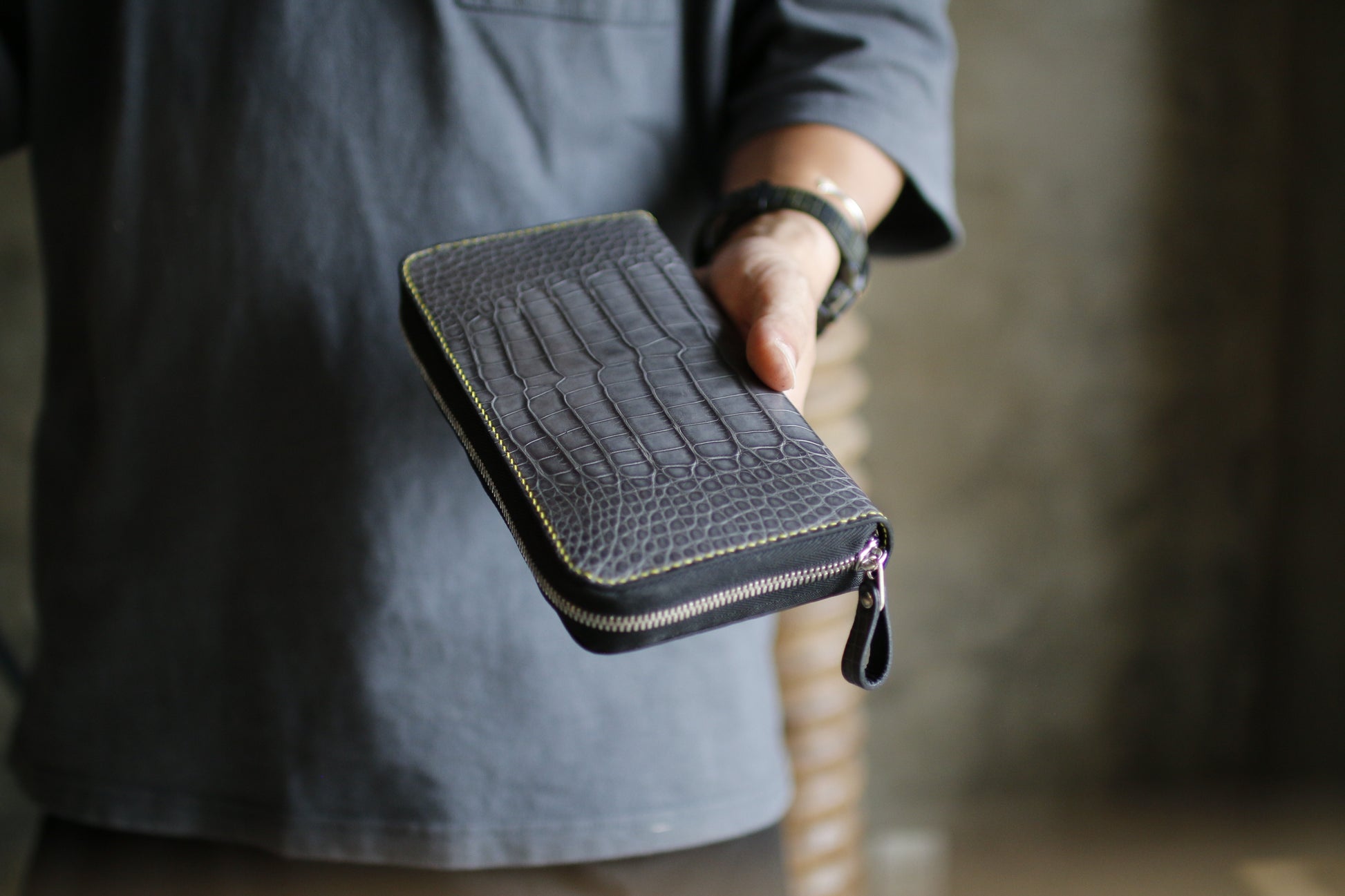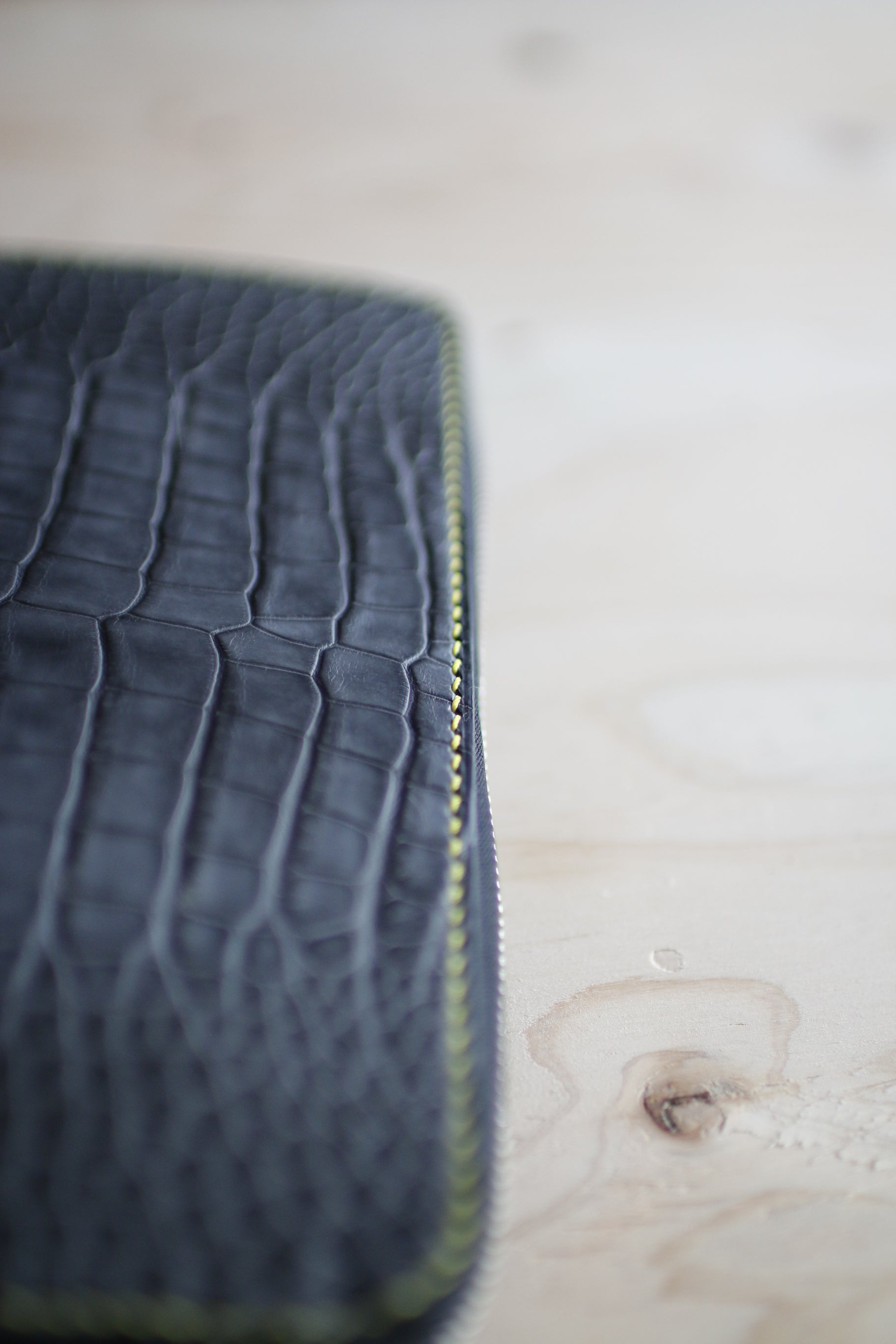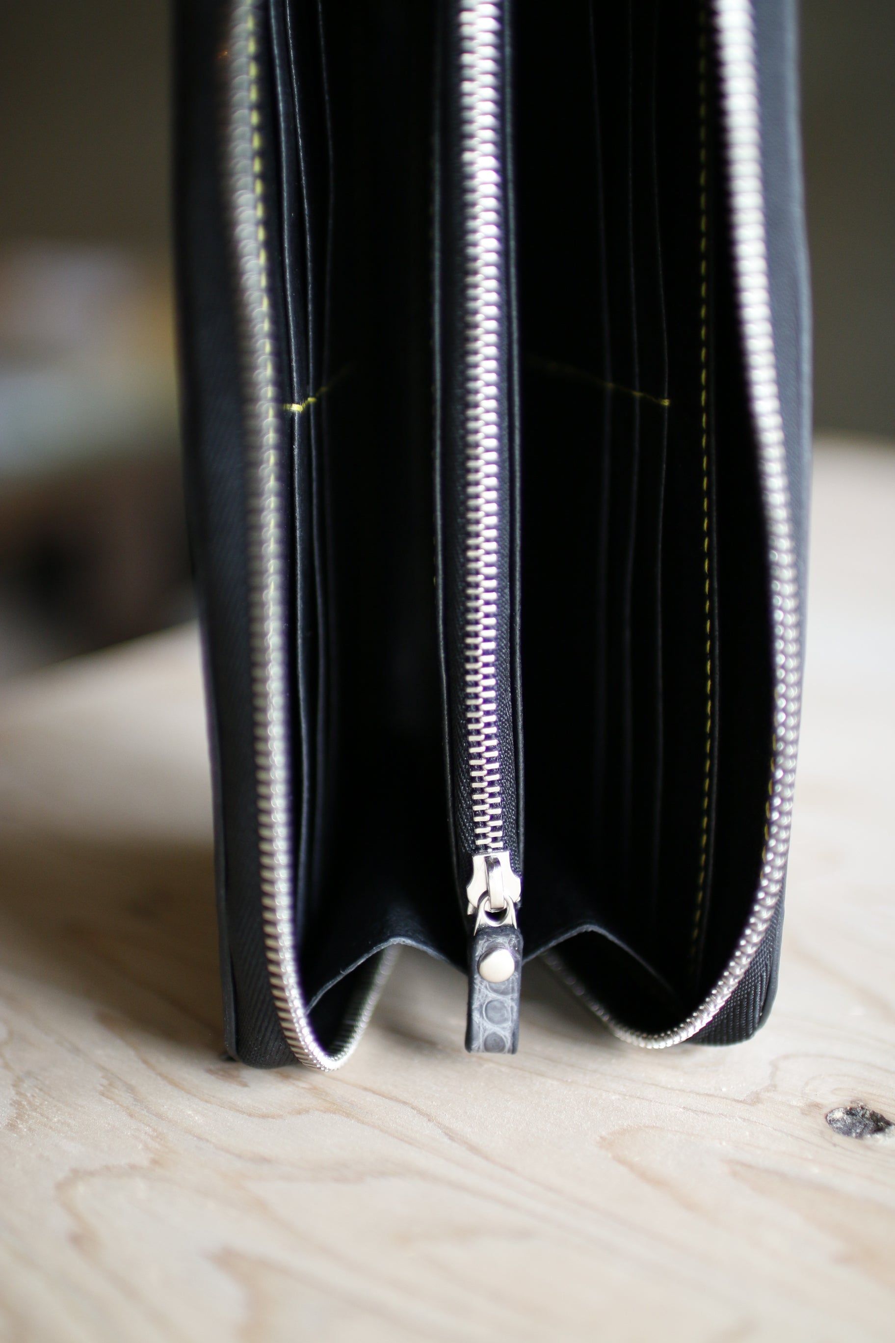 墨黒仕上げのアリゲーターオーガナイザー長財布。