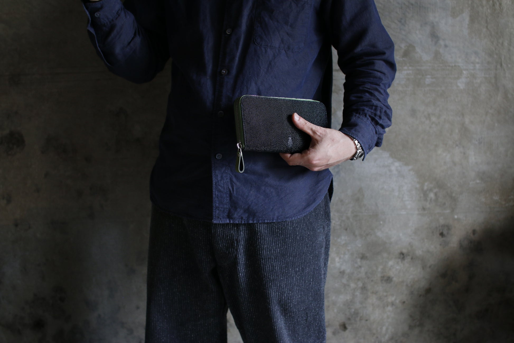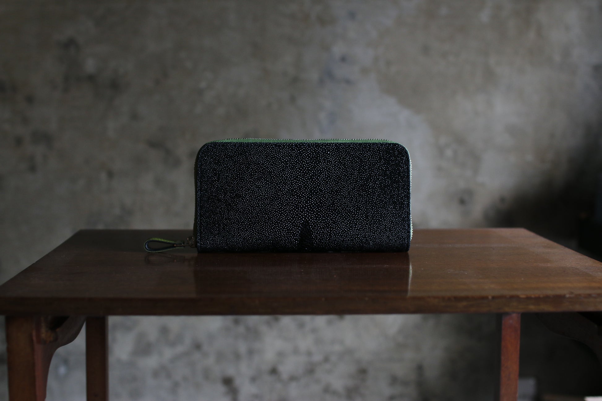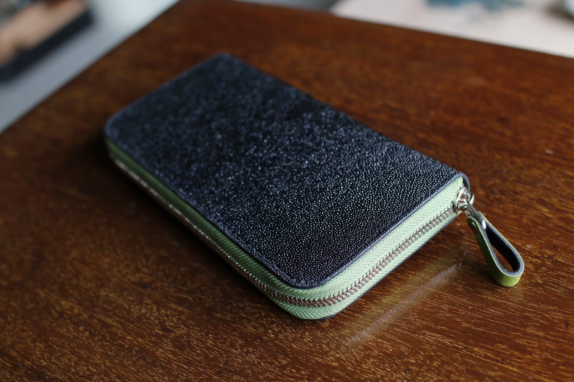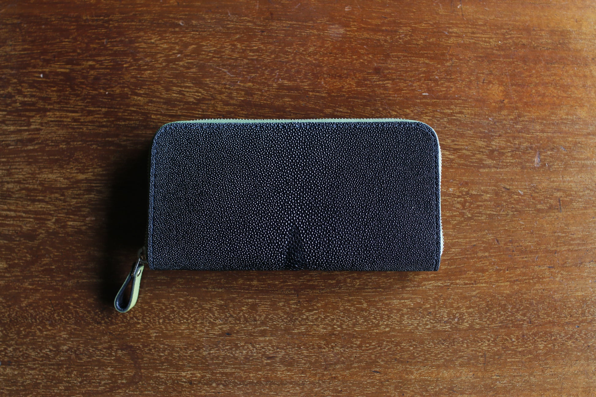 ガルーシャレザーの総手縫いラウンドZIP長財布。