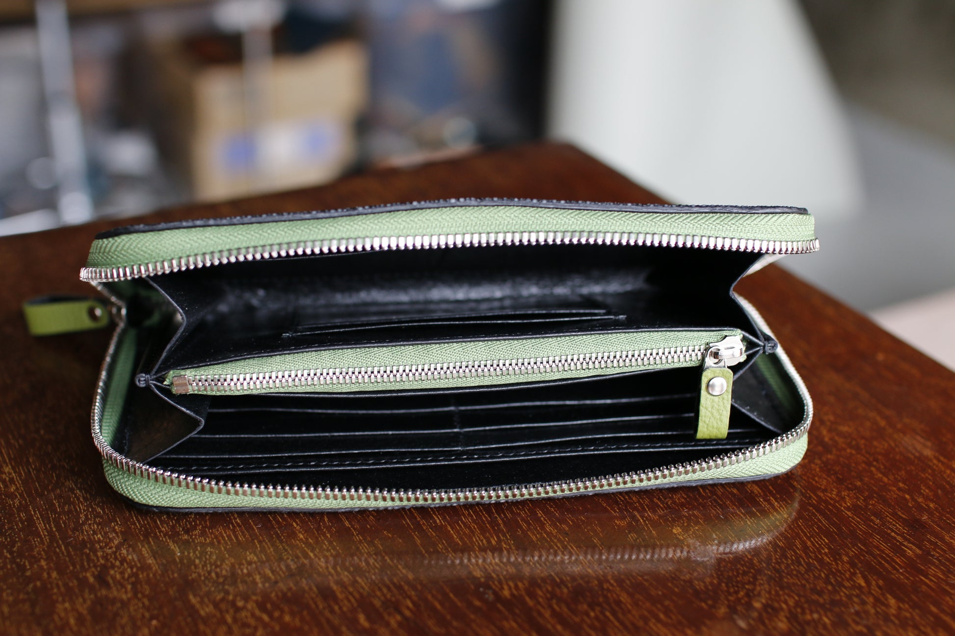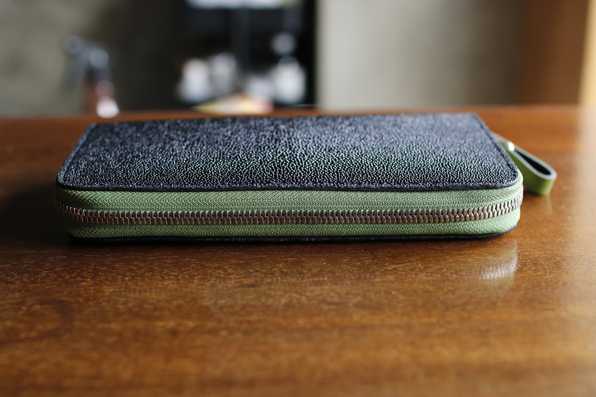 【オーダー】ガルーシャ総手縫いラウンドZIP長財布(ブラック×ライムグリーン)