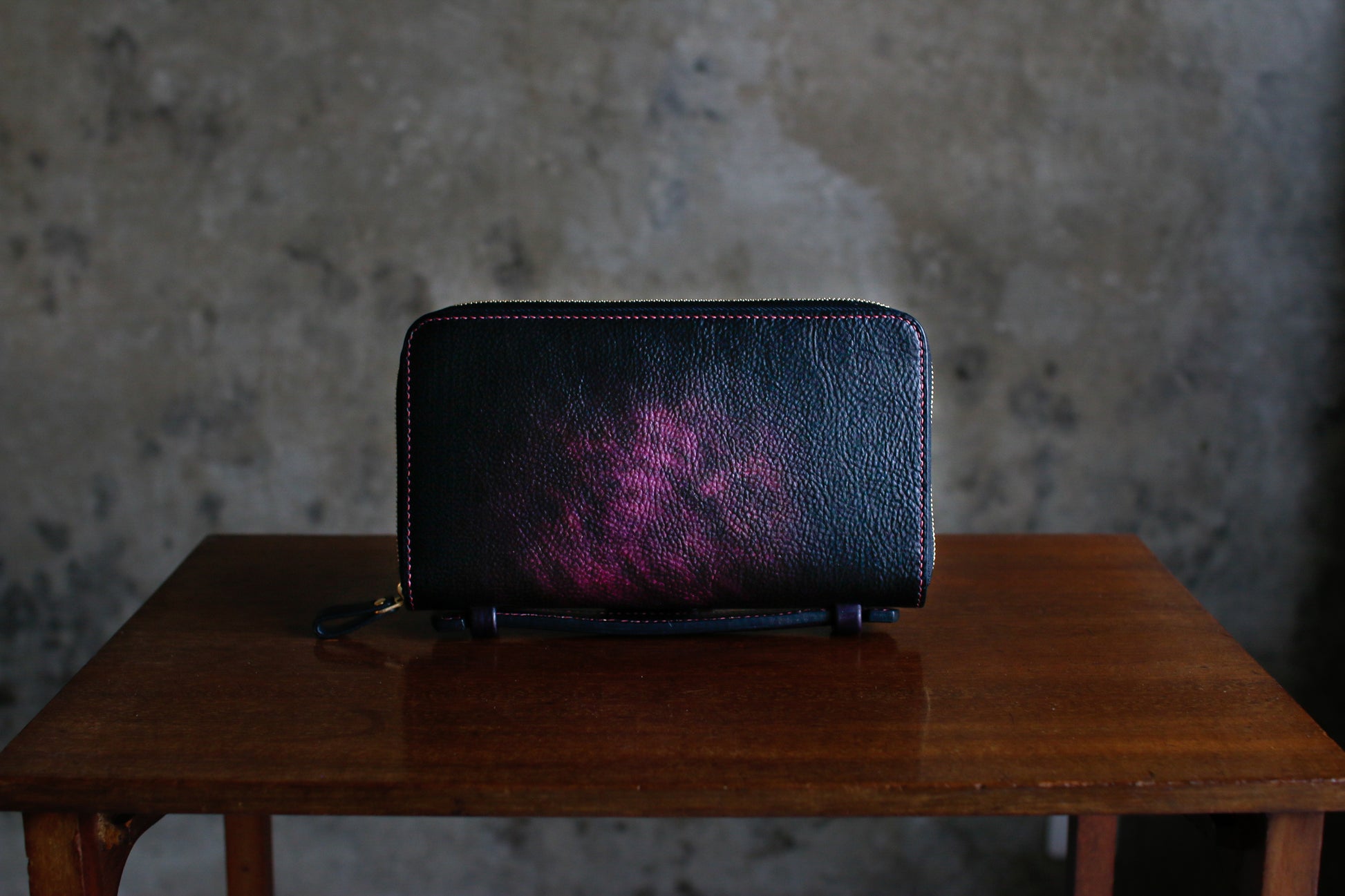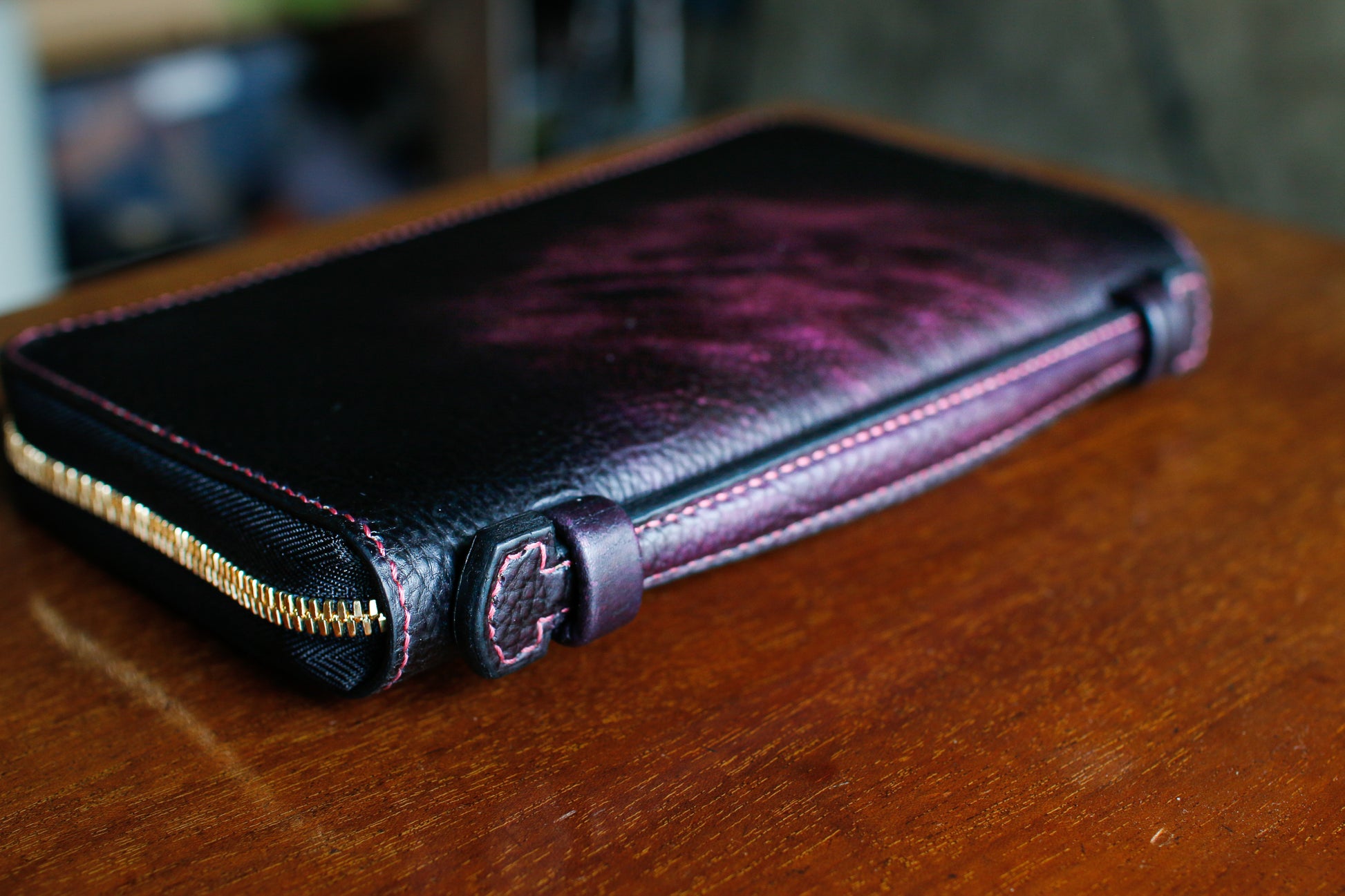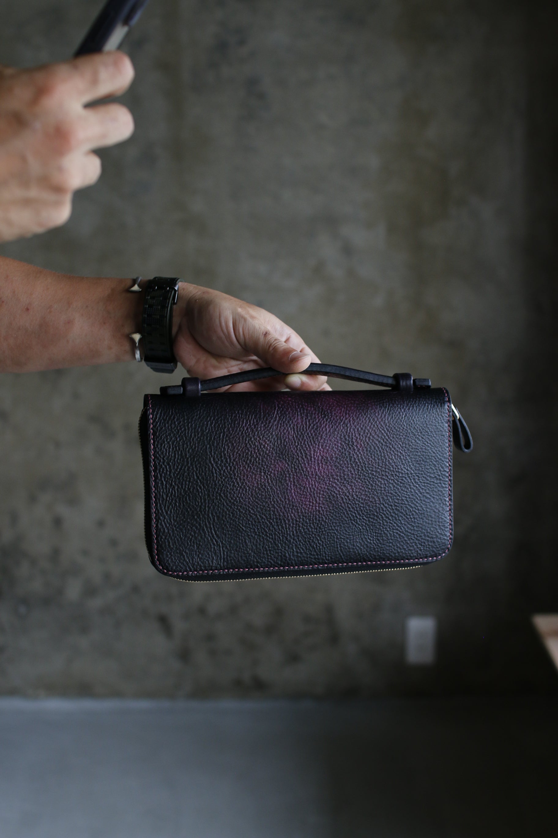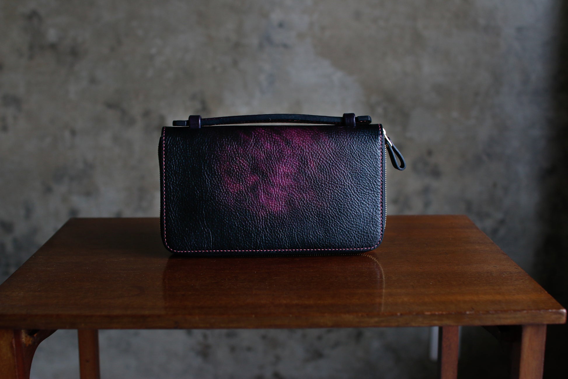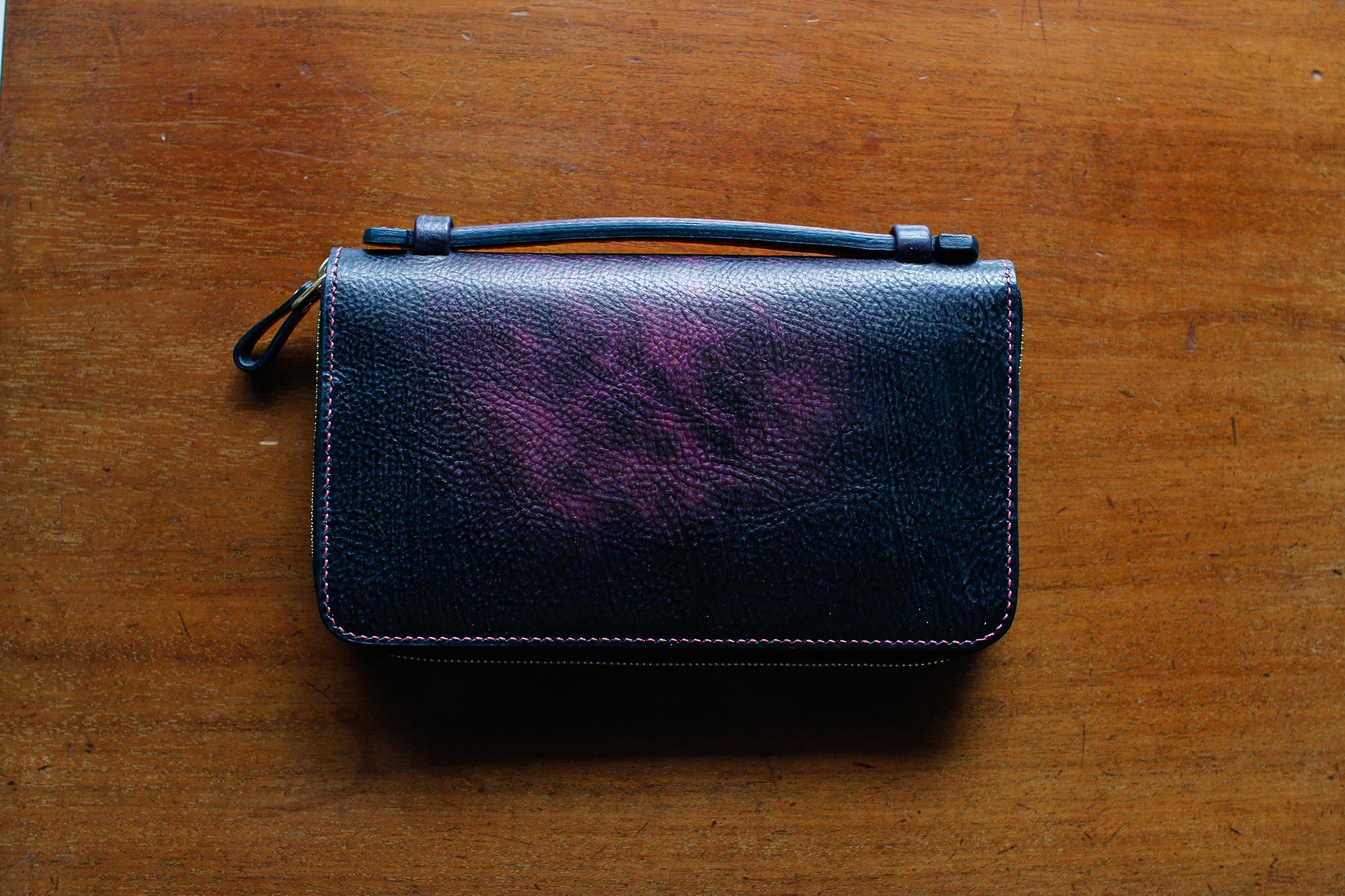 ハンドダイのパープルが惹き込まれる総手縫いオーガナイザー財布。