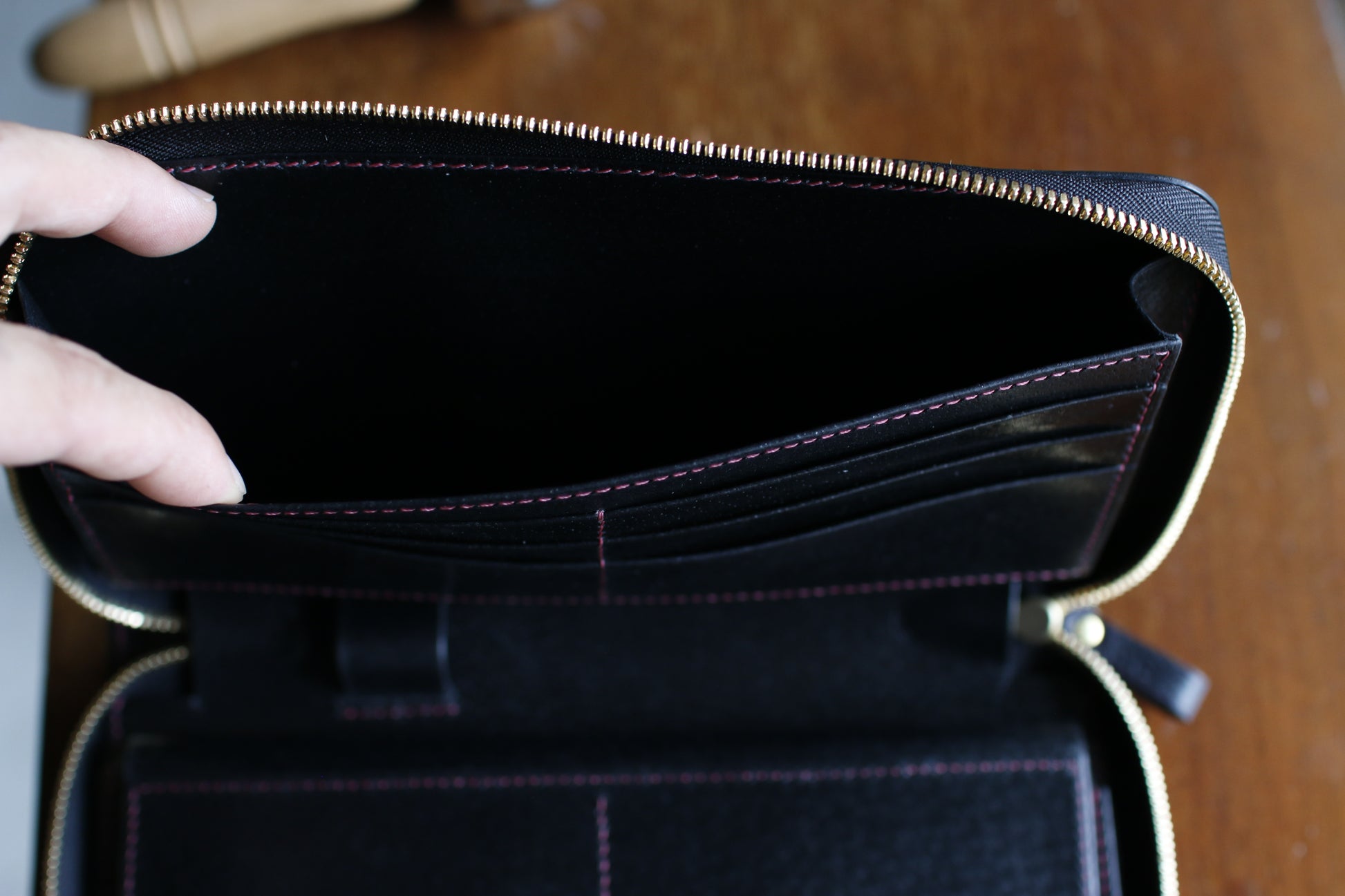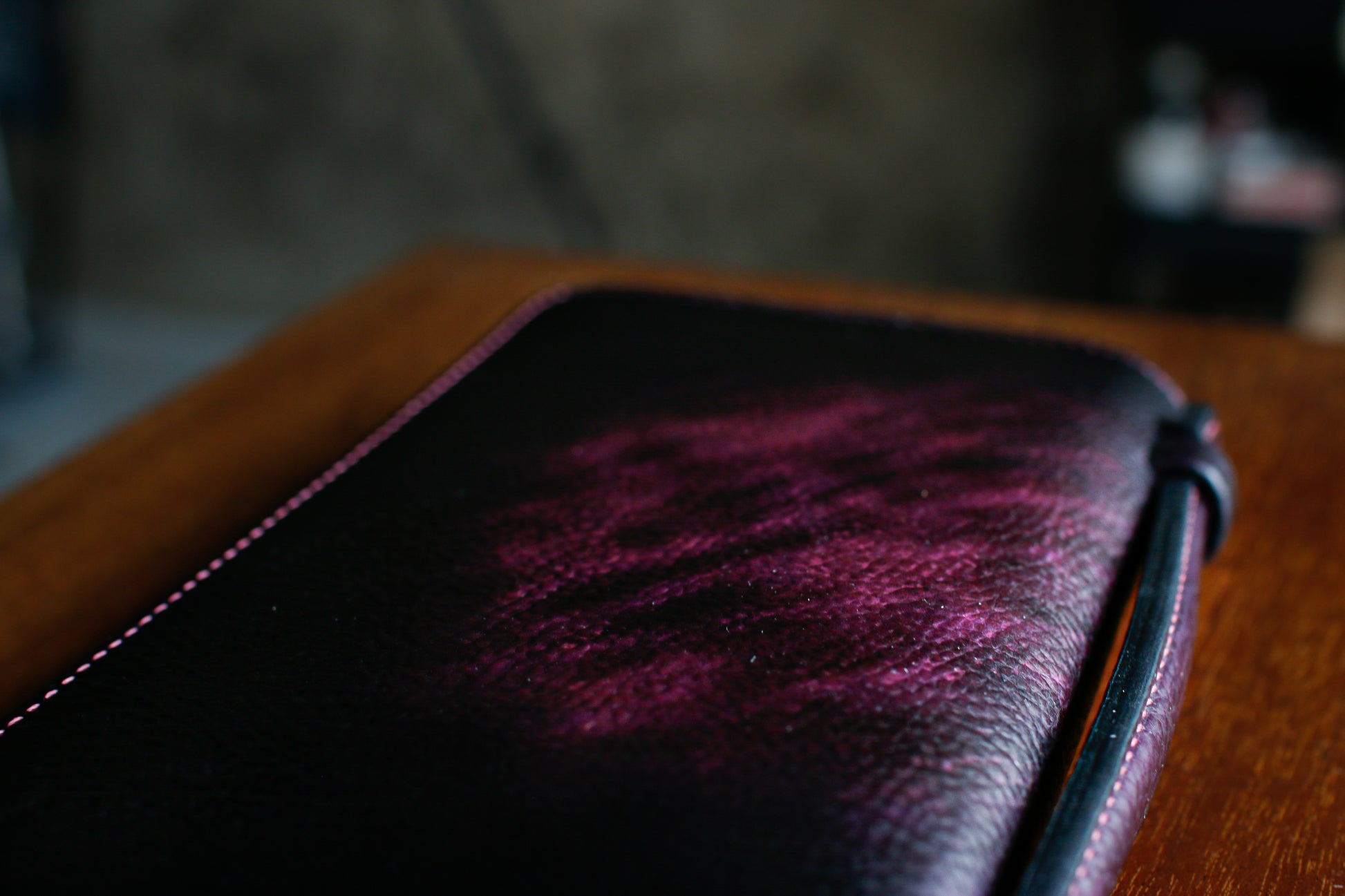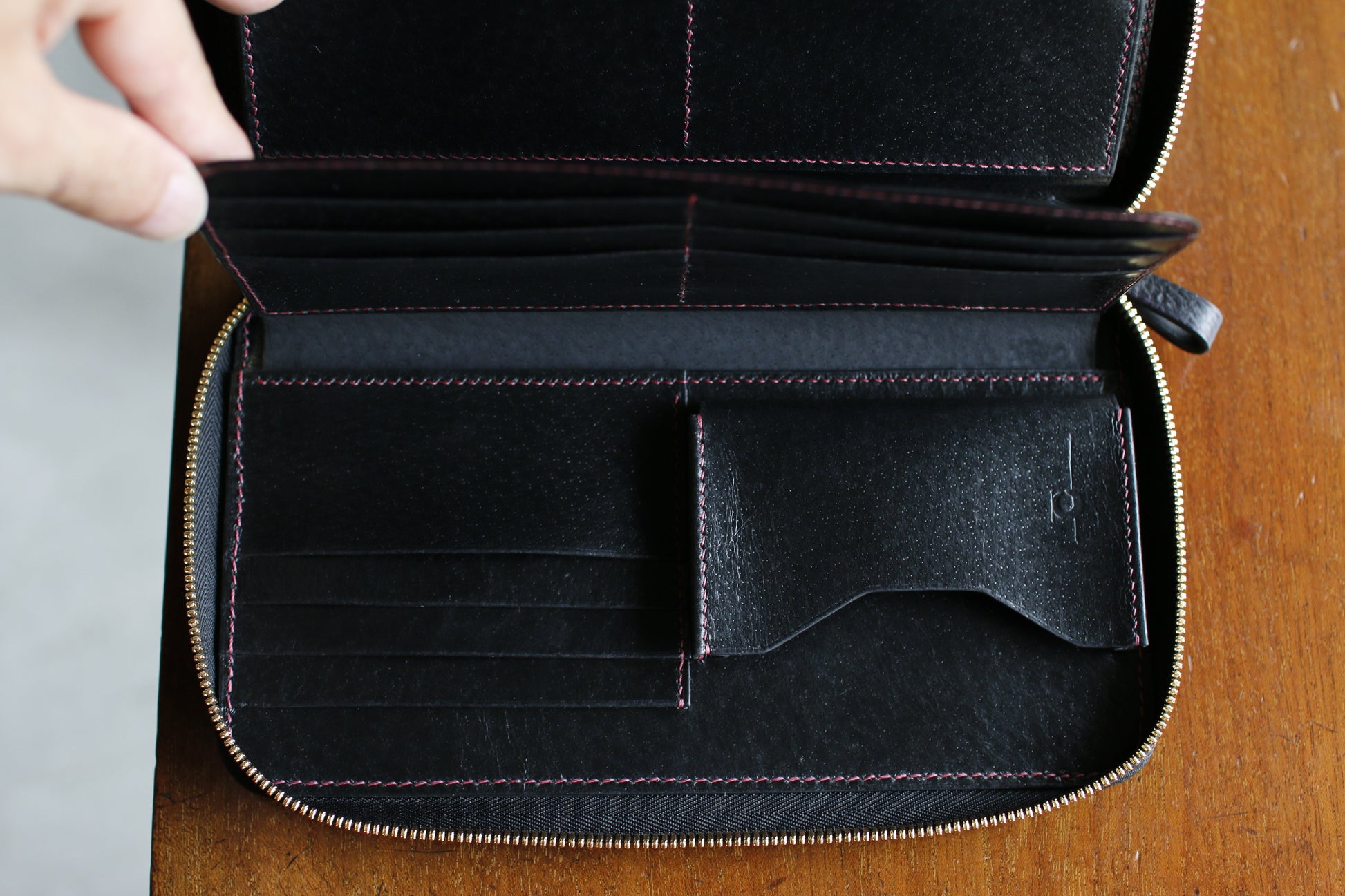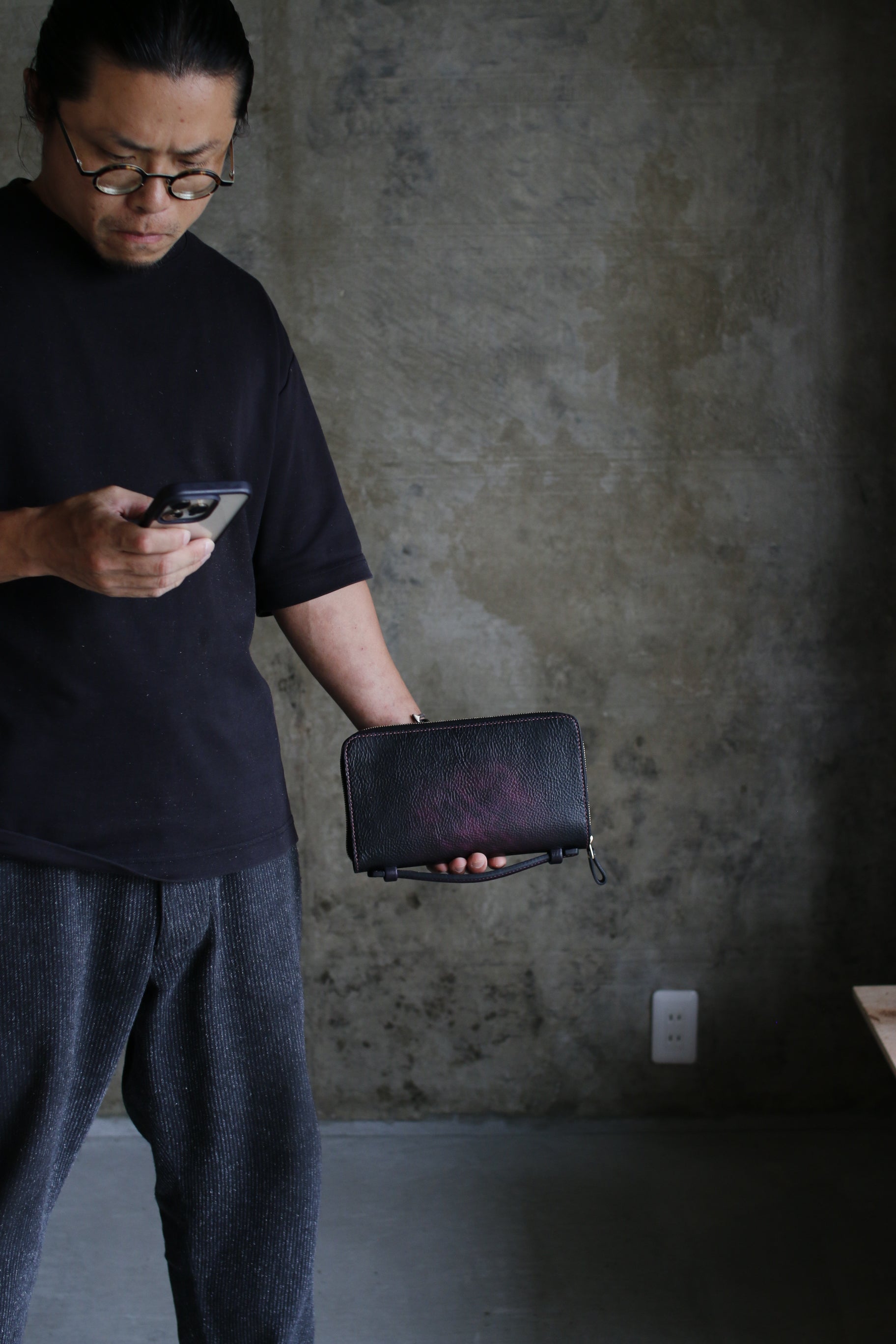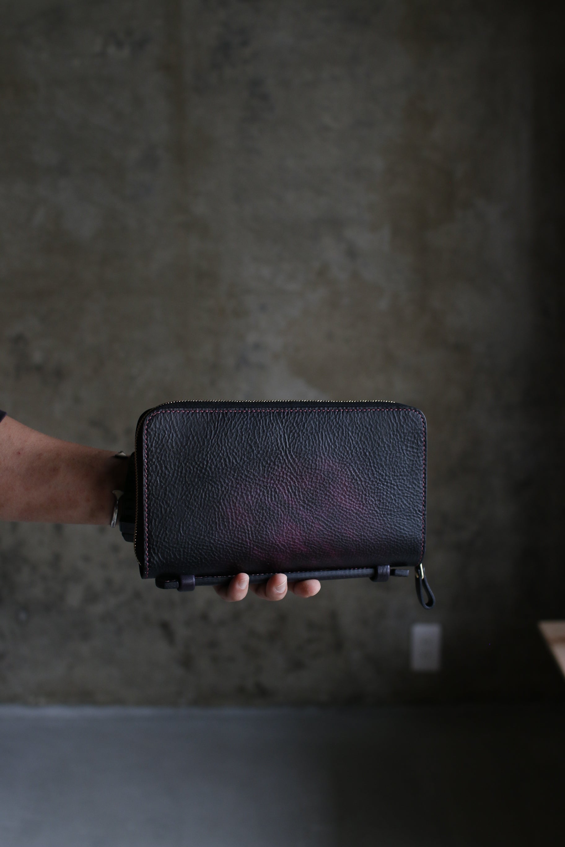 ハンドダイのパープルが惹き込まれる総手縫いオーガナイザー財布。