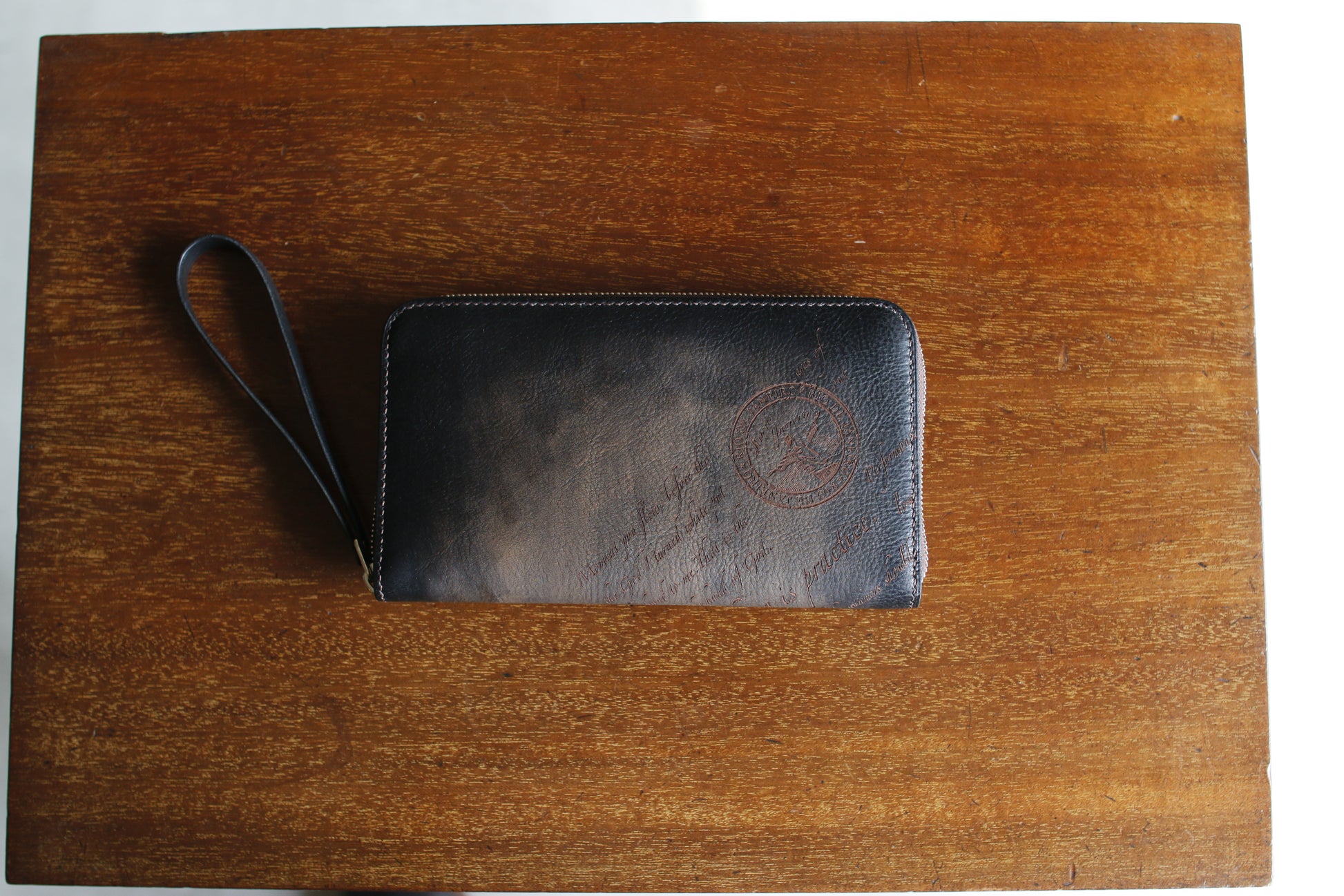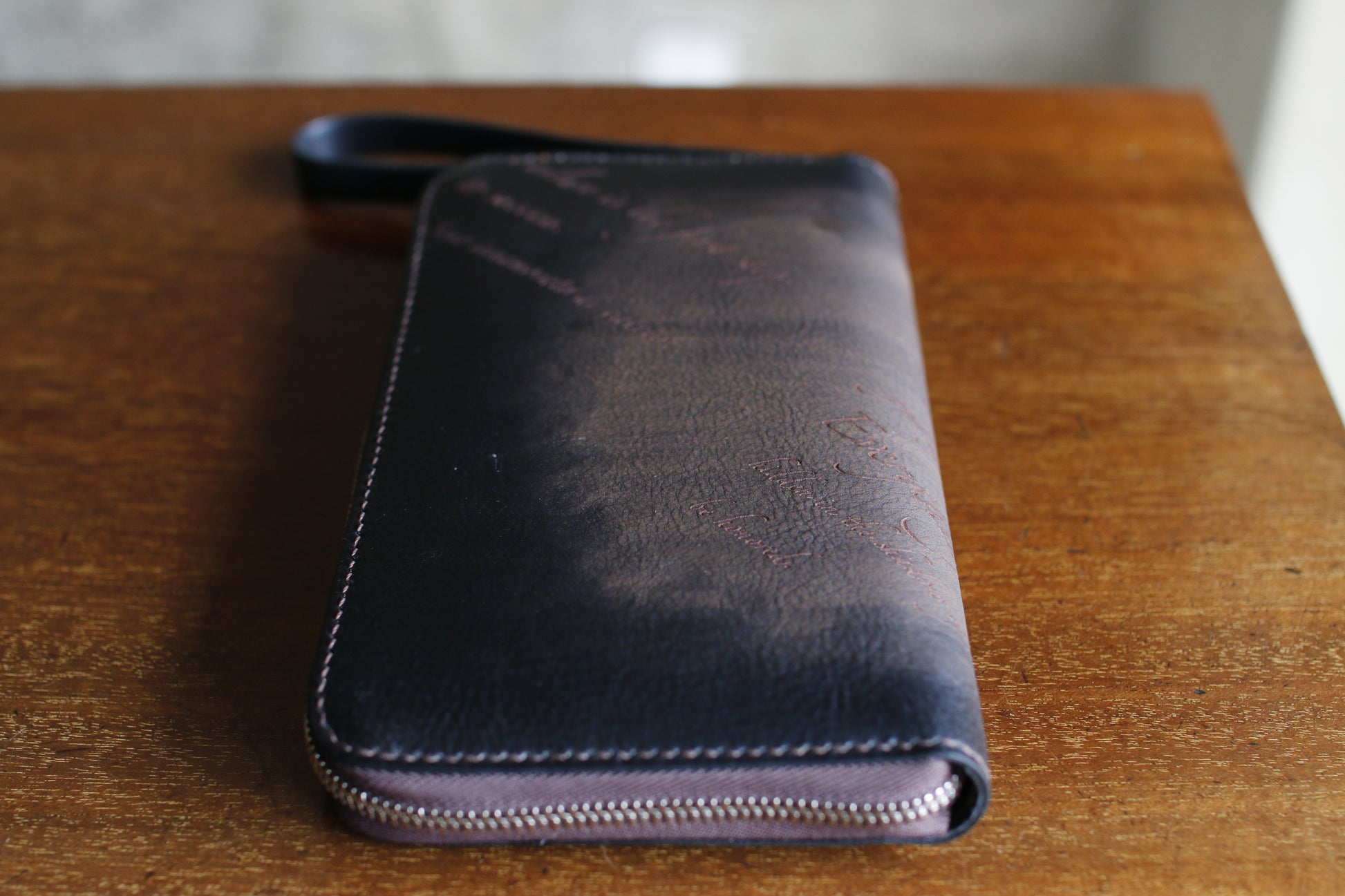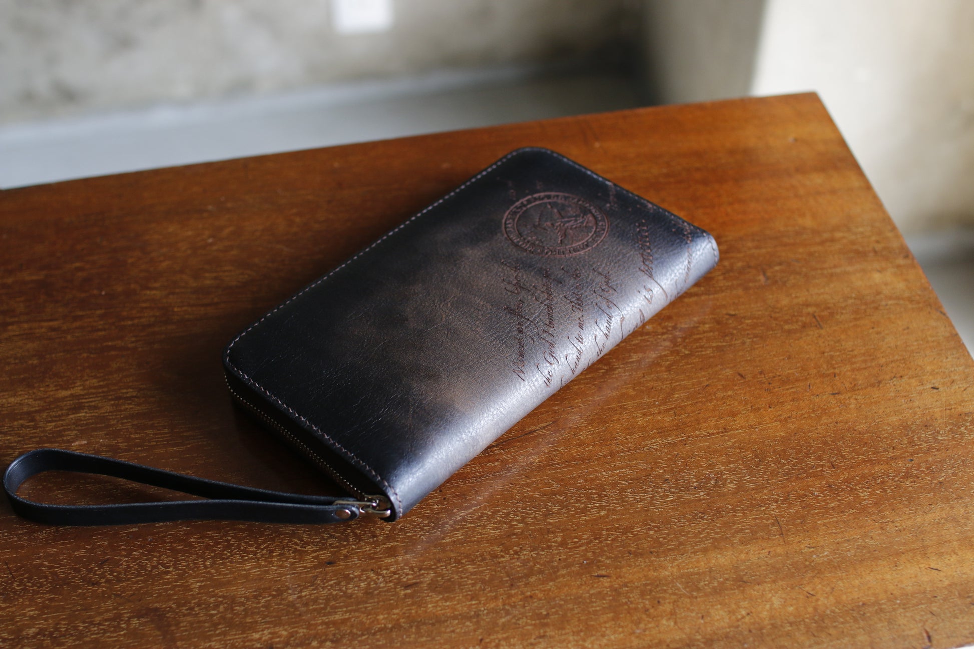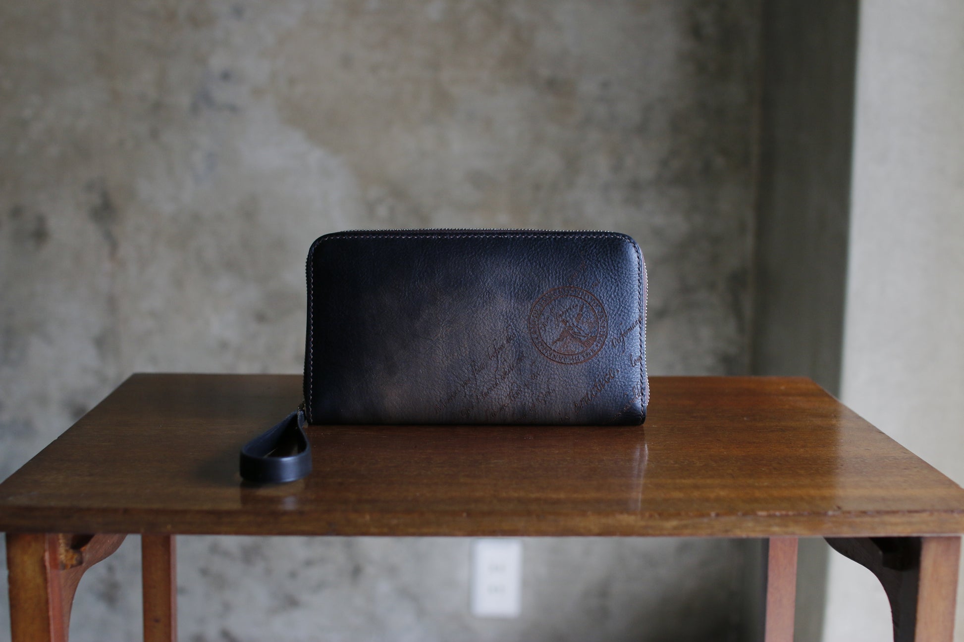 ハンドダイ&レーザー彫刻を施したラウンドZIP長財布。