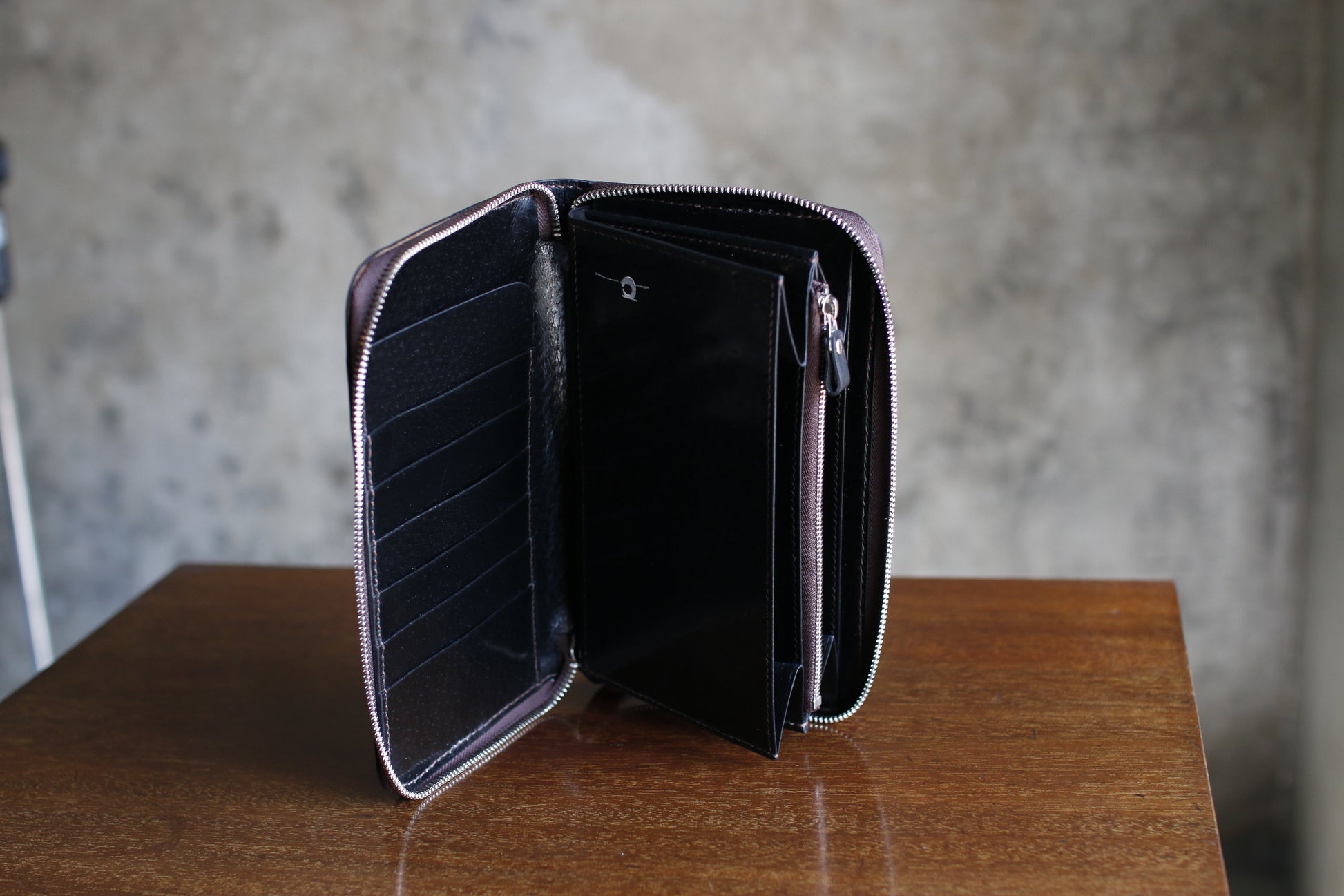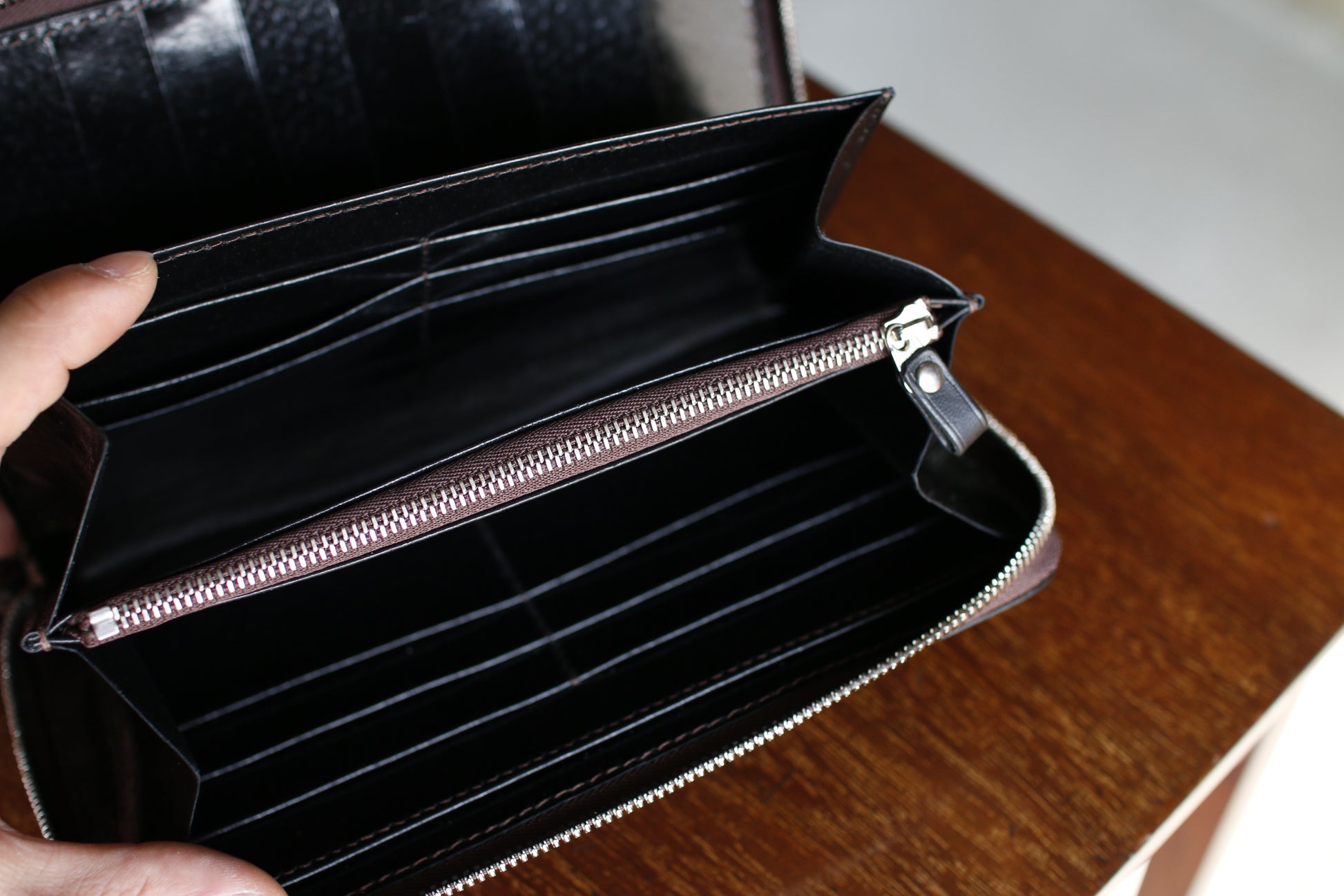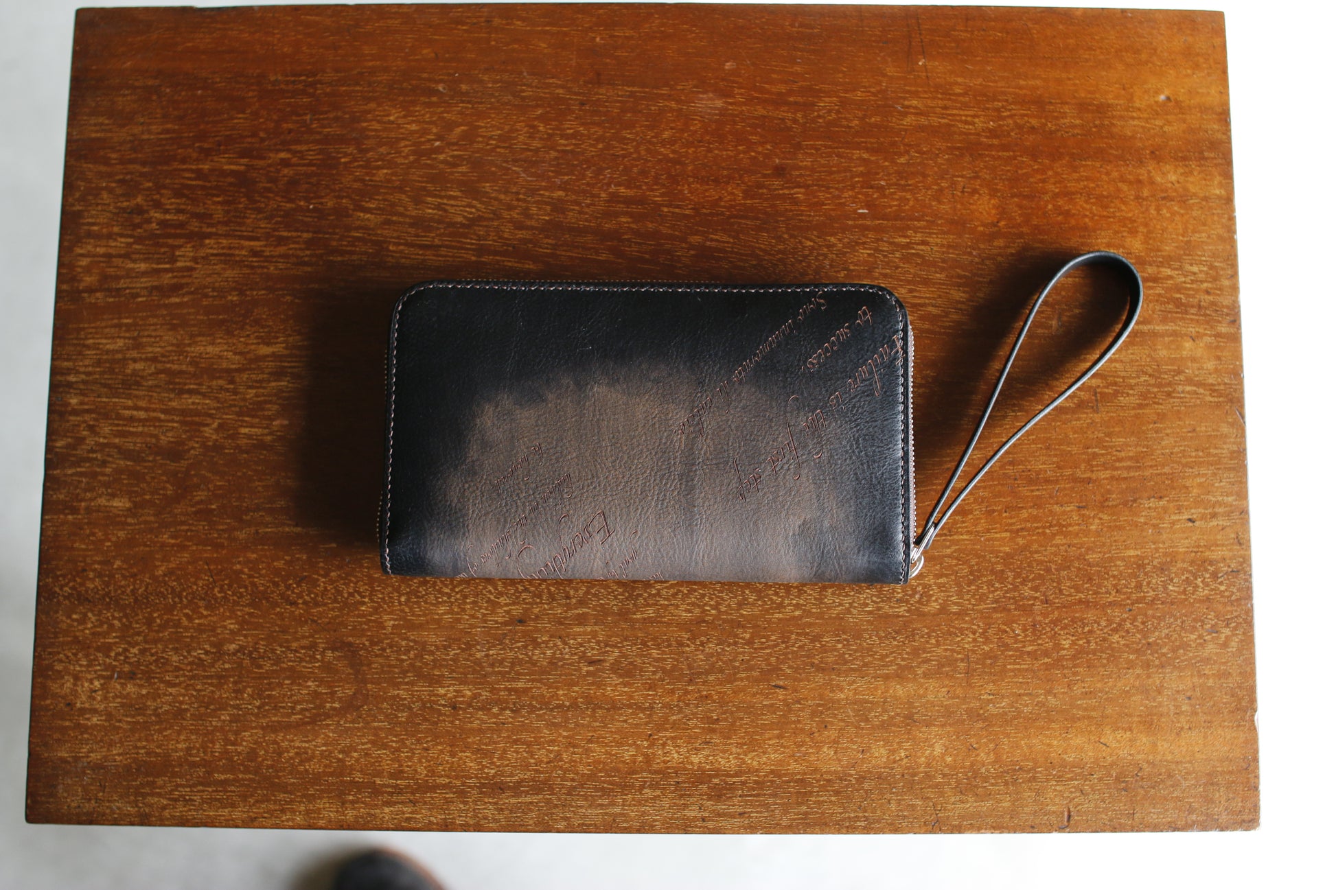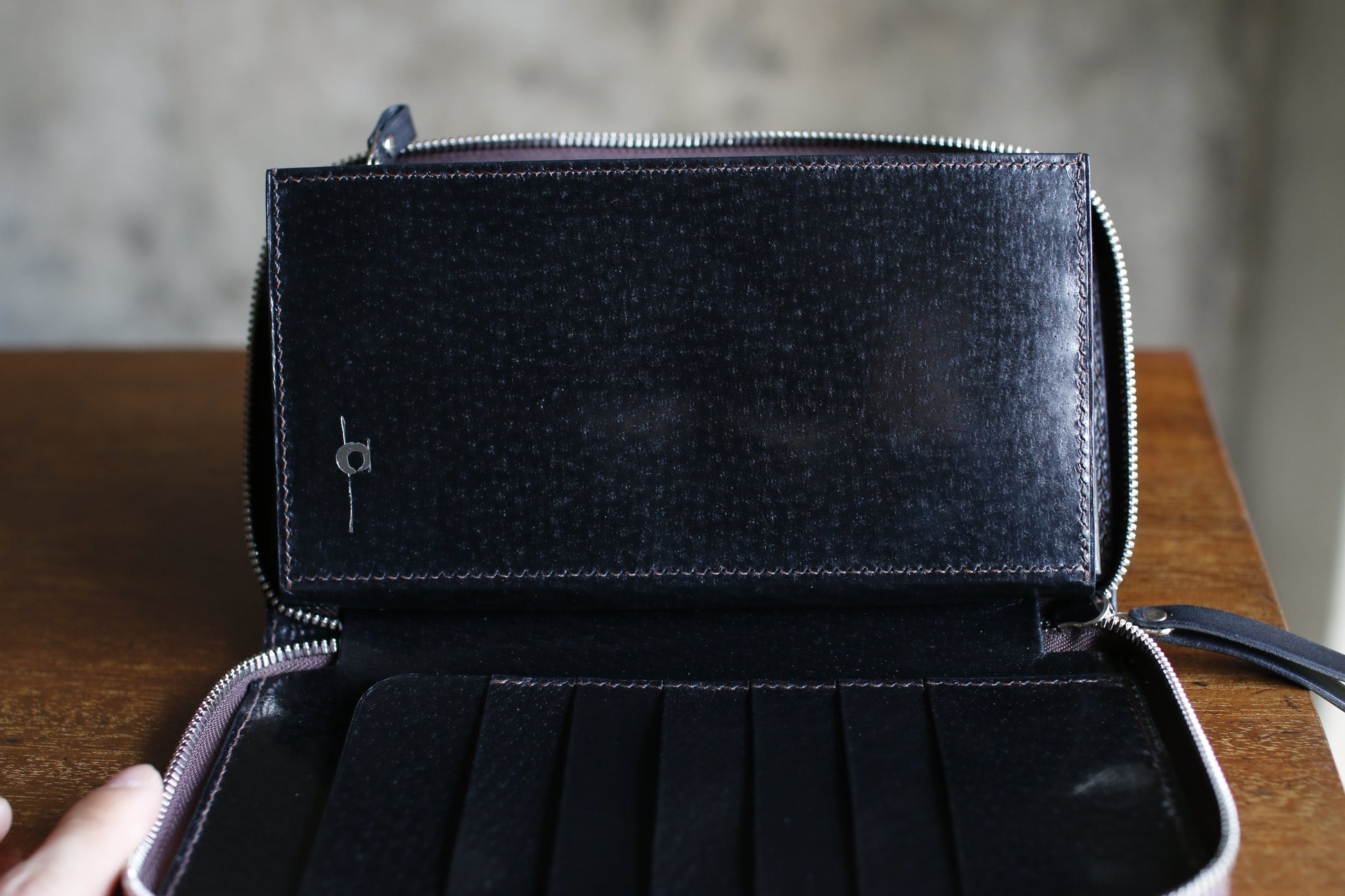 ハンドダイ&レーザー彫刻を施したラウンドZIP長財布。