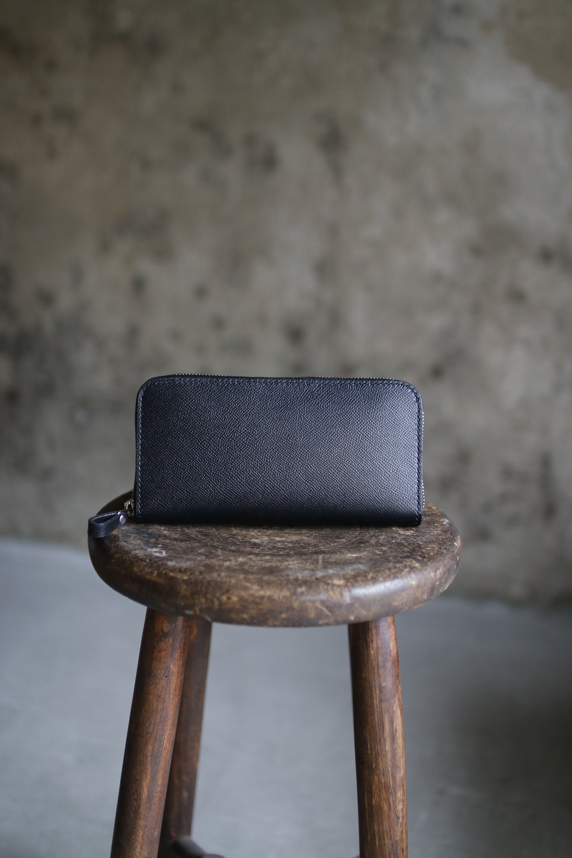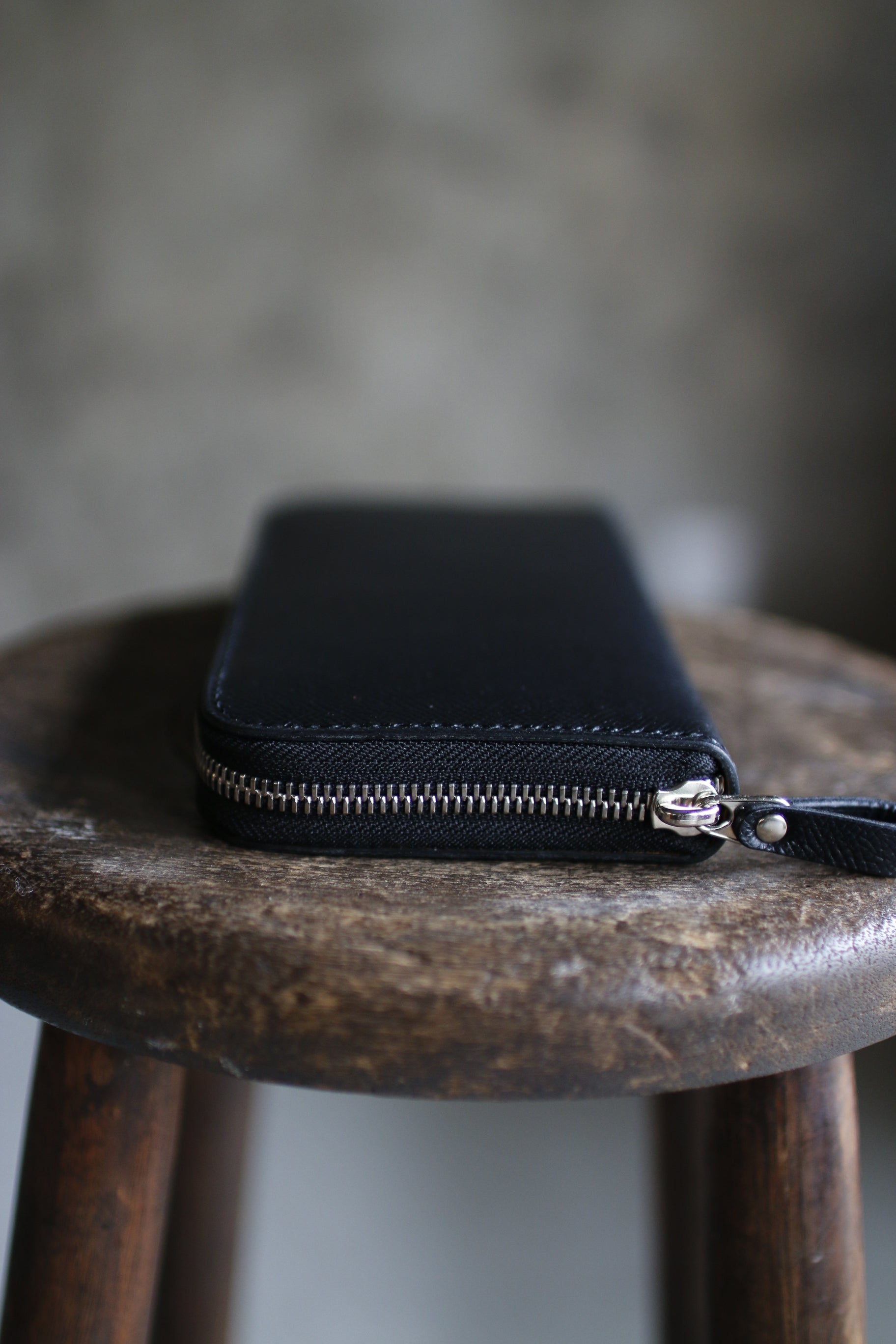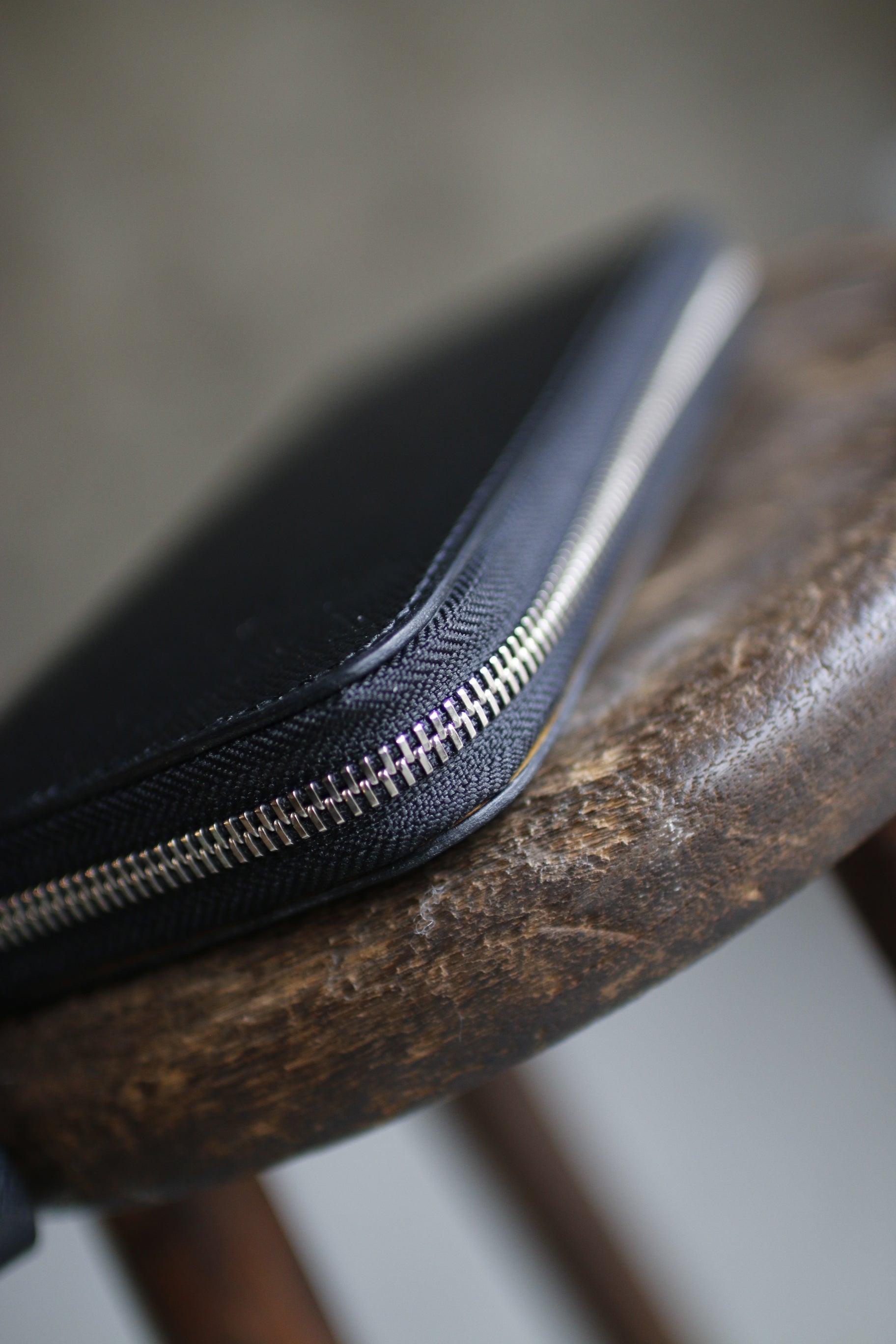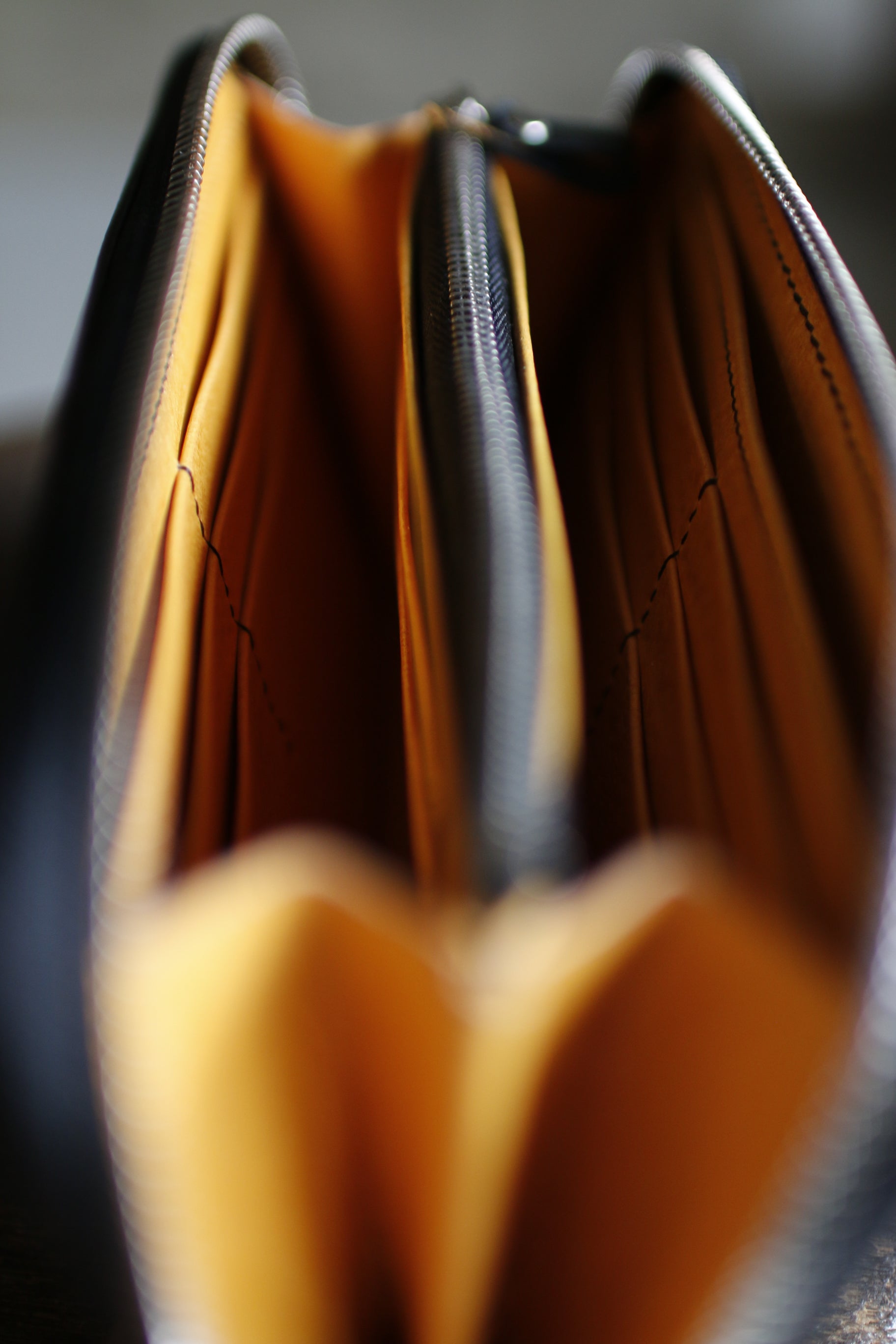 ブラック×イエローの配色が気分を高揚させてくれる総手縫いのラウンドファスナー長財布。