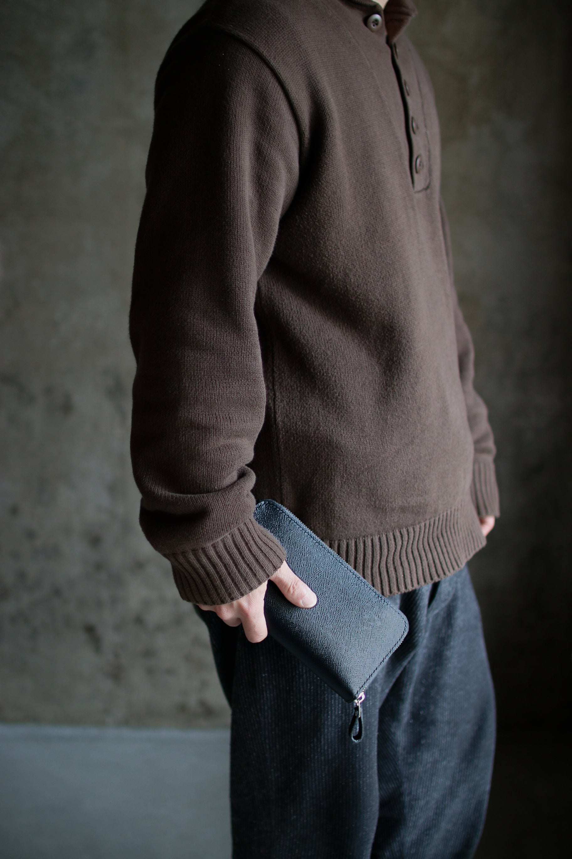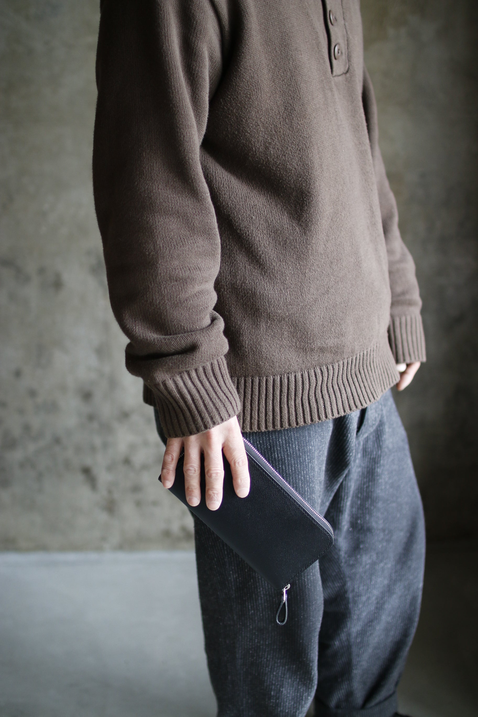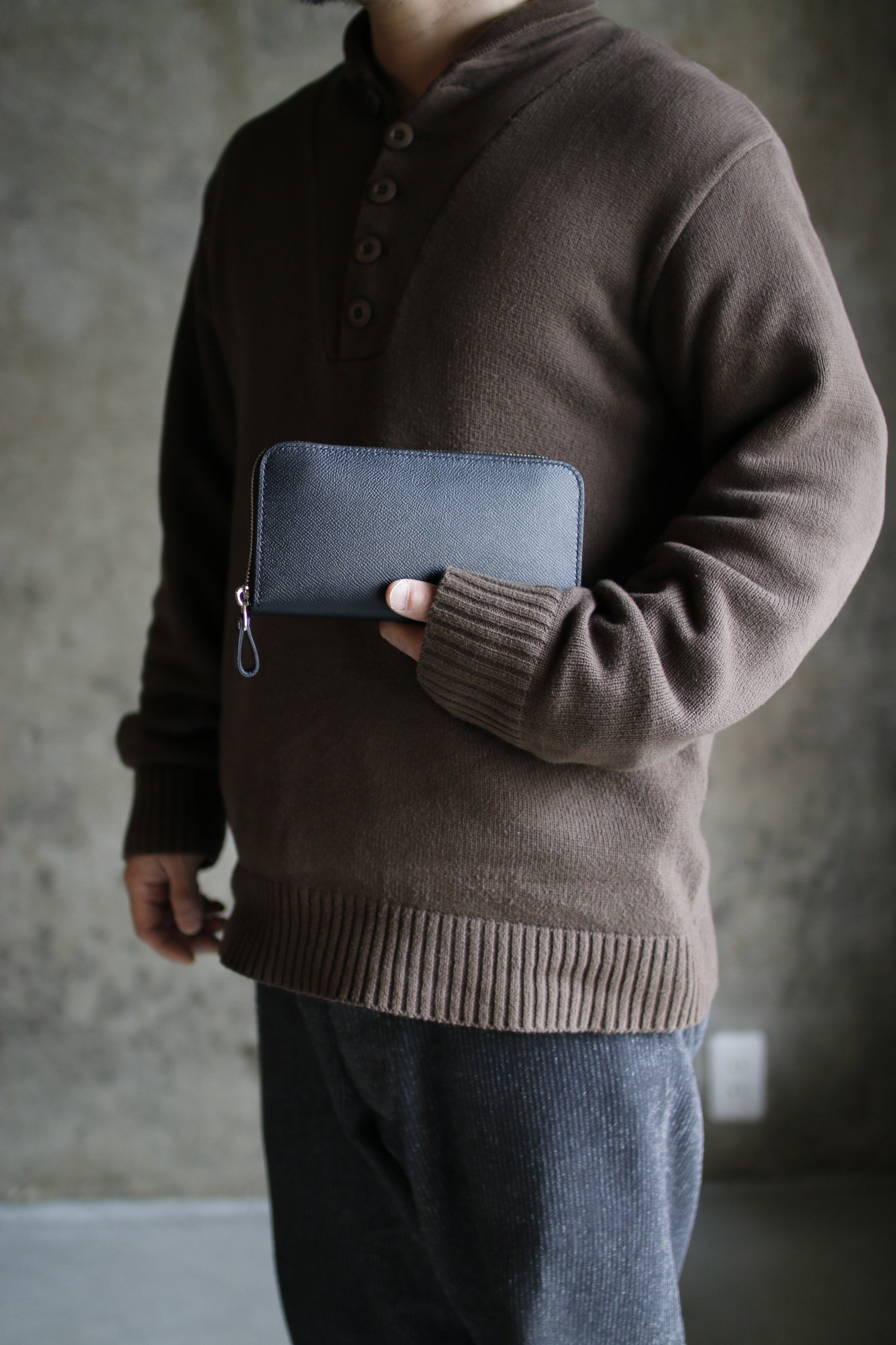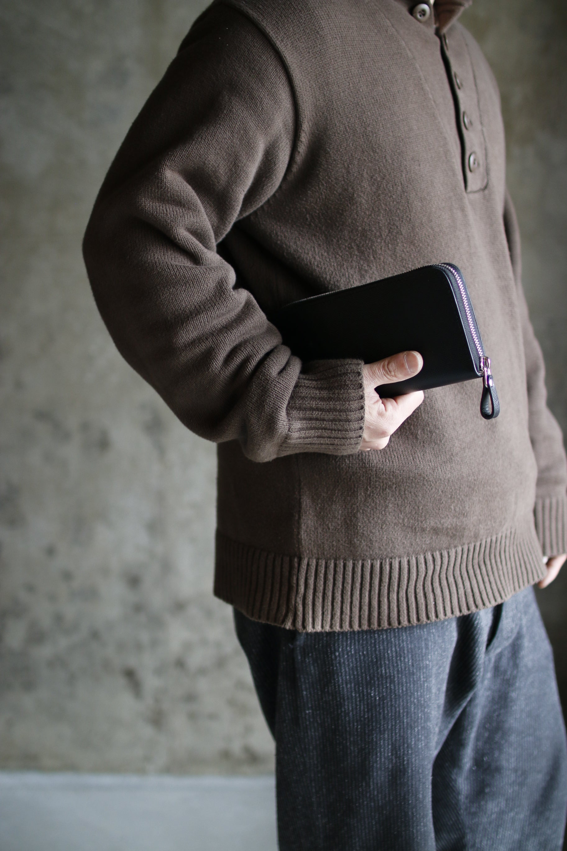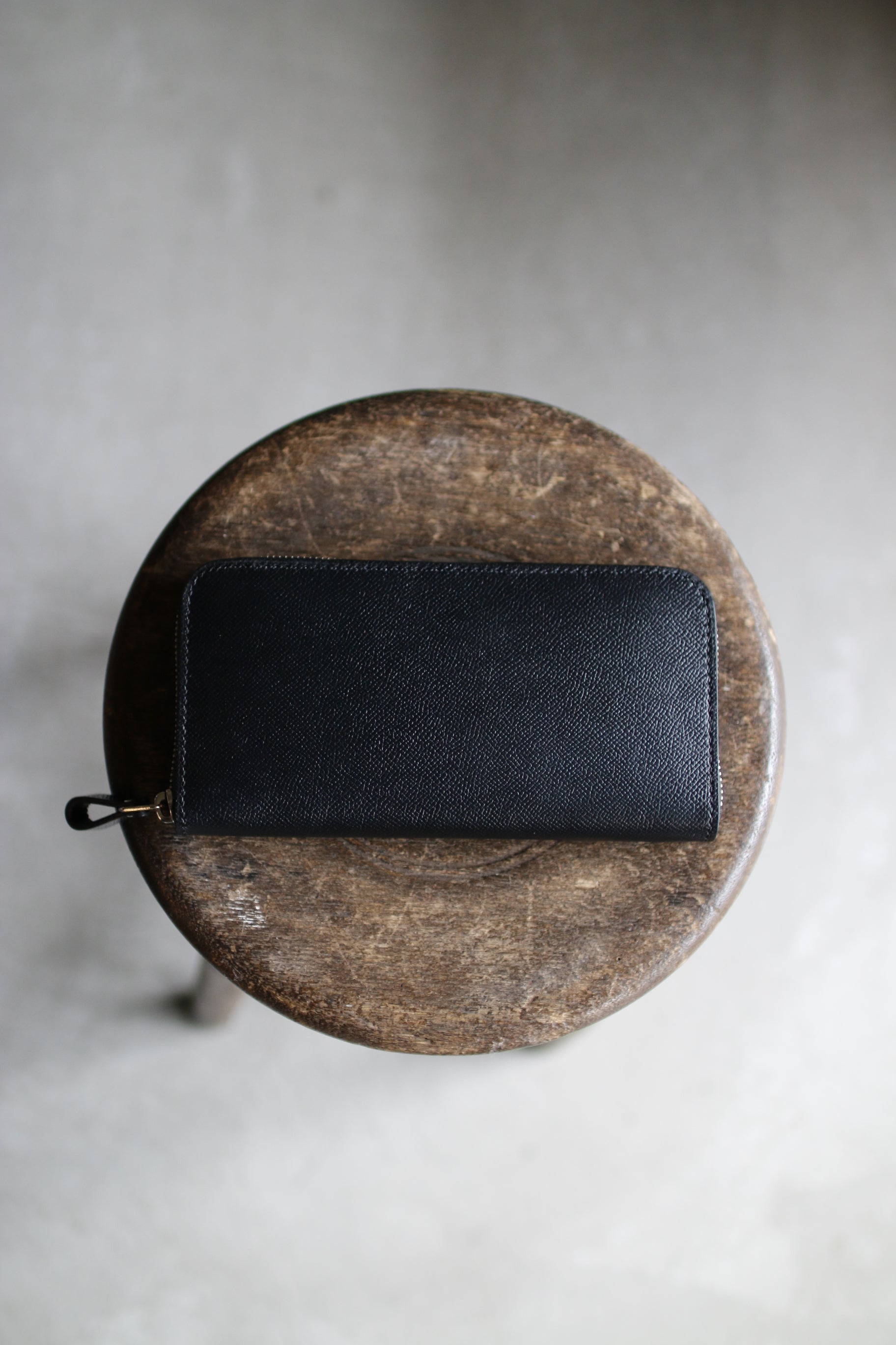 ブラック×イエローの配色が気分を高揚させてくれる総手縫いのラウンドファスナー長財布。