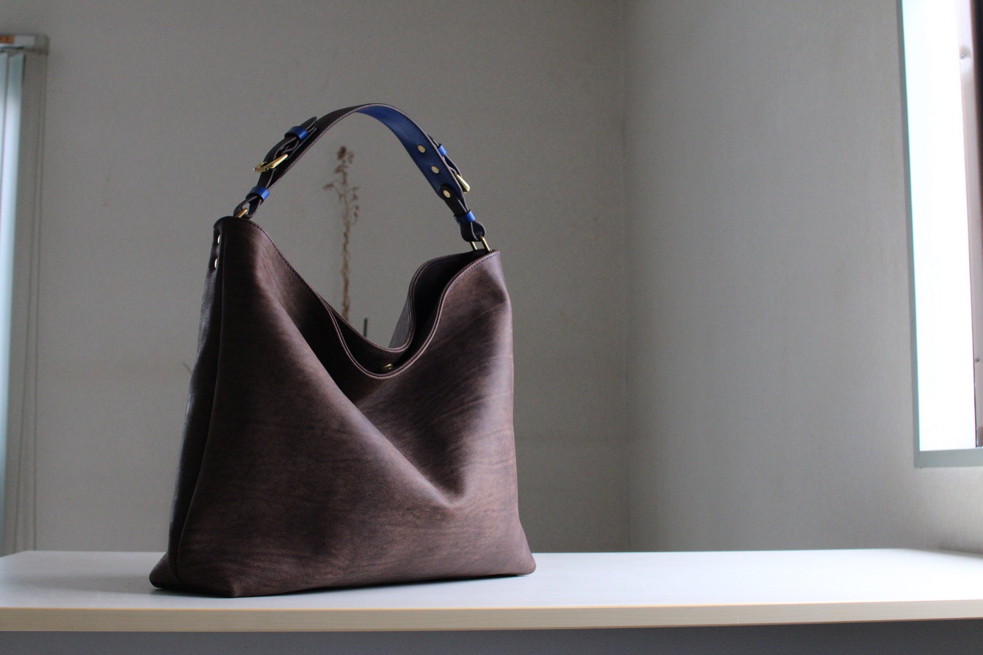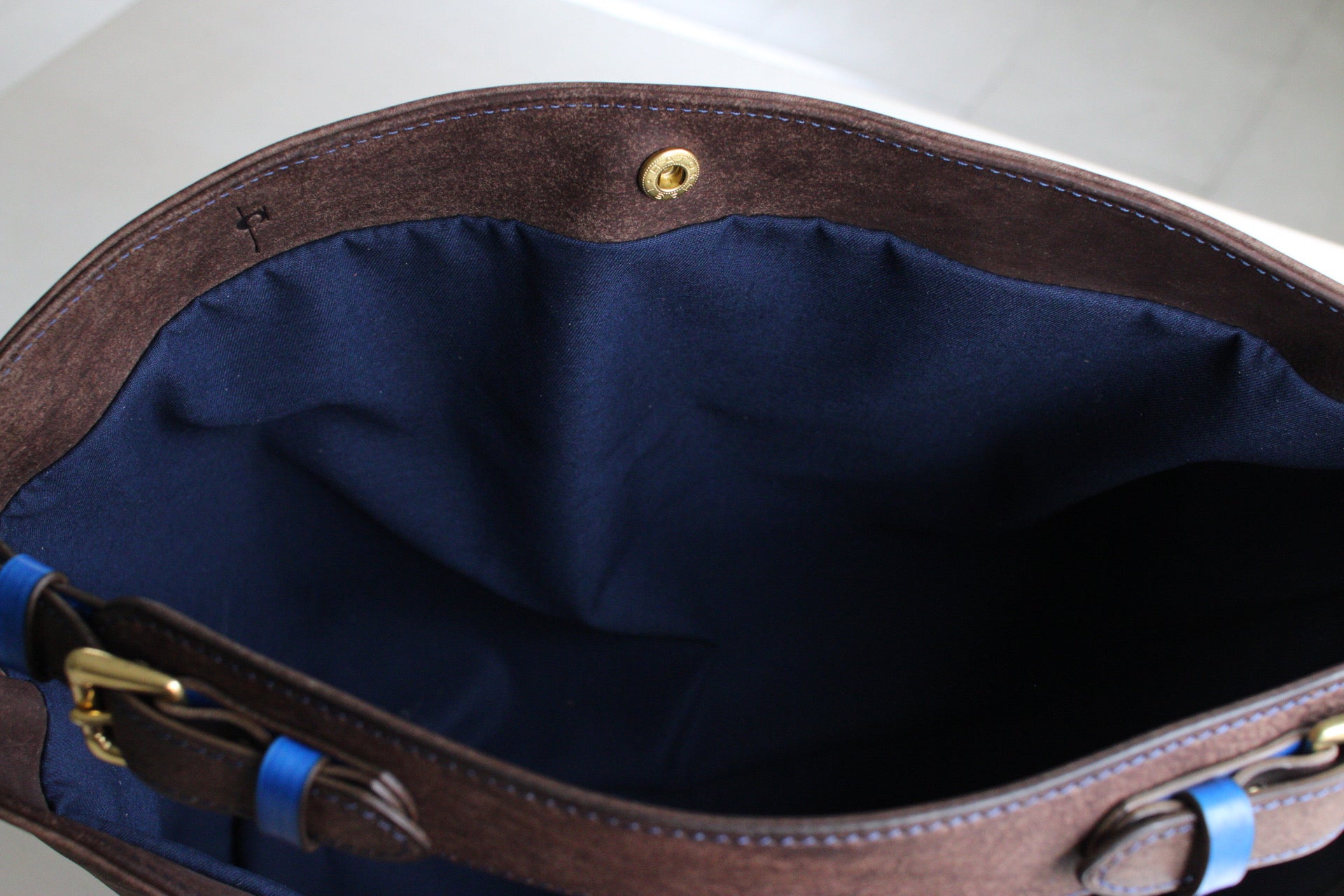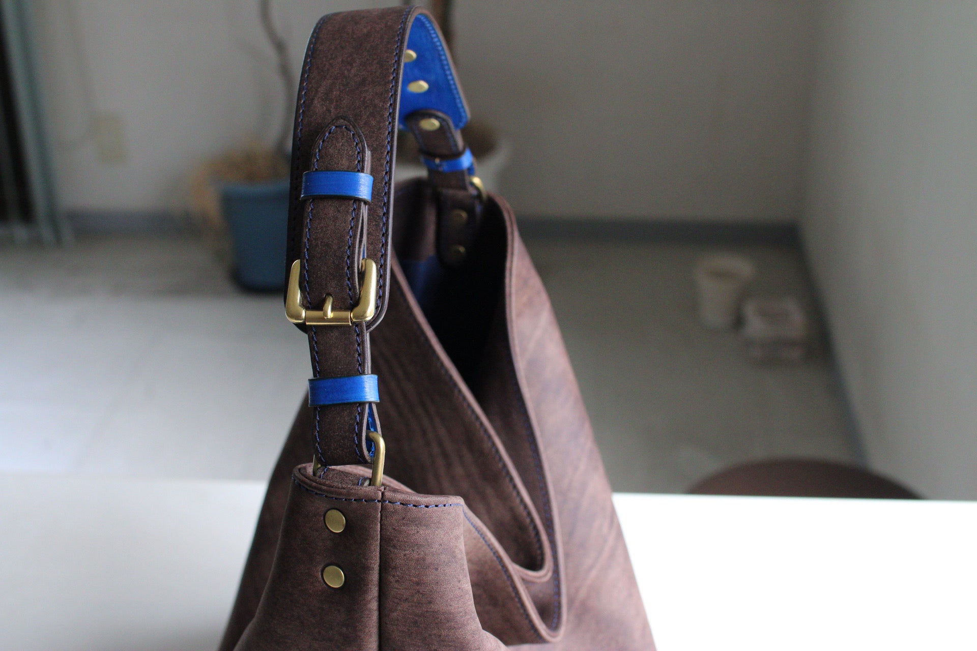 茶系色の本体に鮮やかな青の配色が良い雰囲気のワンショルダーバッグ。