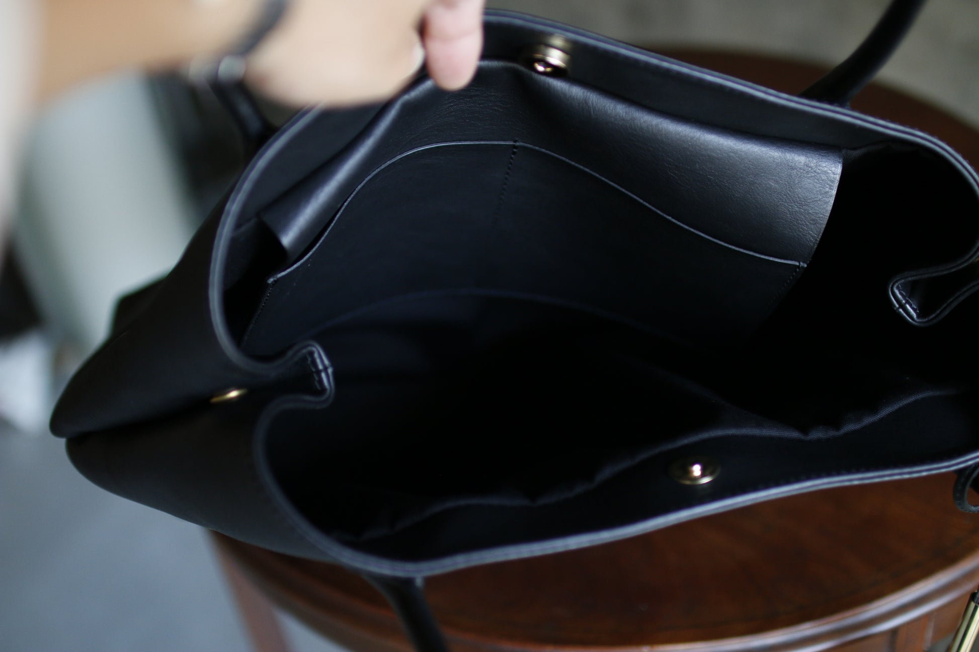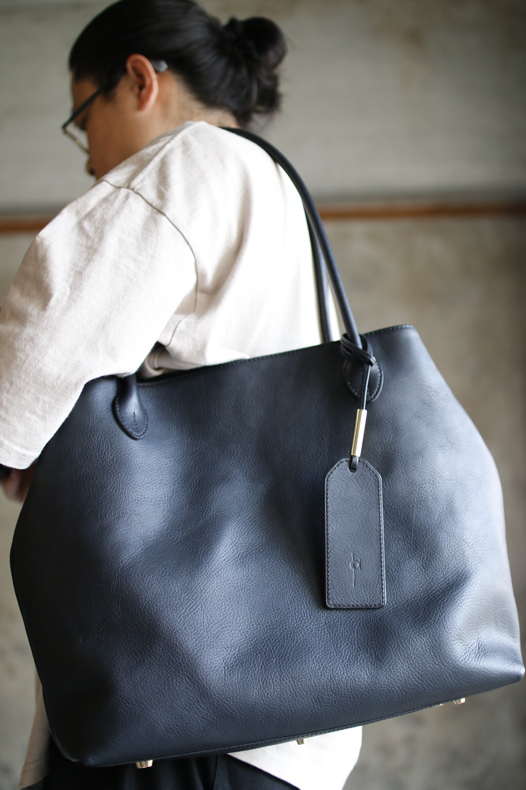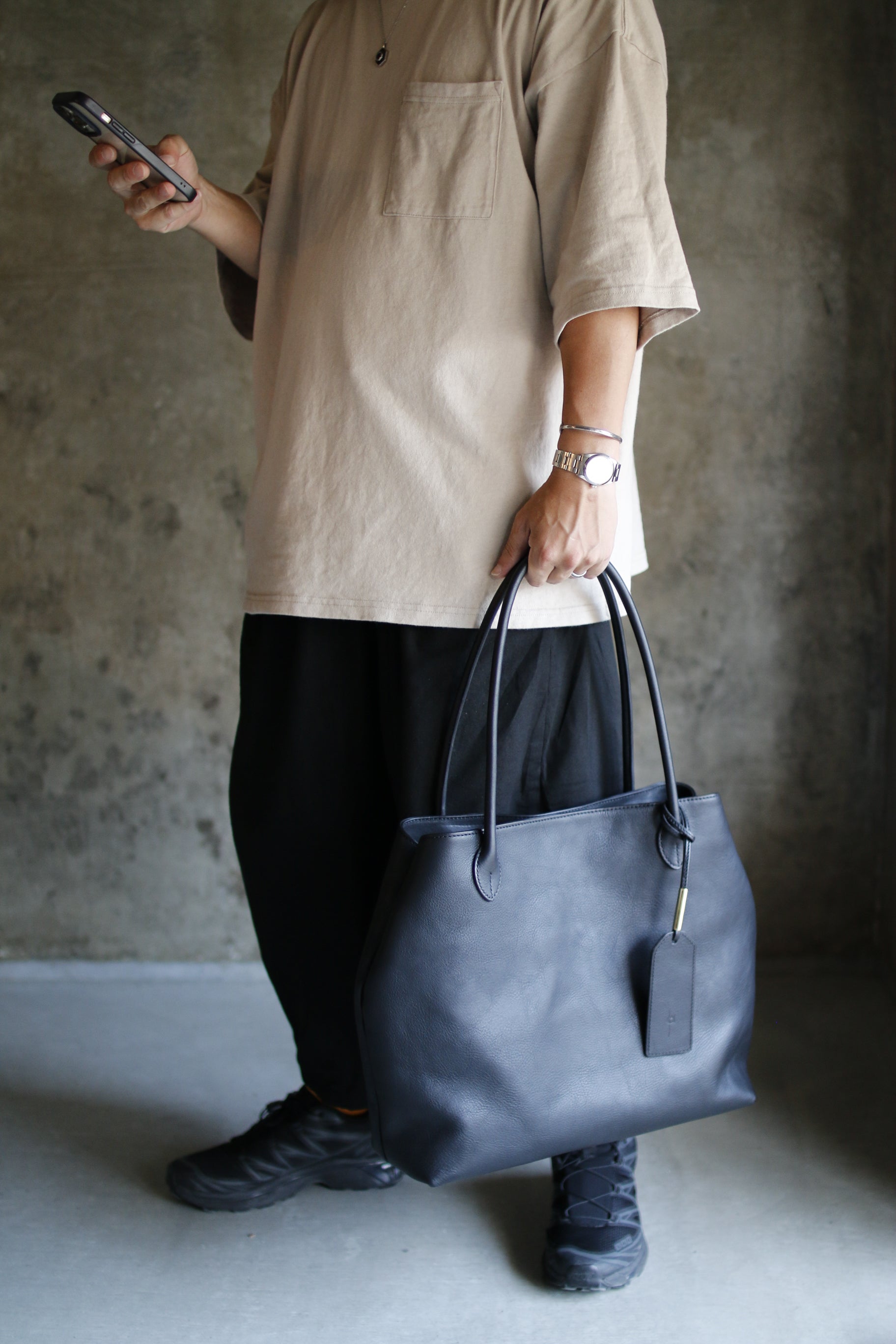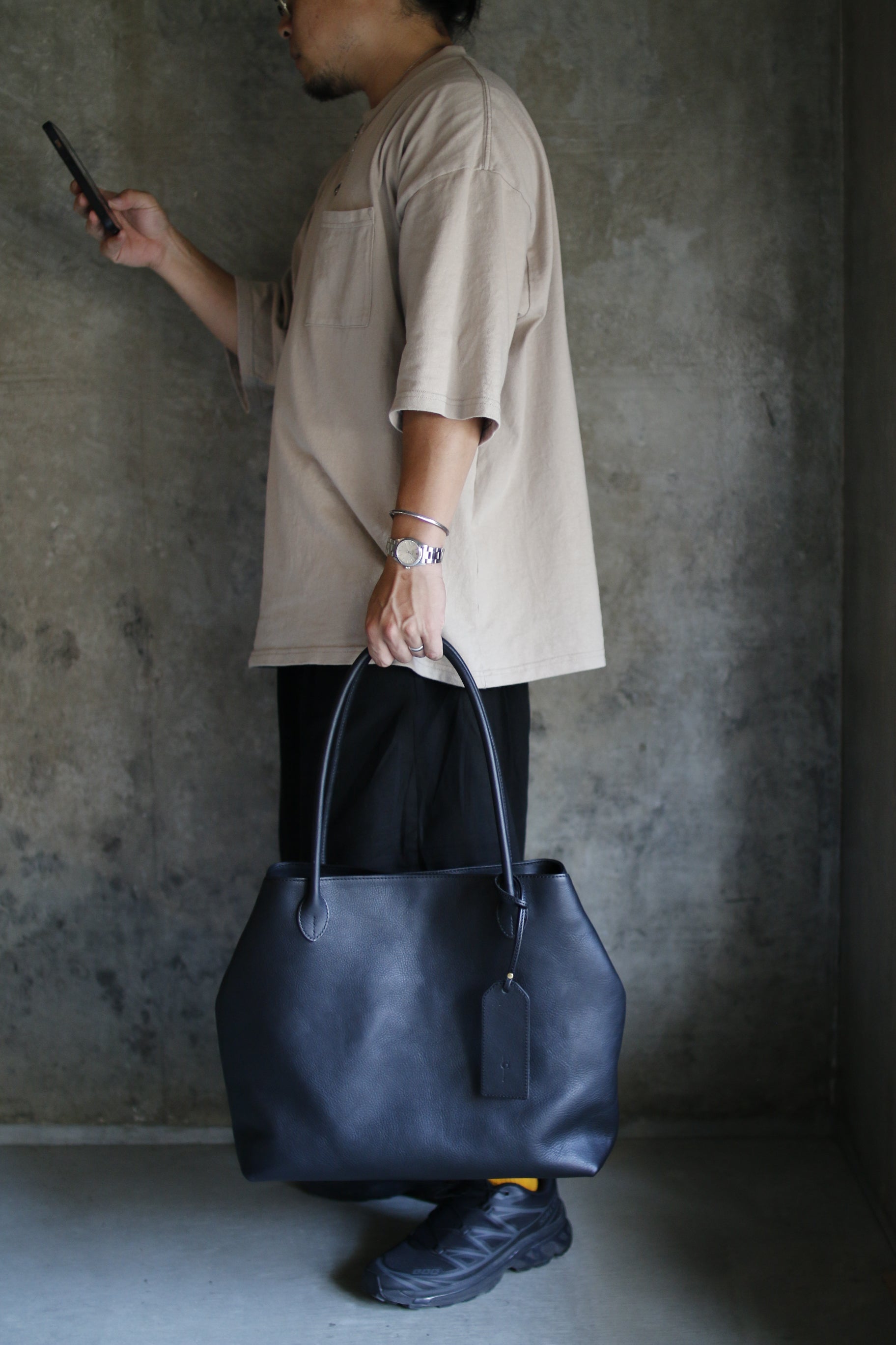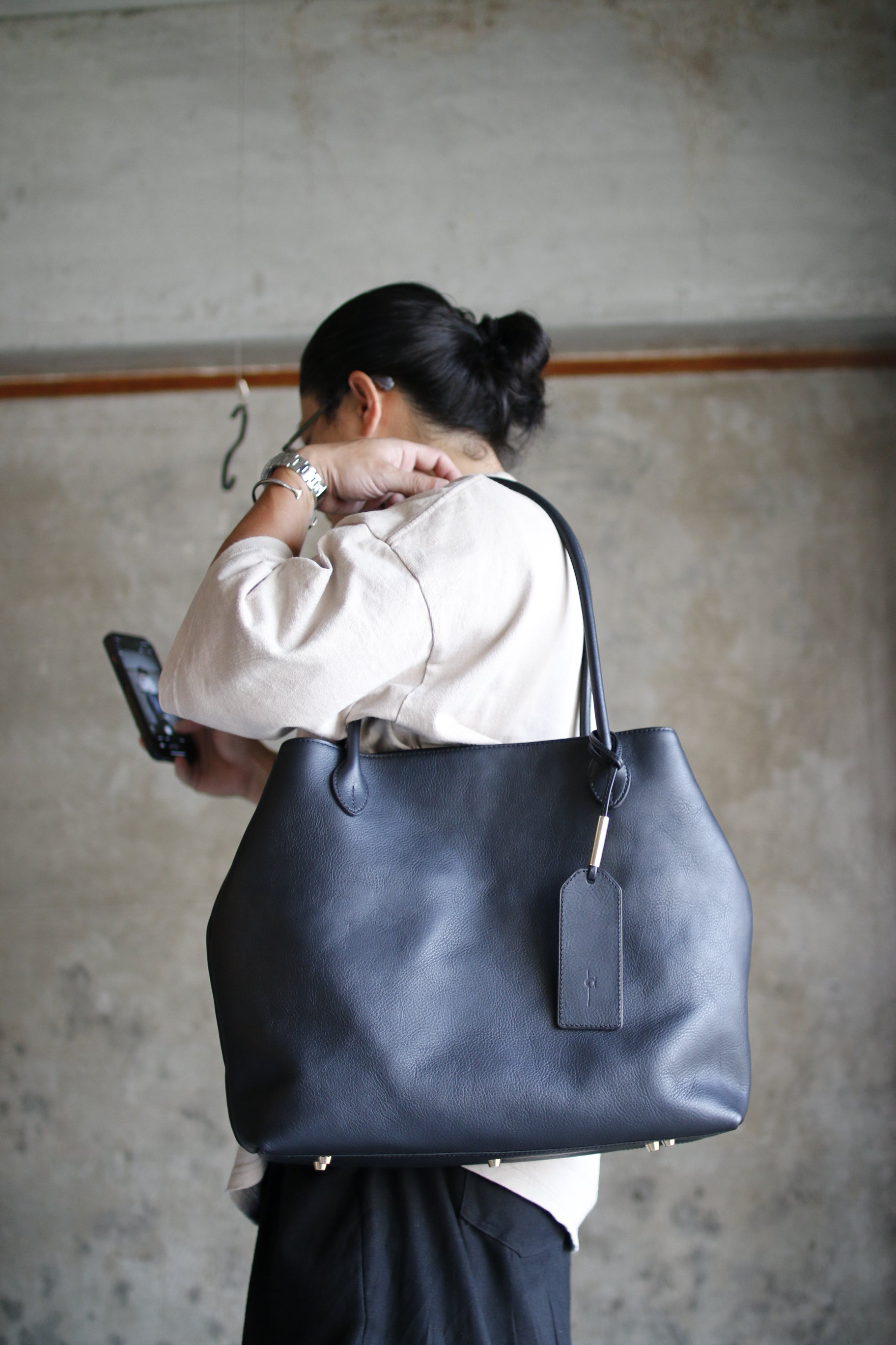 手縫い持ち手の曲線が美しいトートバッグ。