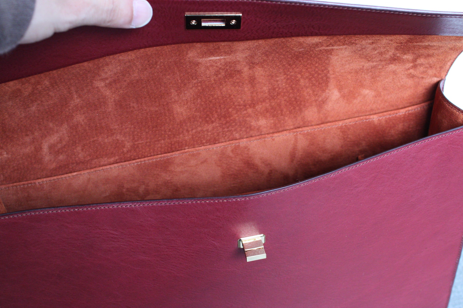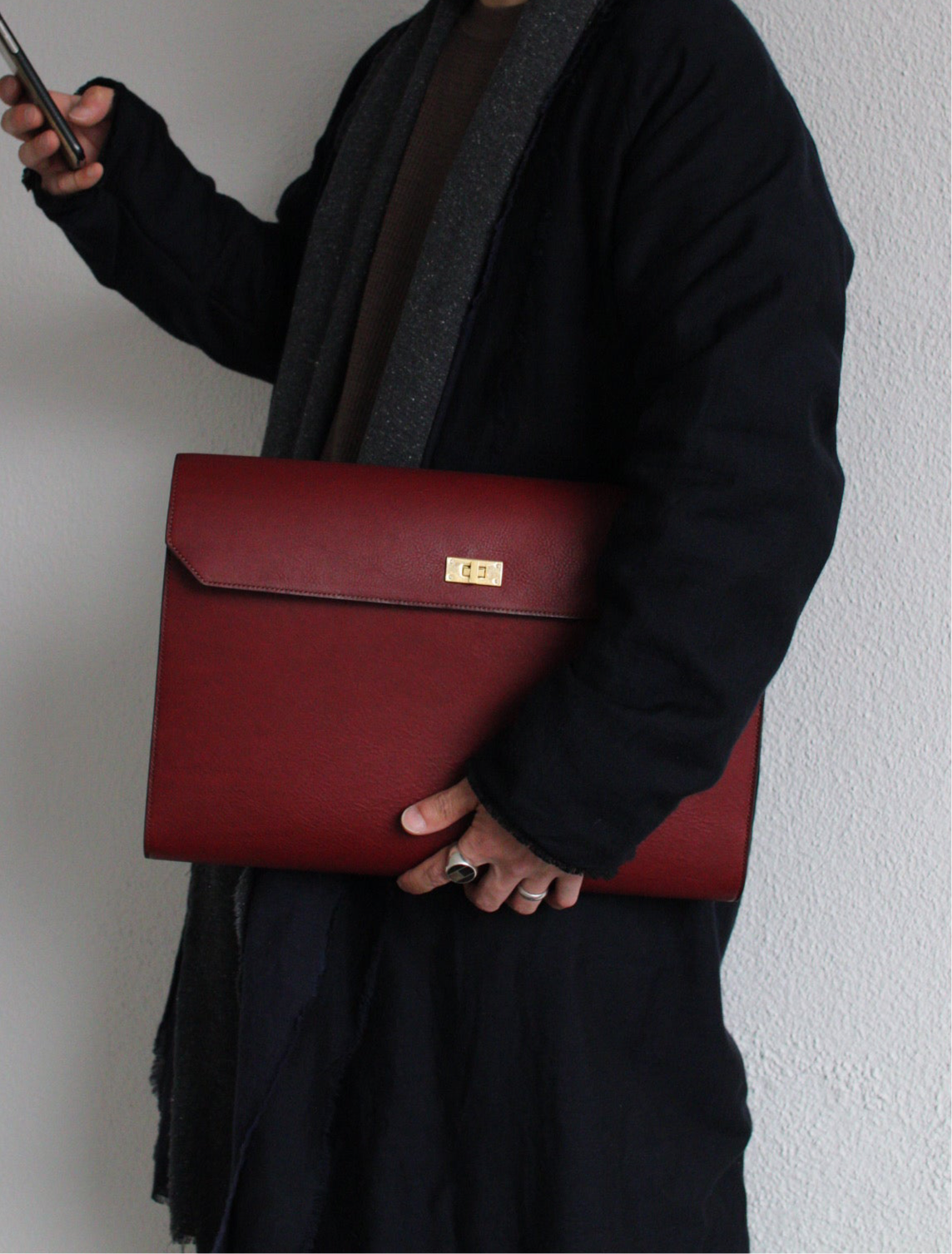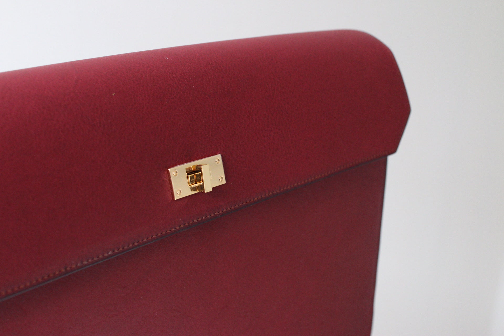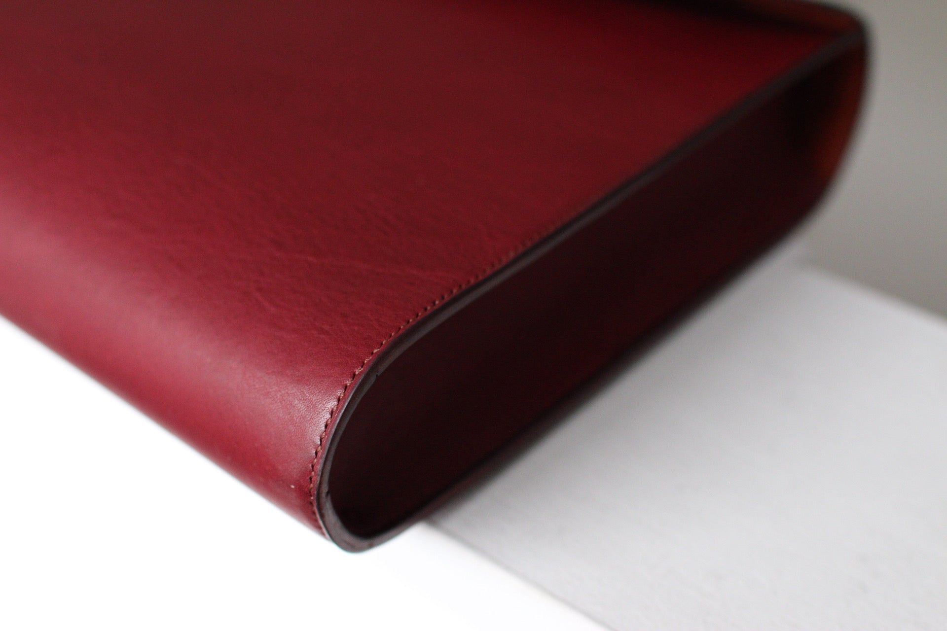 総手縫いのクラッチバッグ。