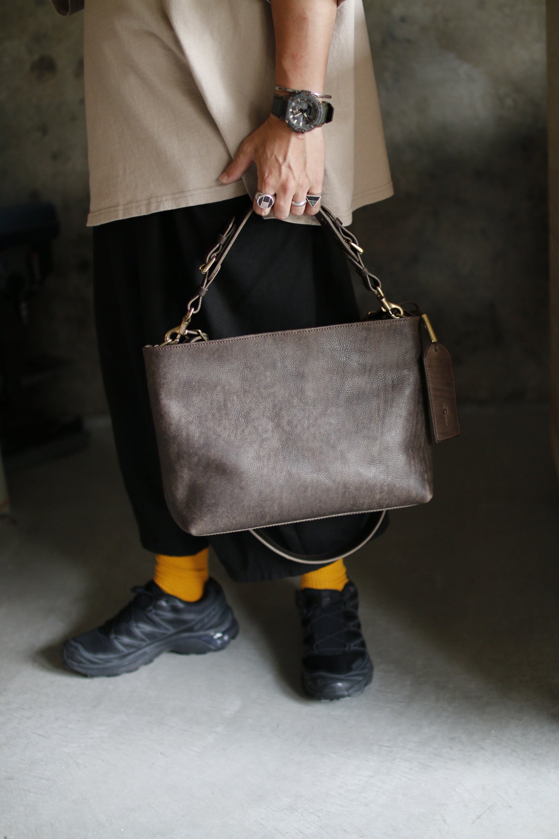 茶系色の本体に鮮やかな青の配色が良い雰囲気のワンショルダーバッグ。