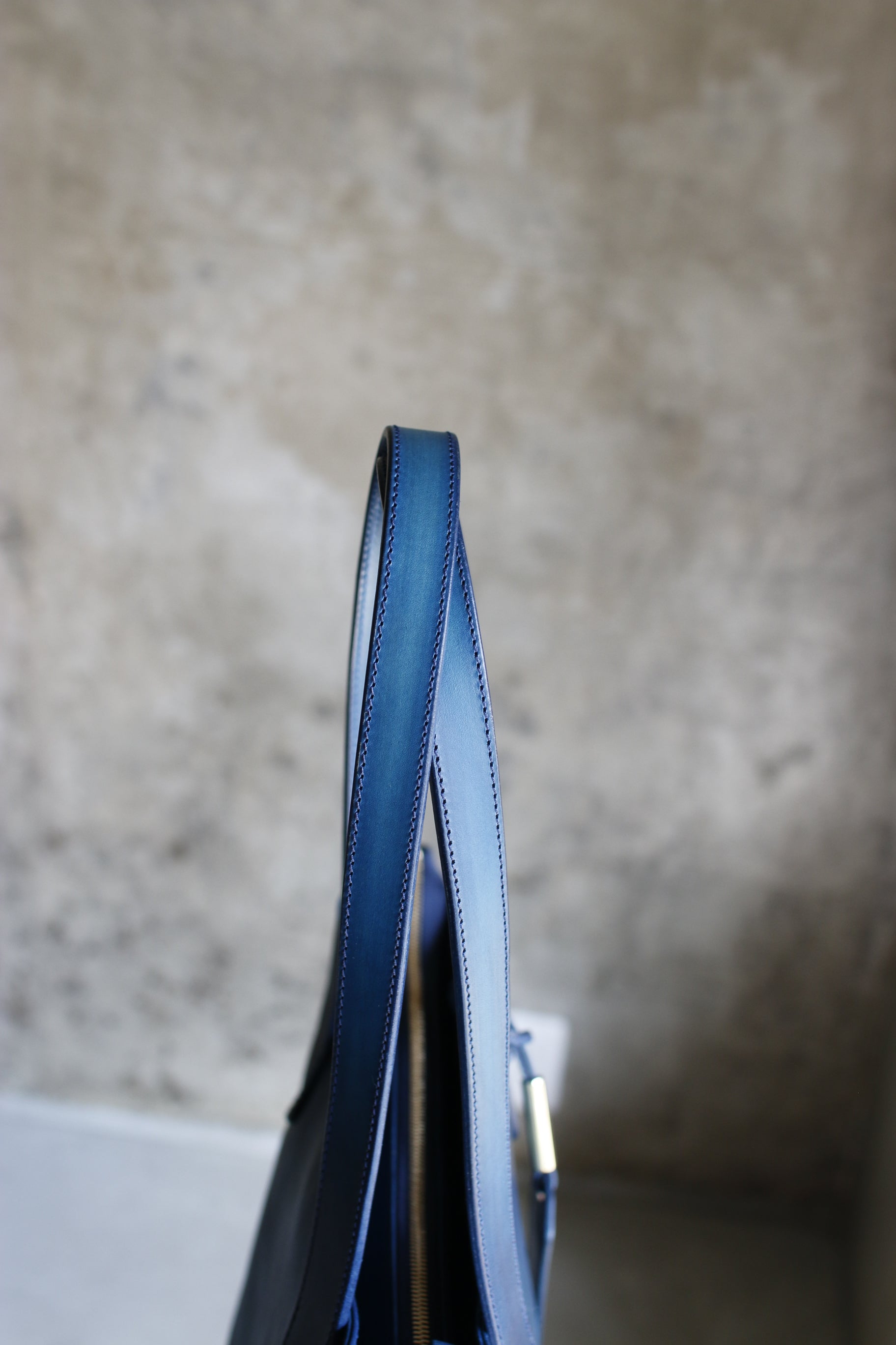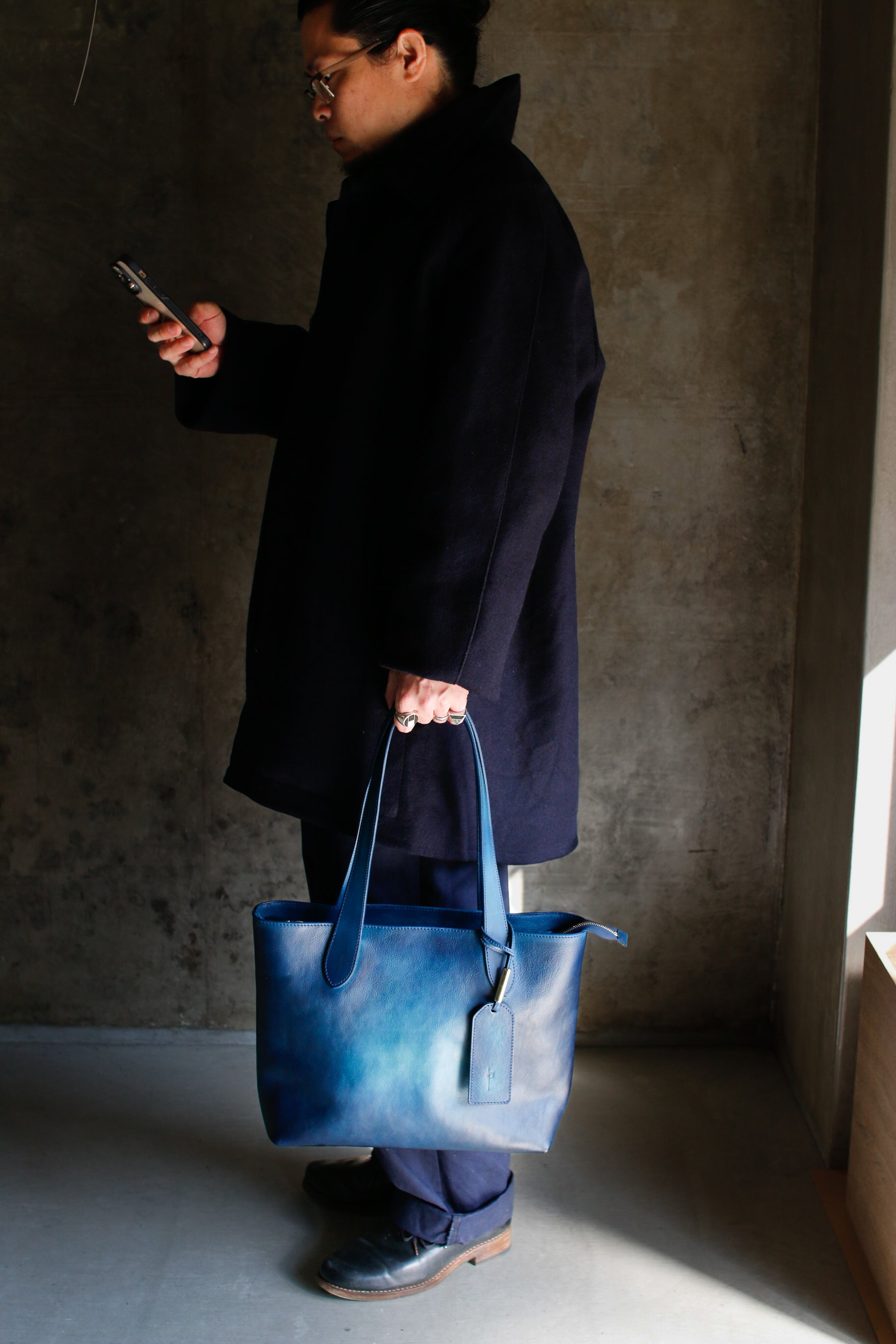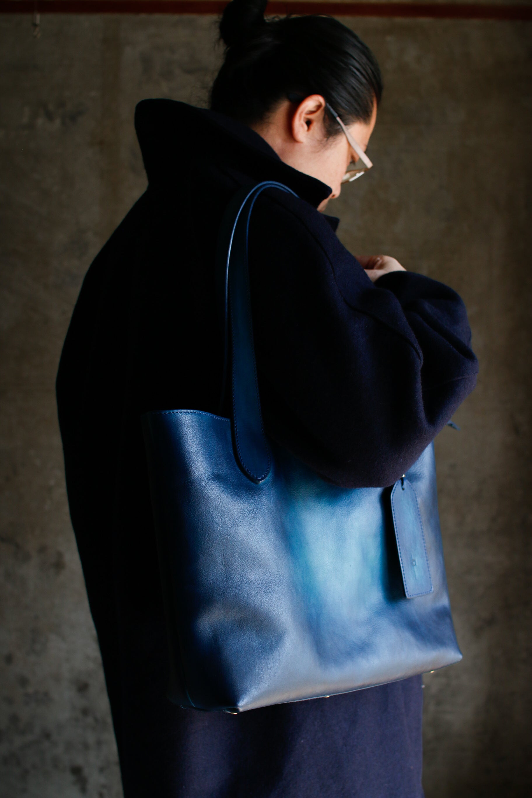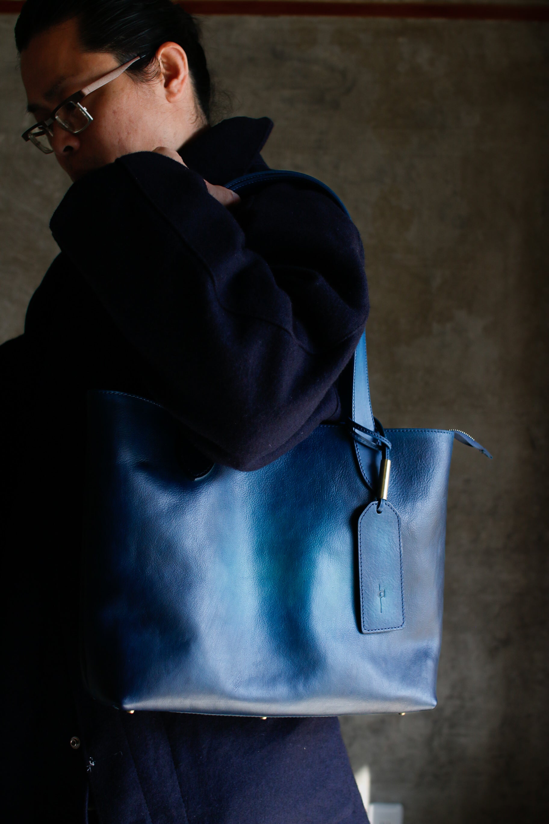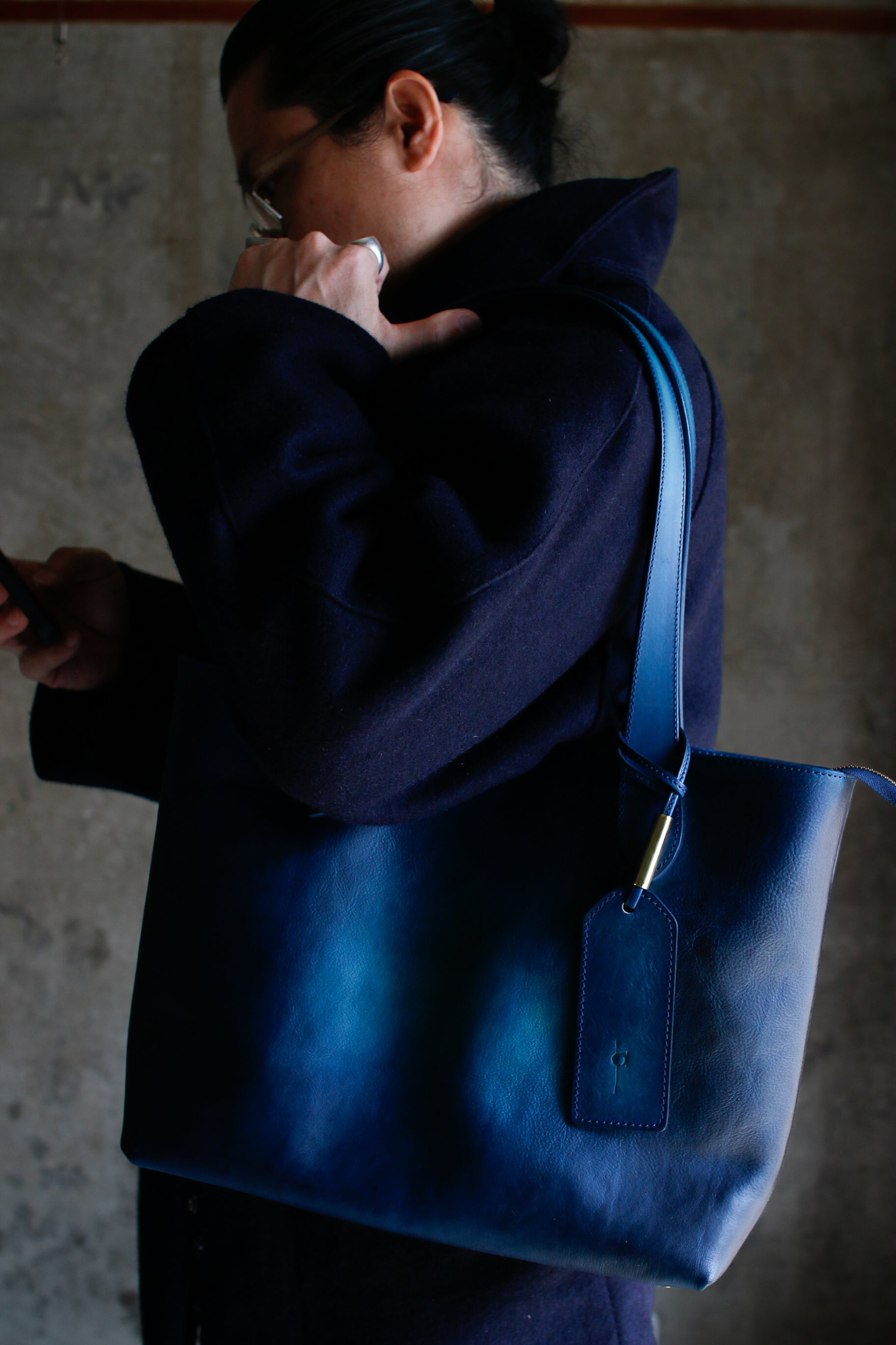 ブルーのグラデーションが目を惹くハンドダイのトートバッグ。