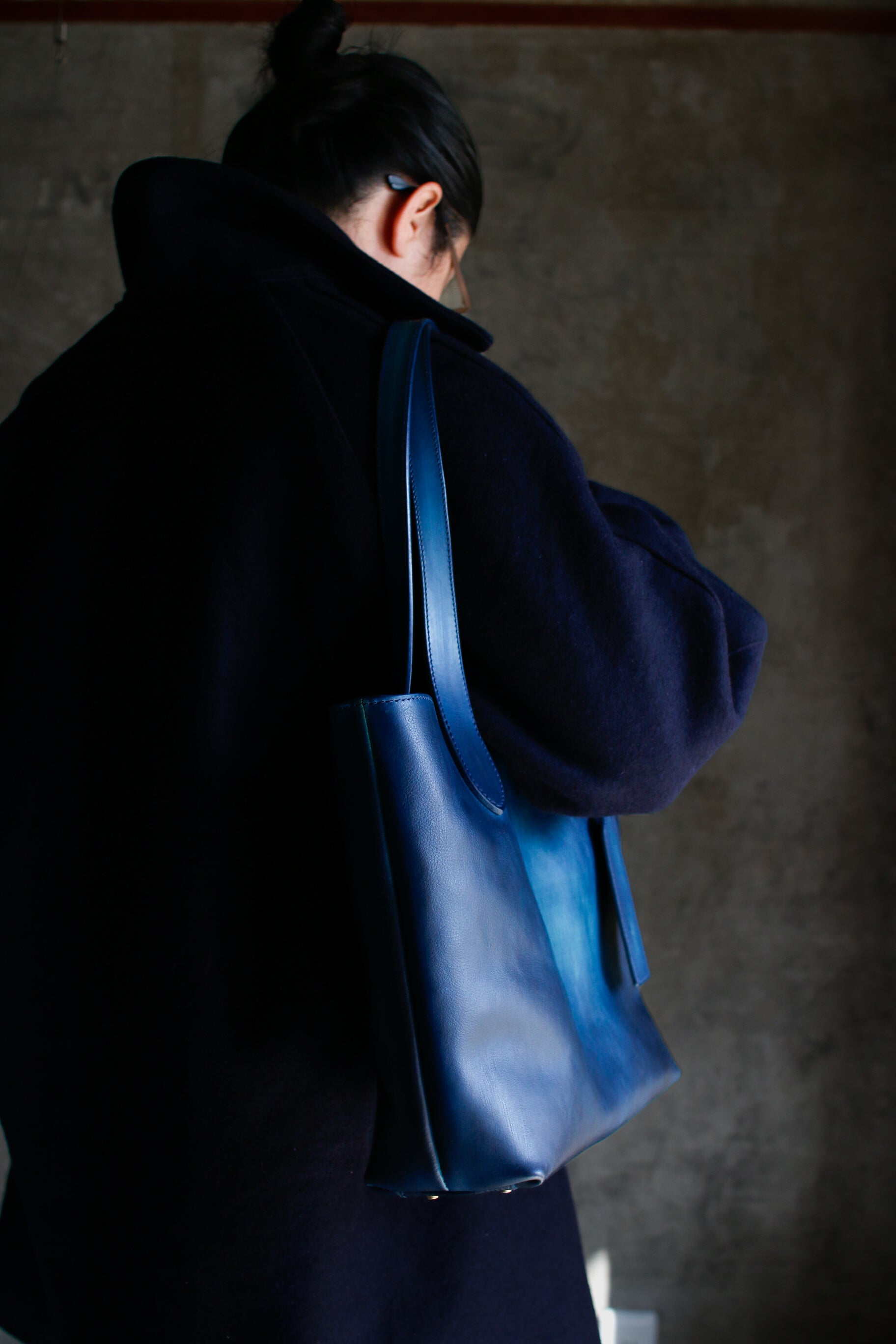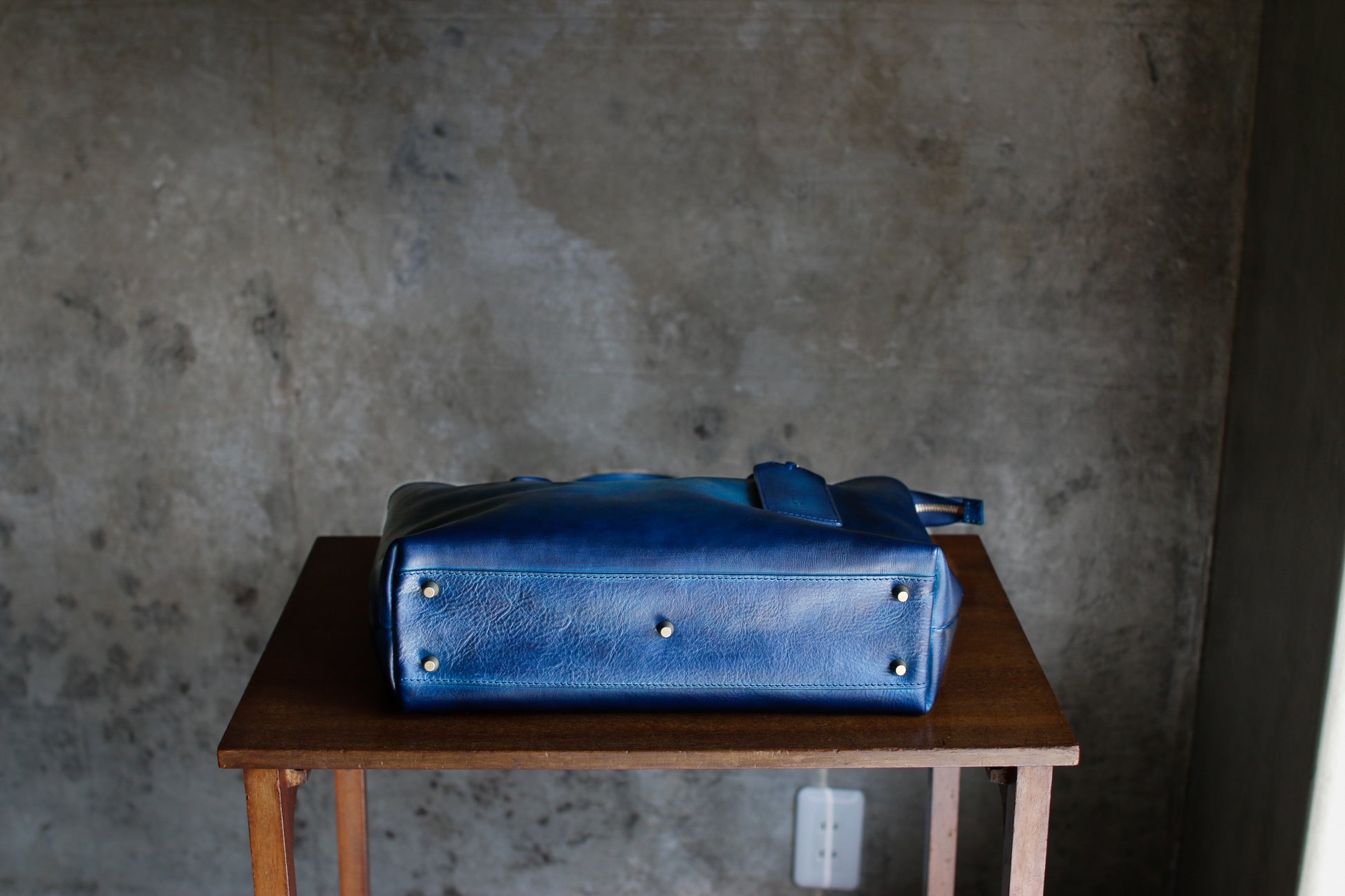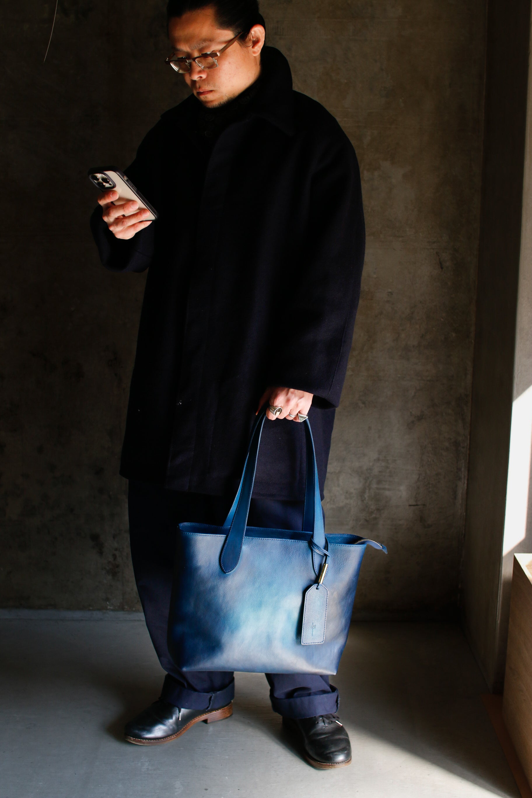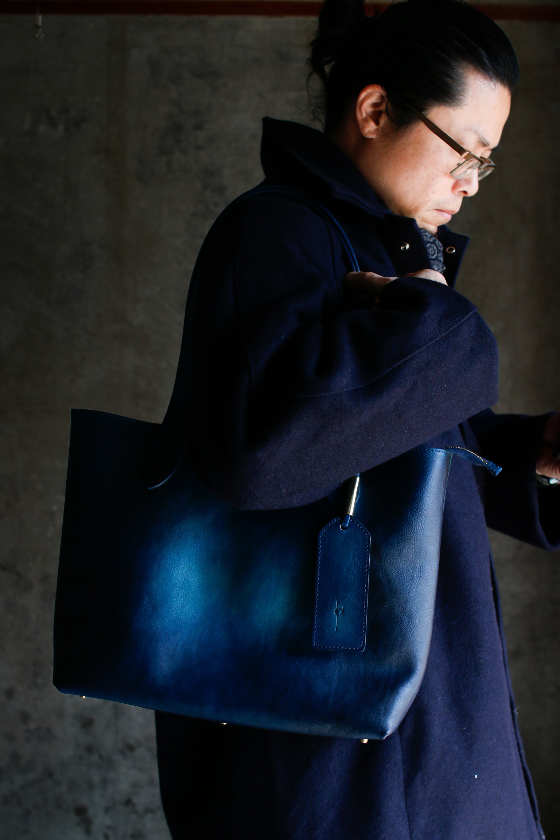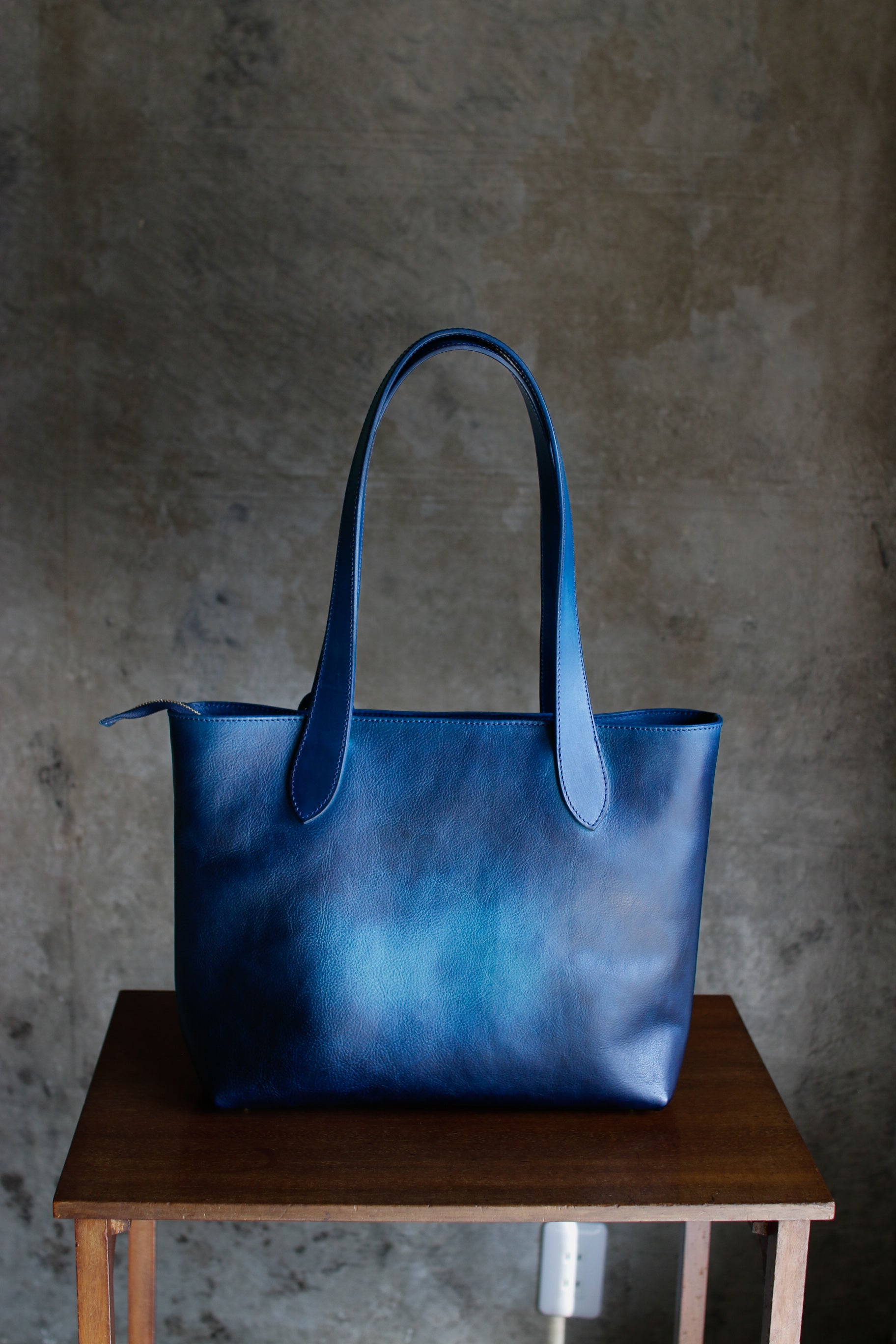 ブルーのグラデーションが目を惹くハンドダイのトートバッグ。