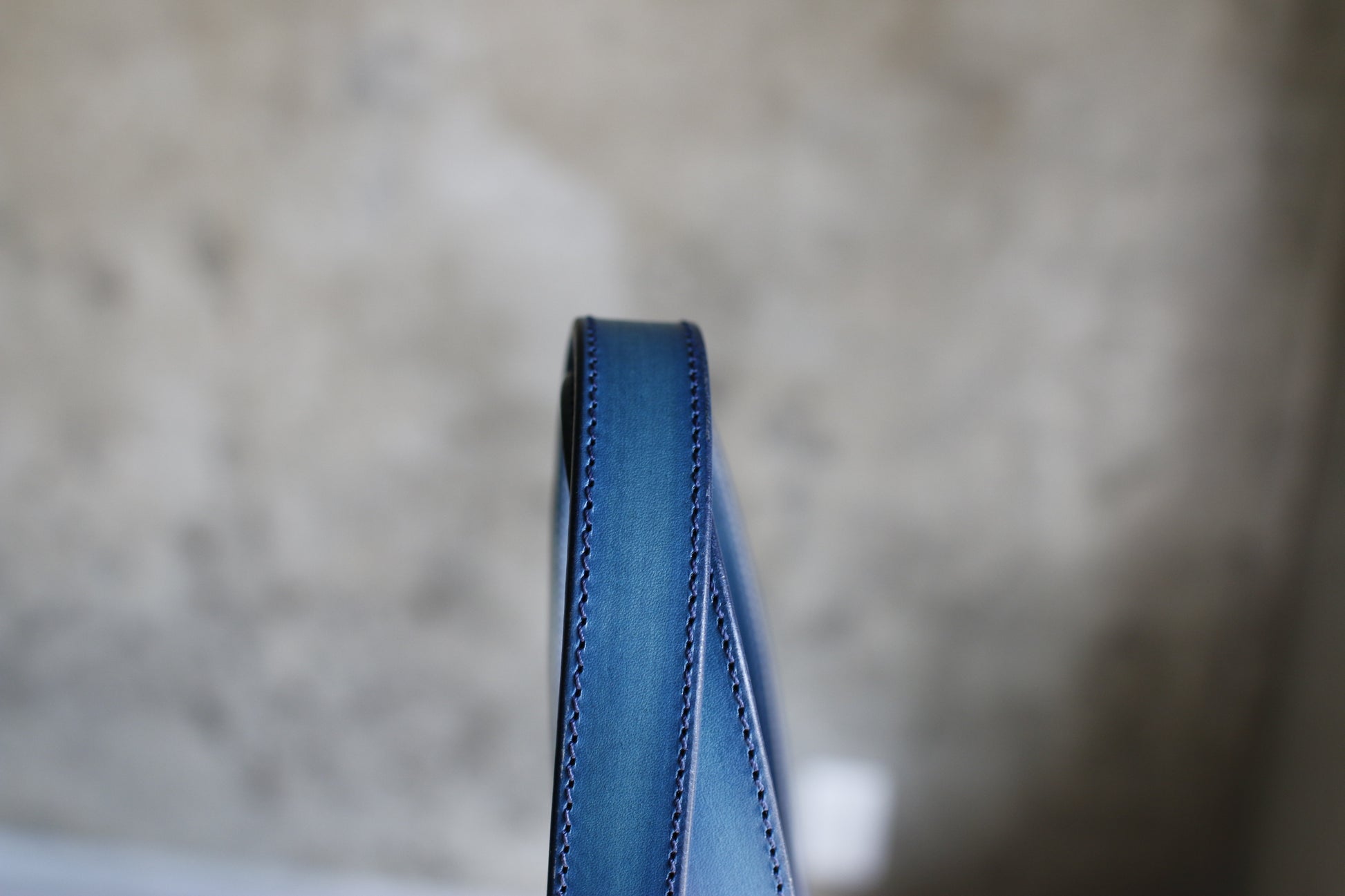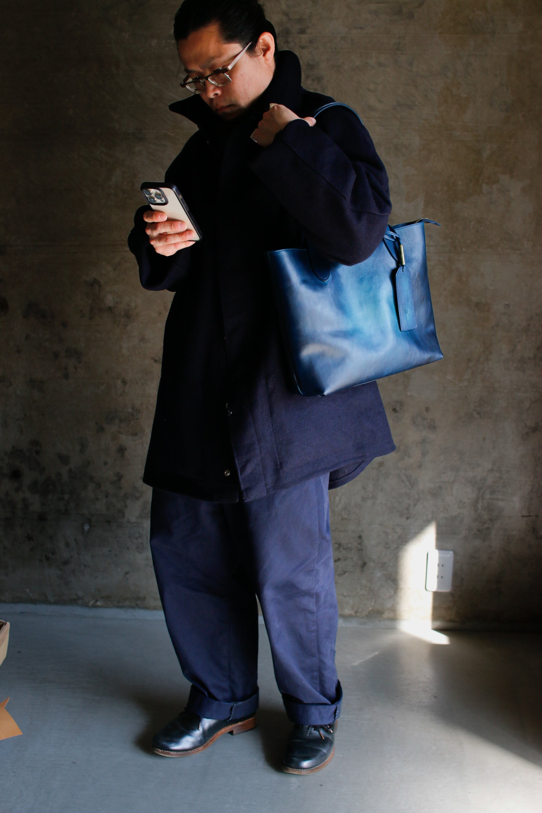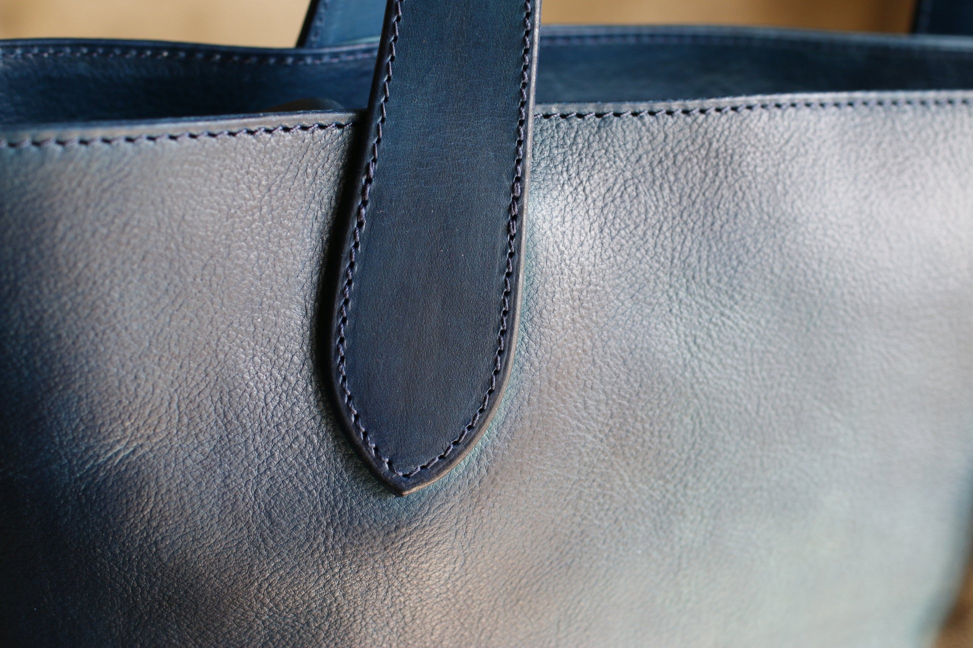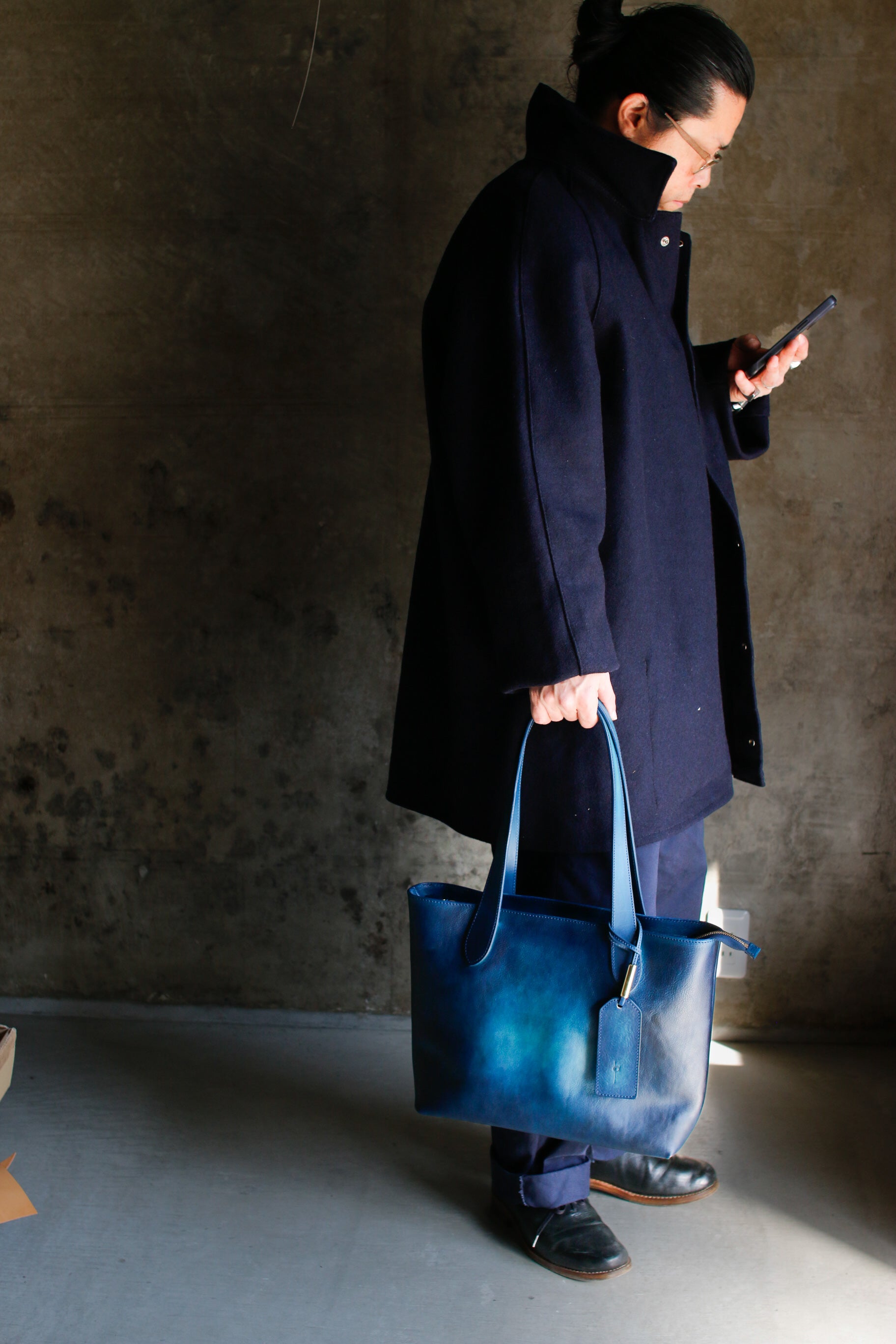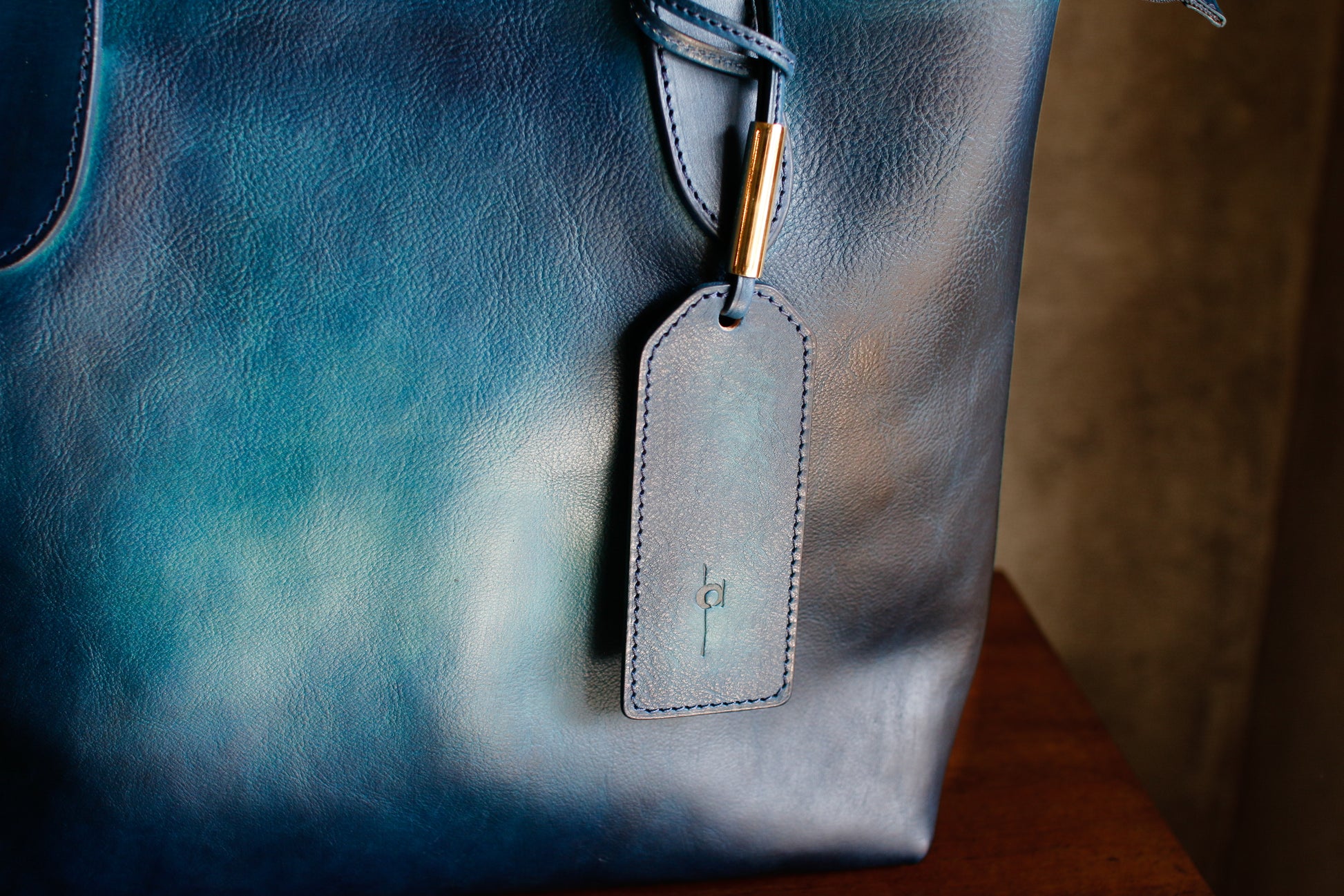 ブルーのグラデーションが目を惹くハンドダイのトートバッグ。