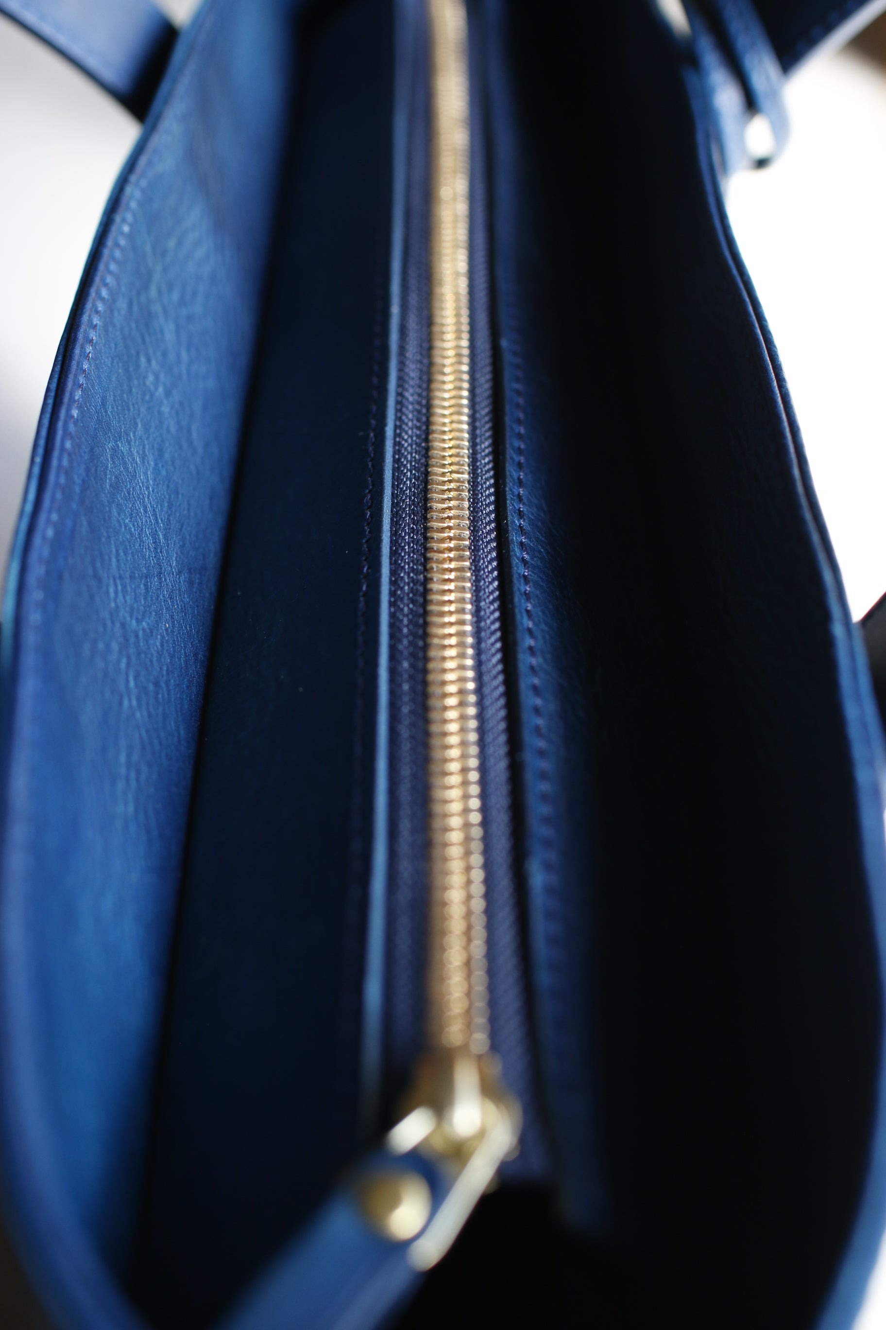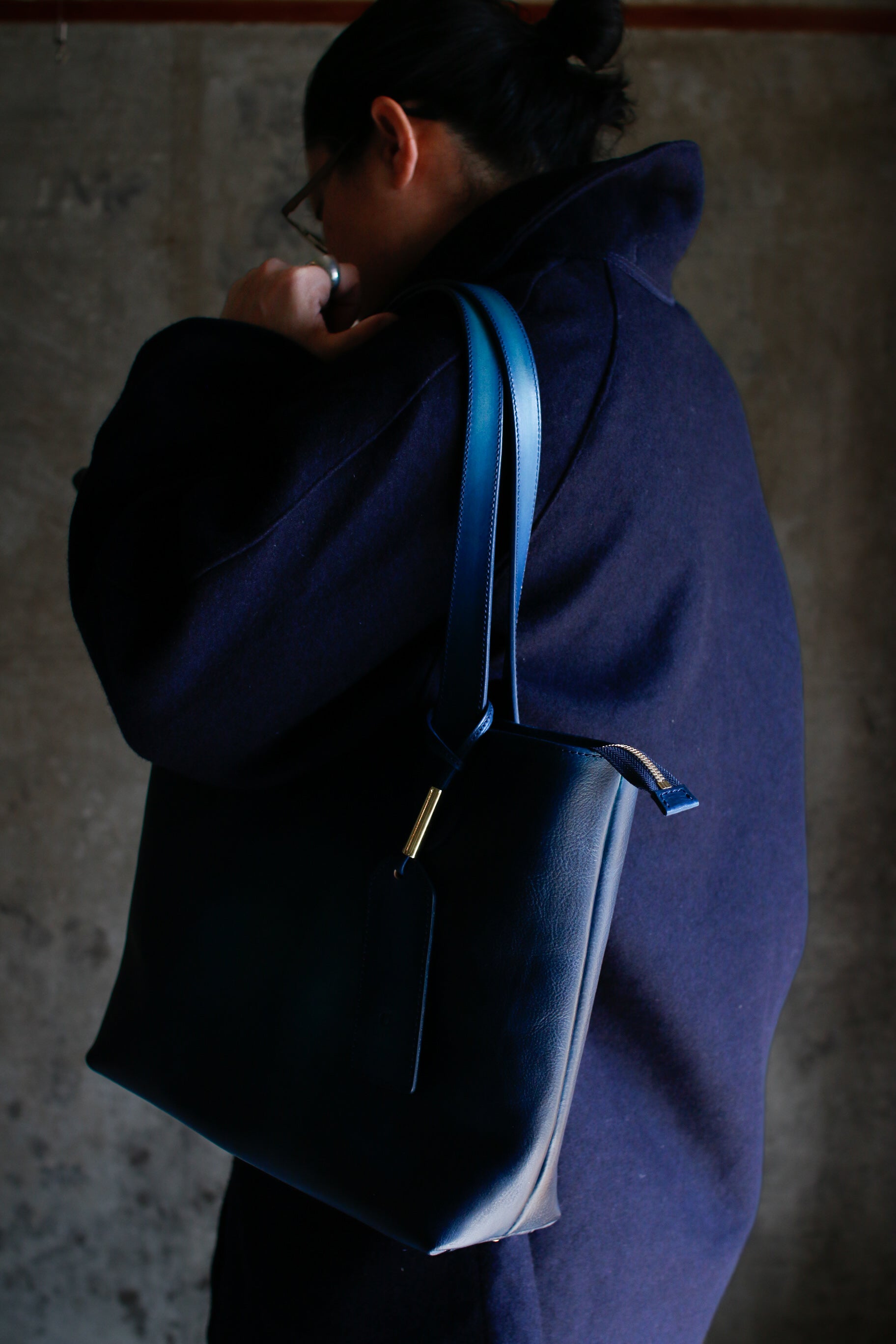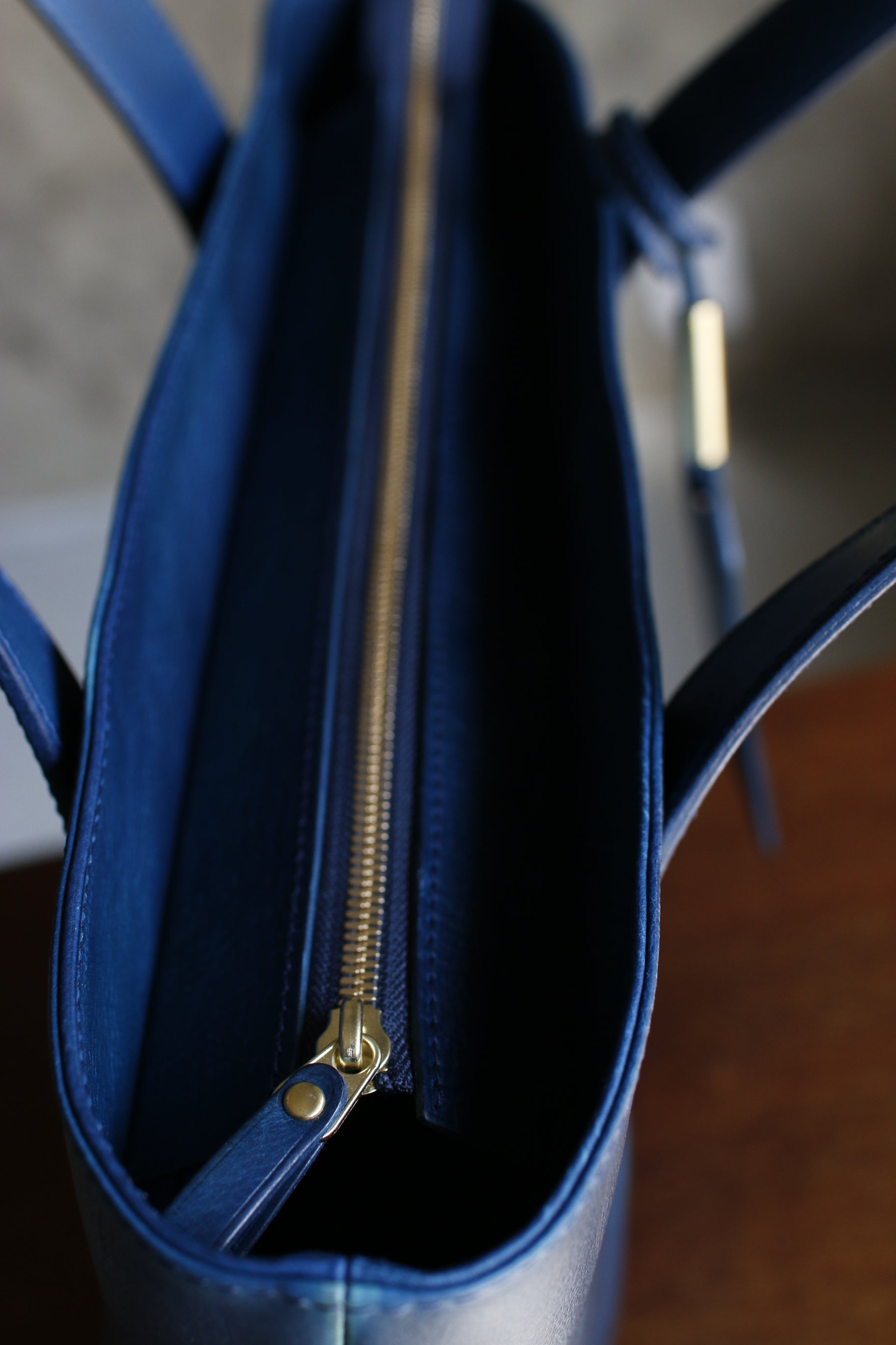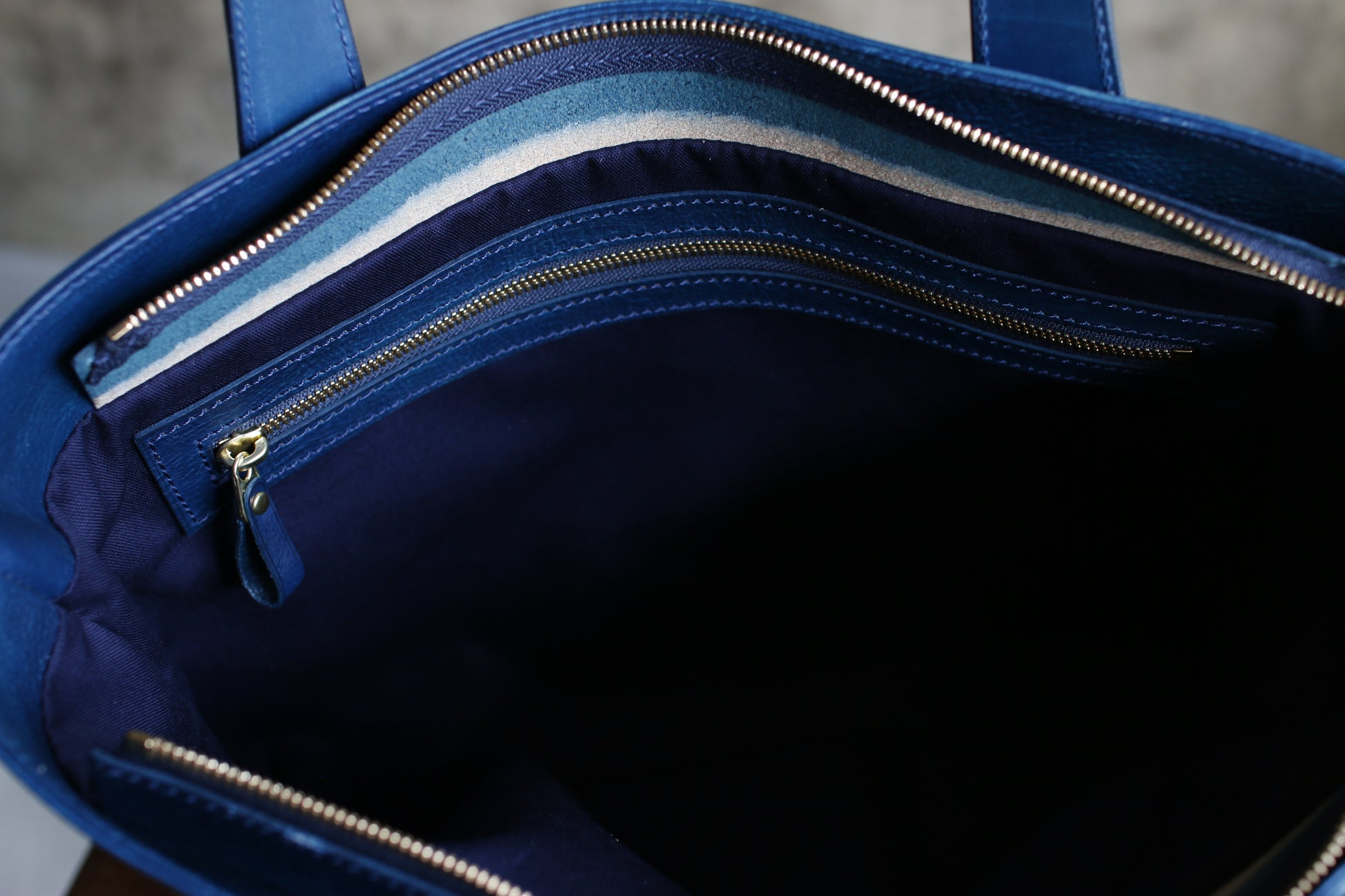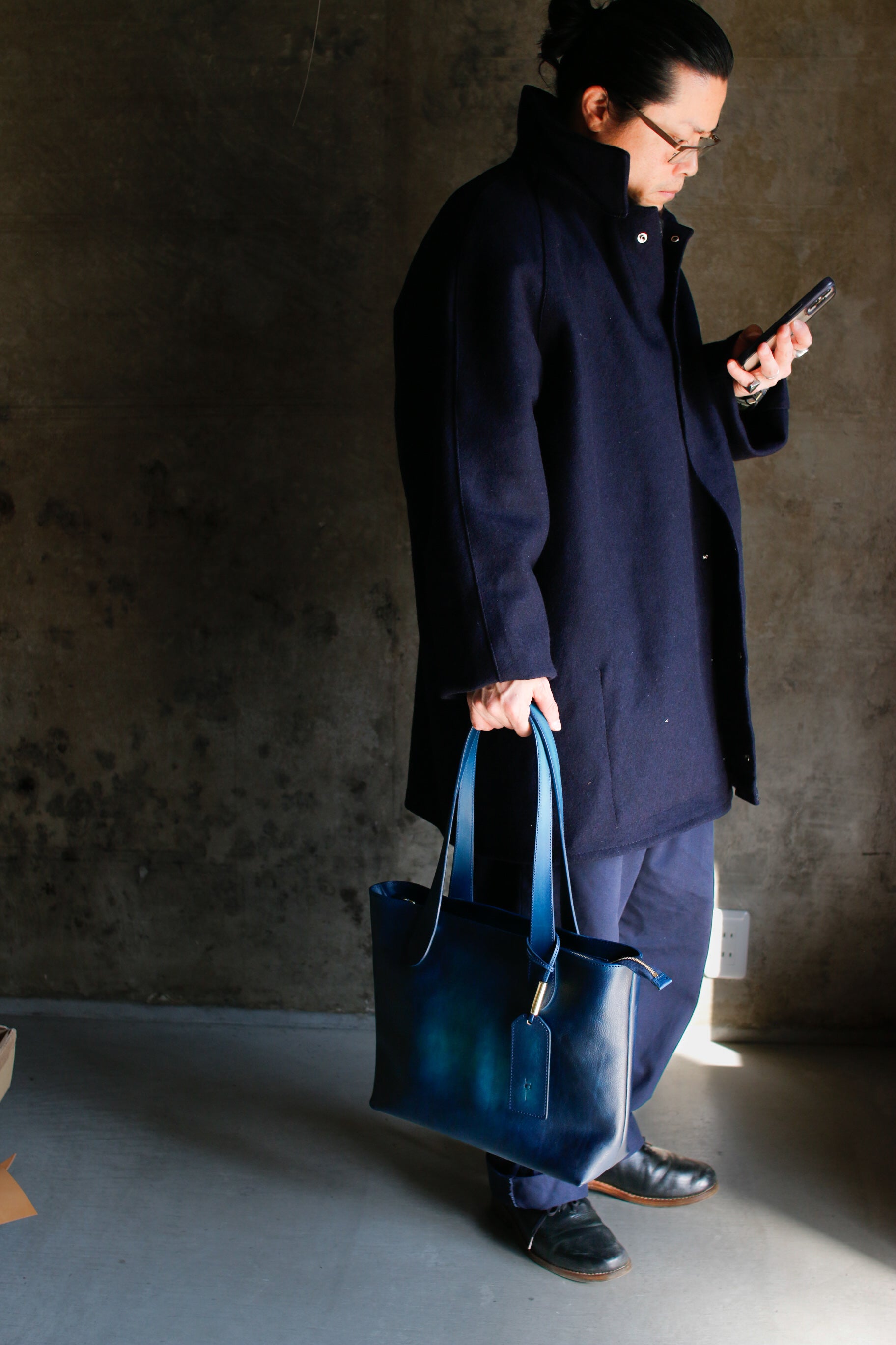 ブルーのグラデーションが目を惹くハンドダイのトートバッグ。